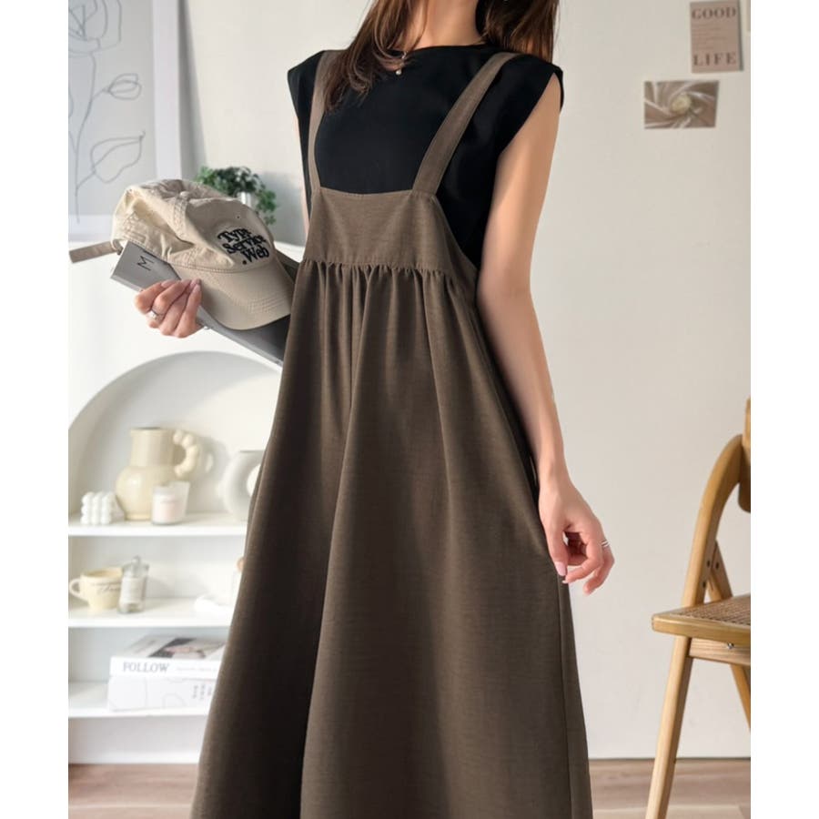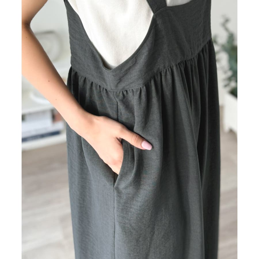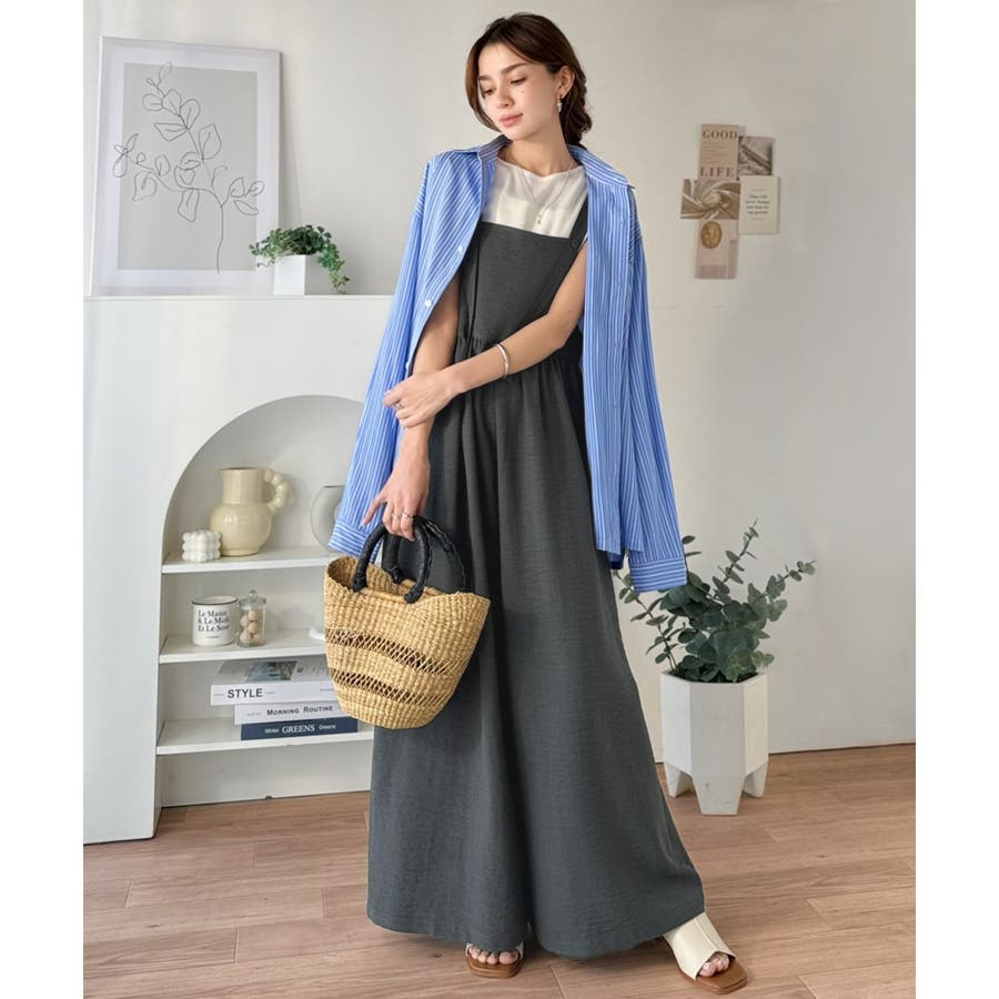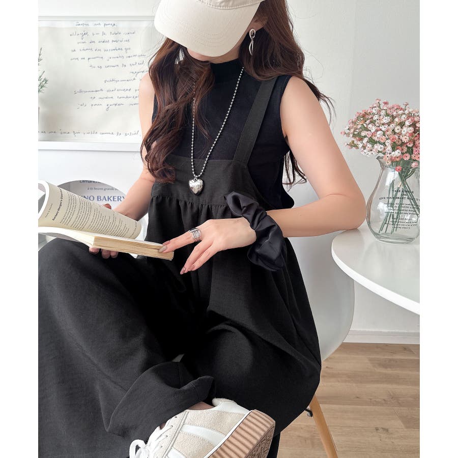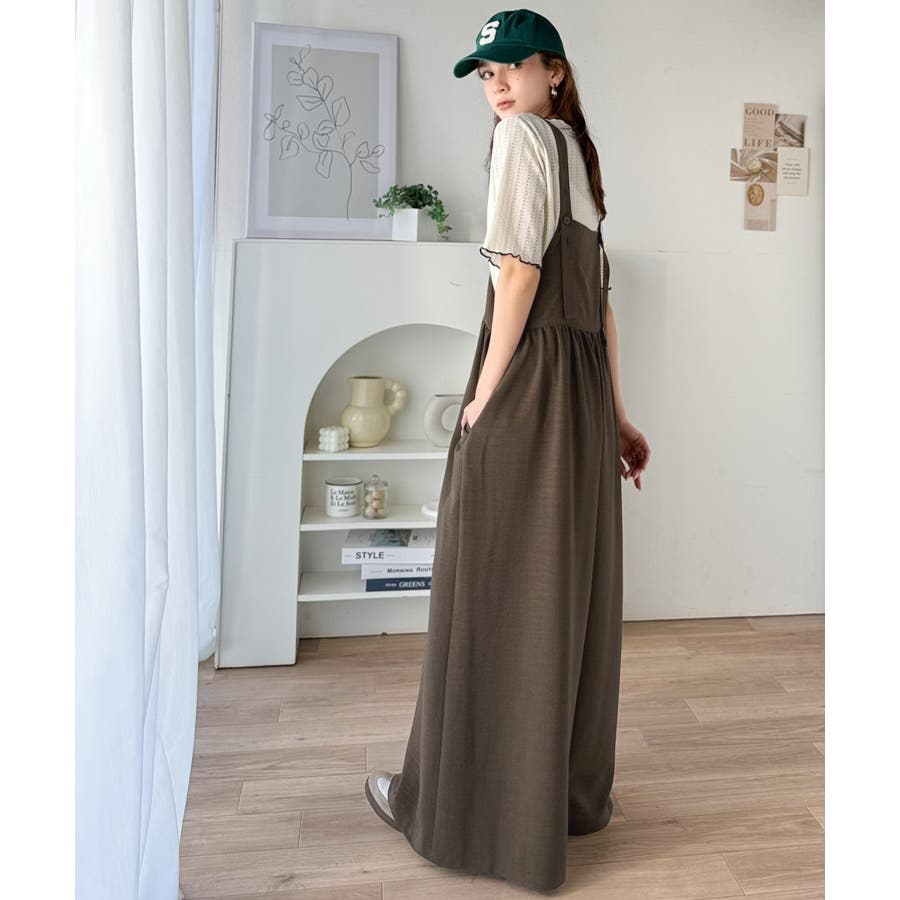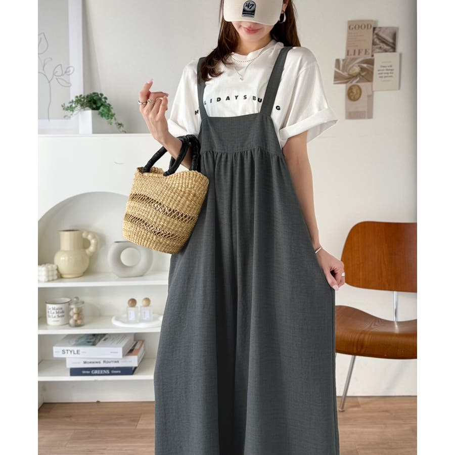 ハイウエストデザインで脚長効果を実現したこのワイドスカパンサロペットは