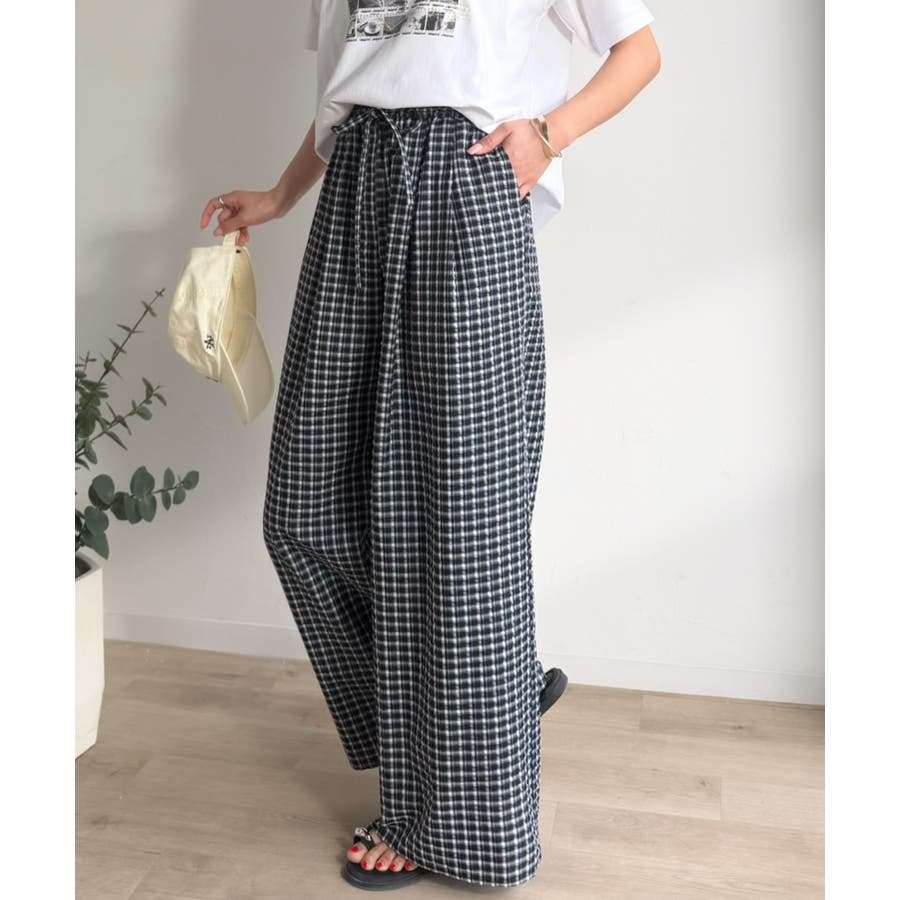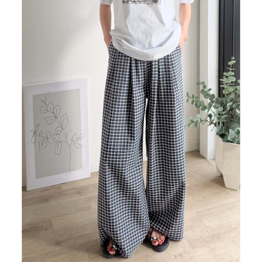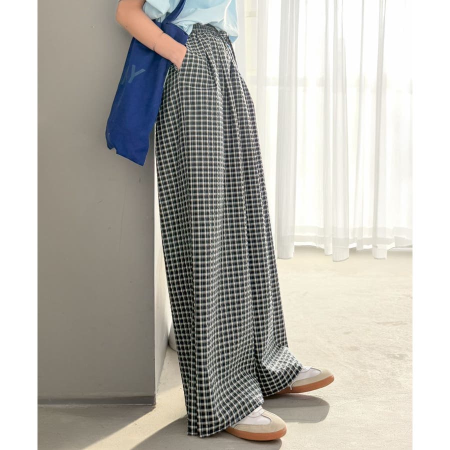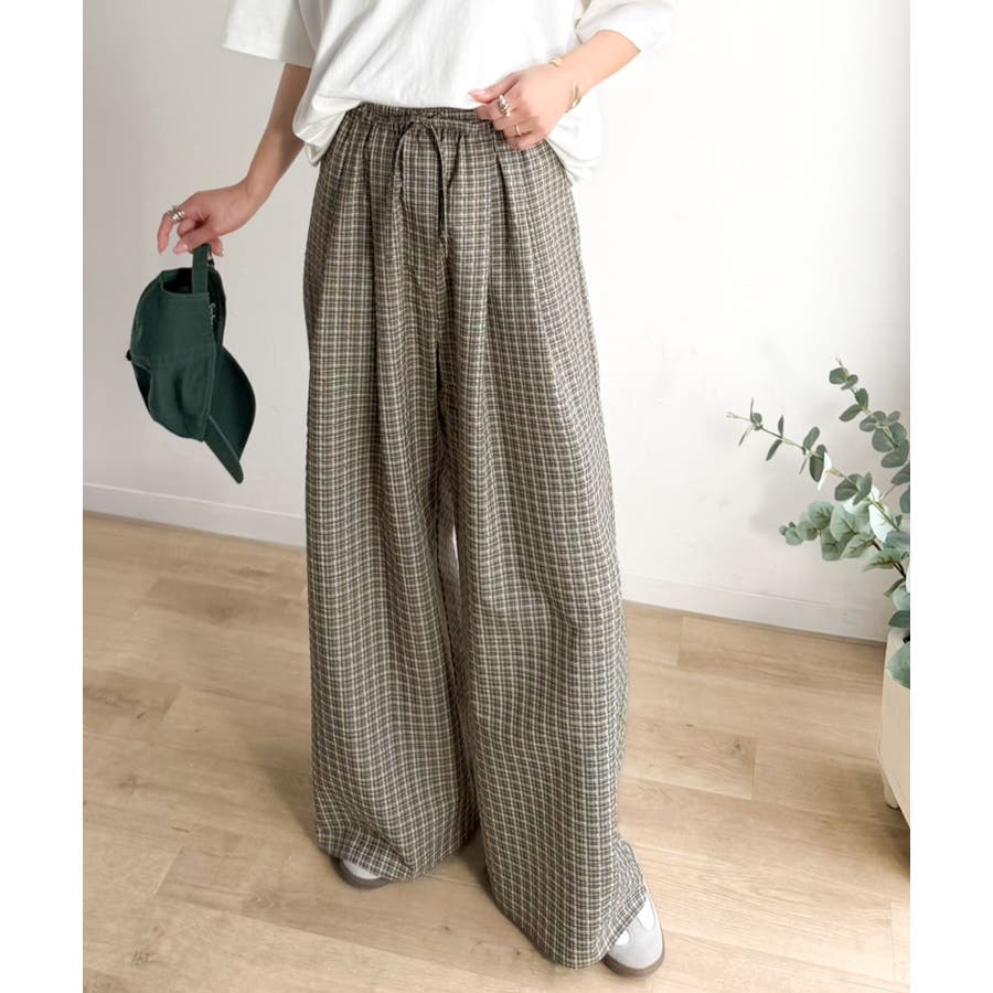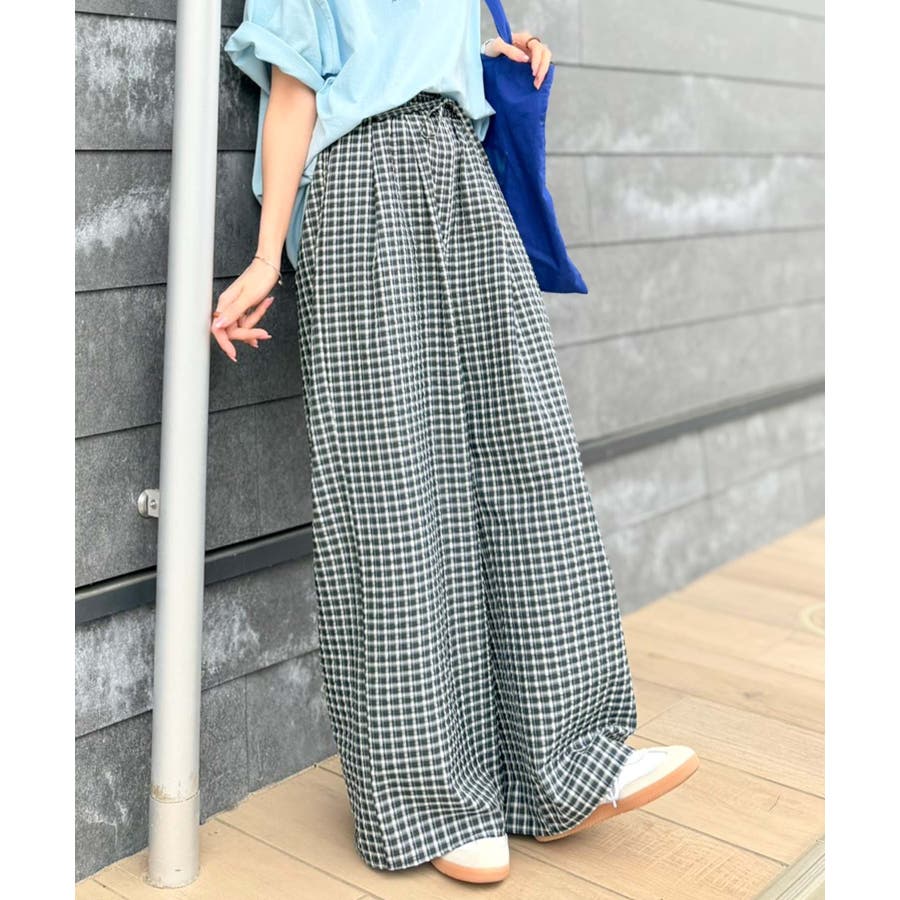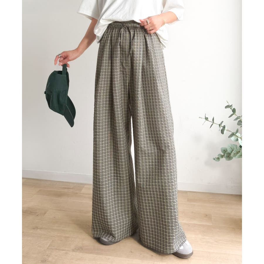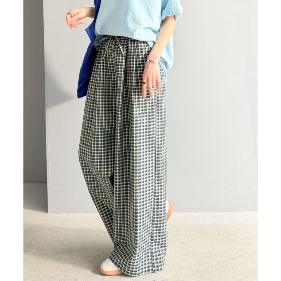 履くだけでお洒落見え。涼しげ素材で魅せる。サッカーチェックタックワイドパンツ