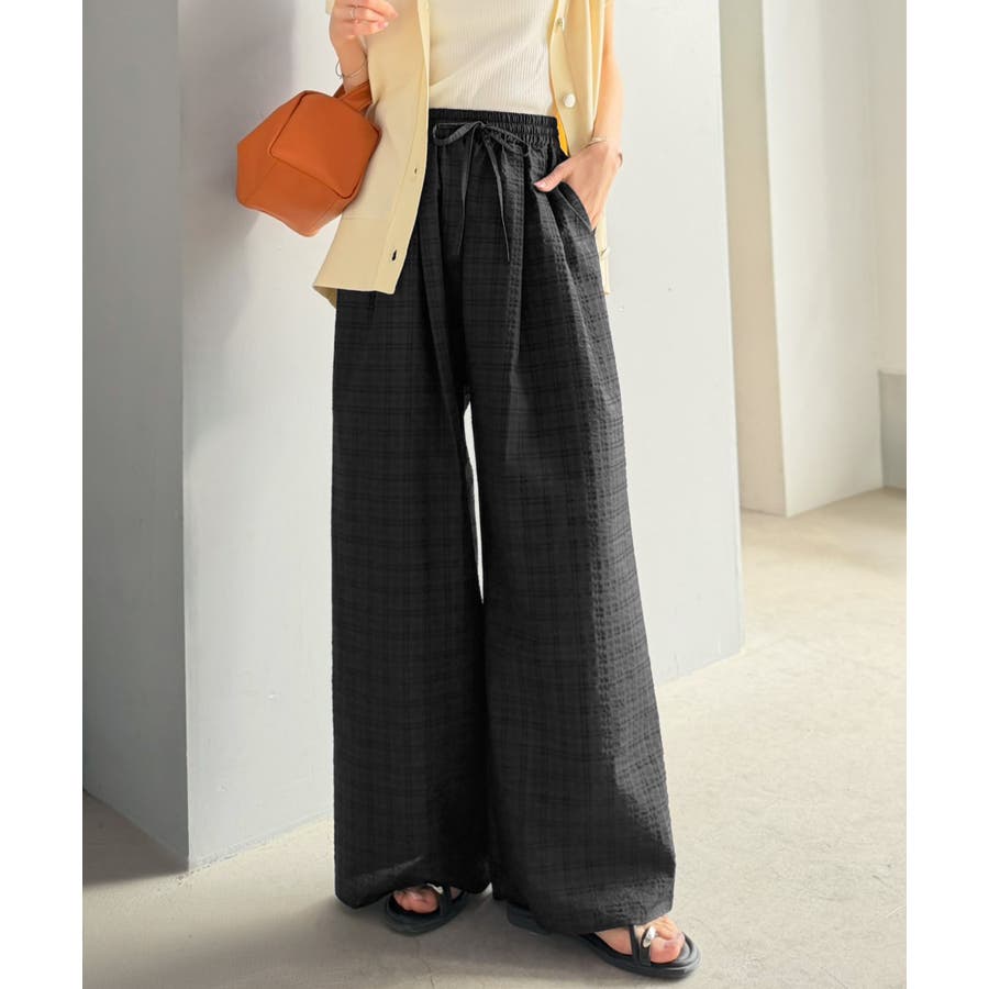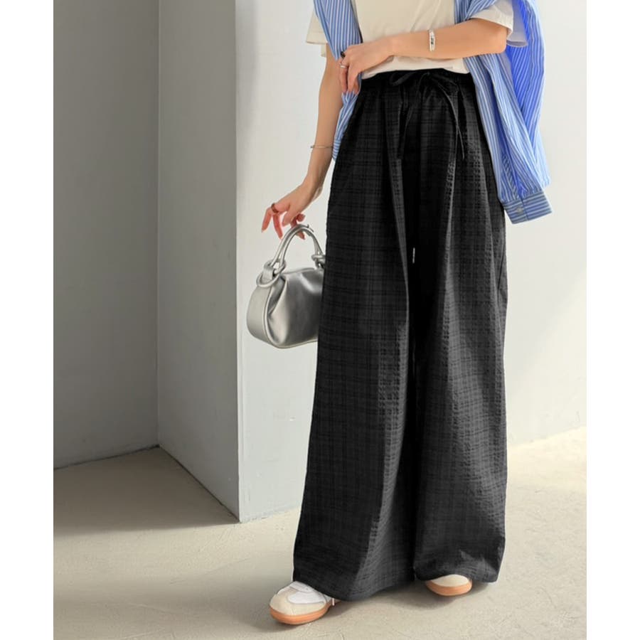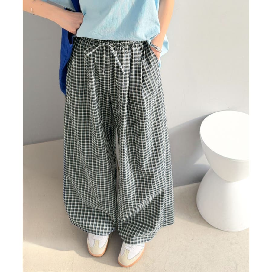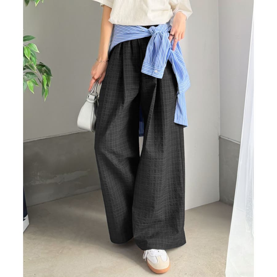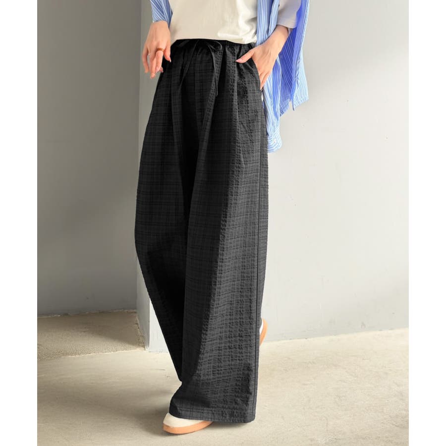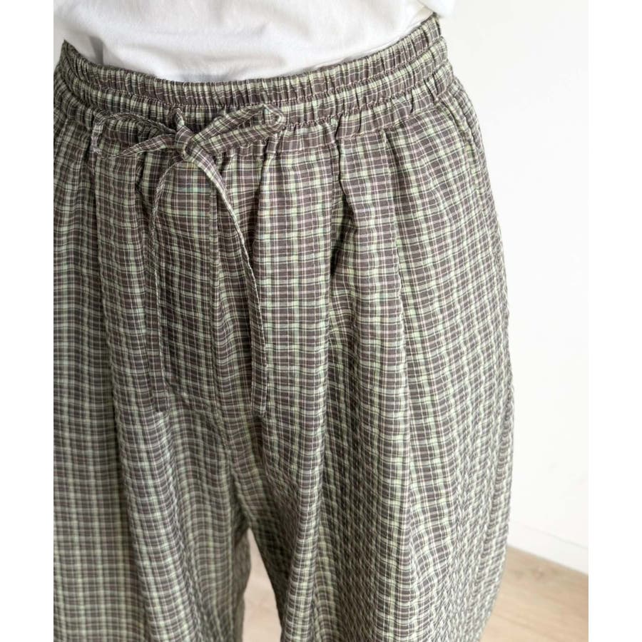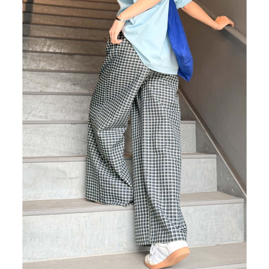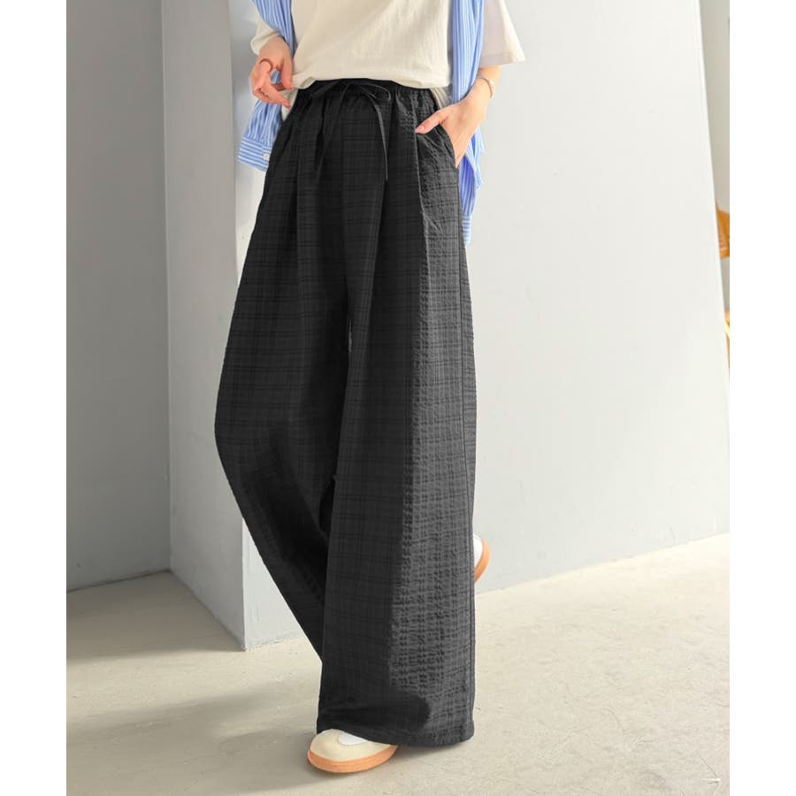 履くだけでお洒落見え。涼しげ素材で魅せる。サッカーチェックタックワイドパンツ
