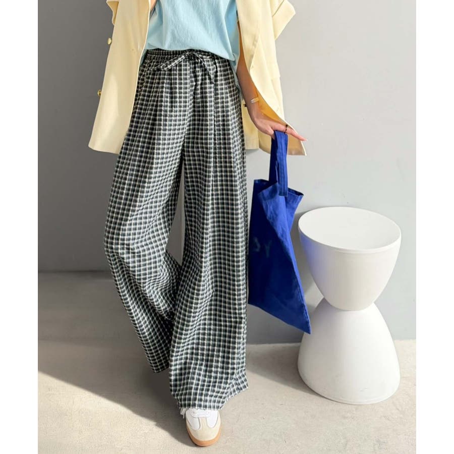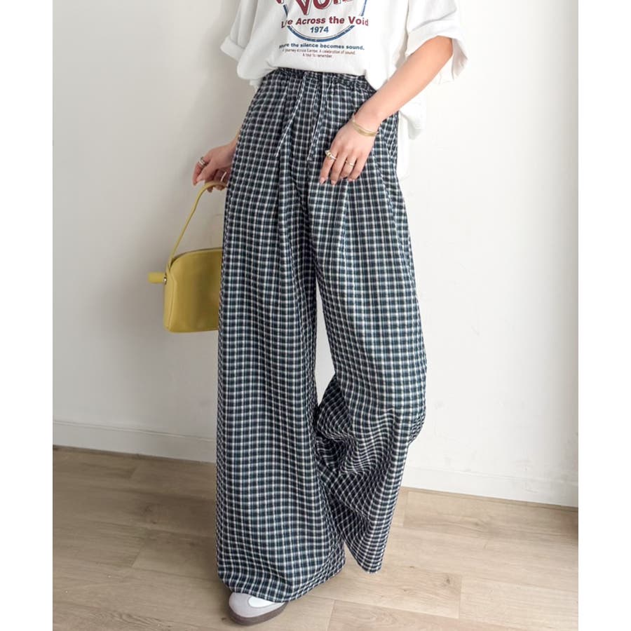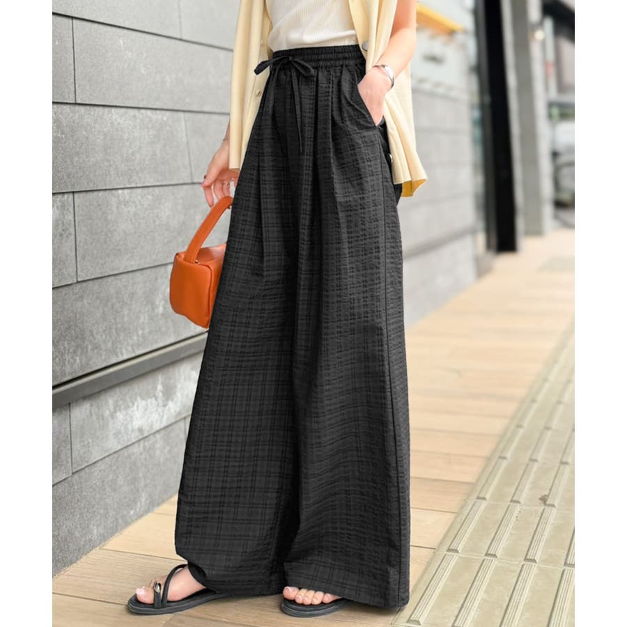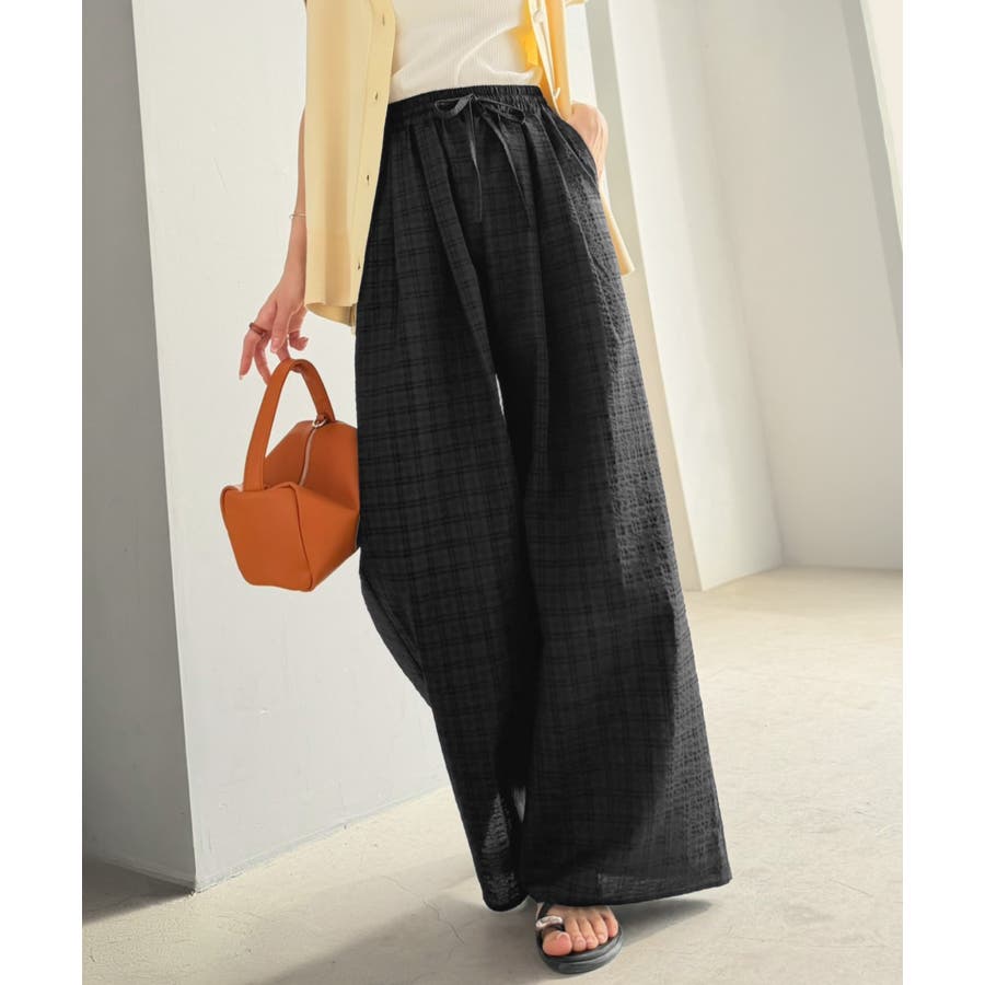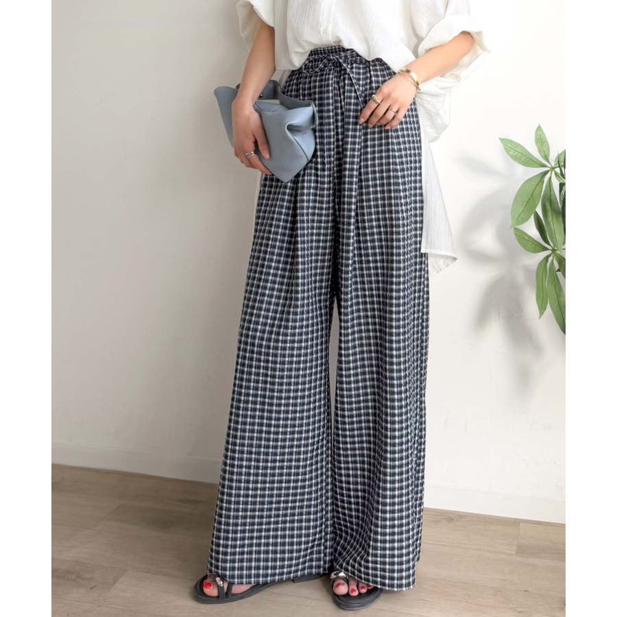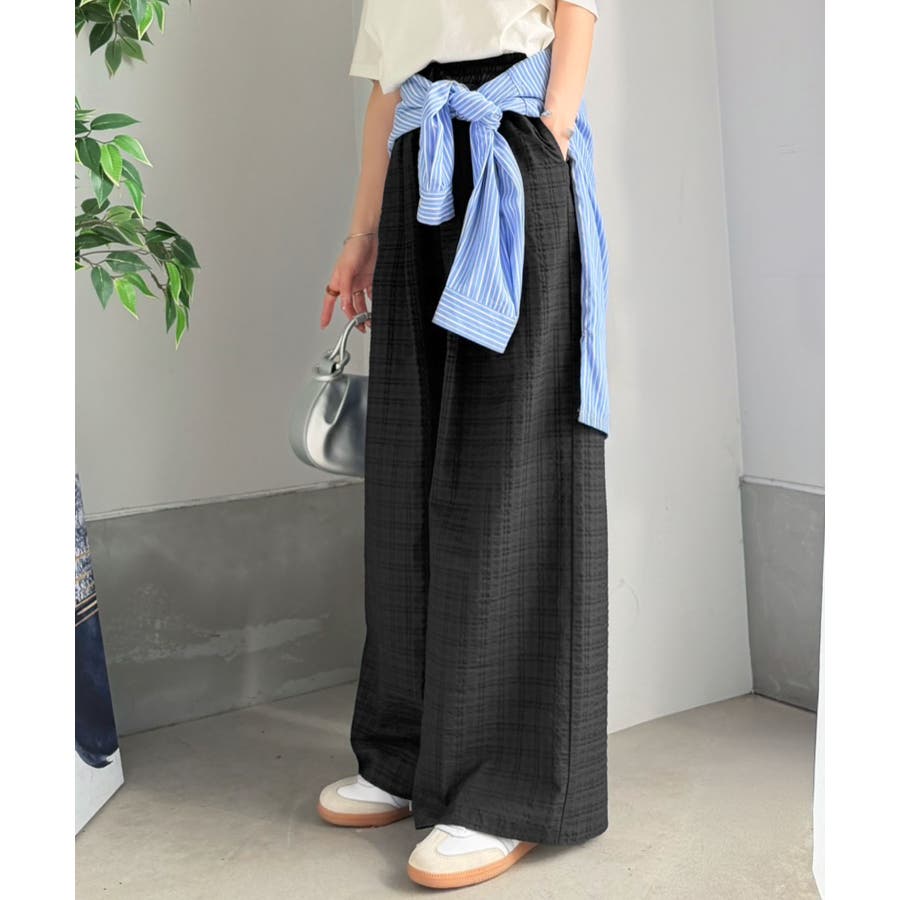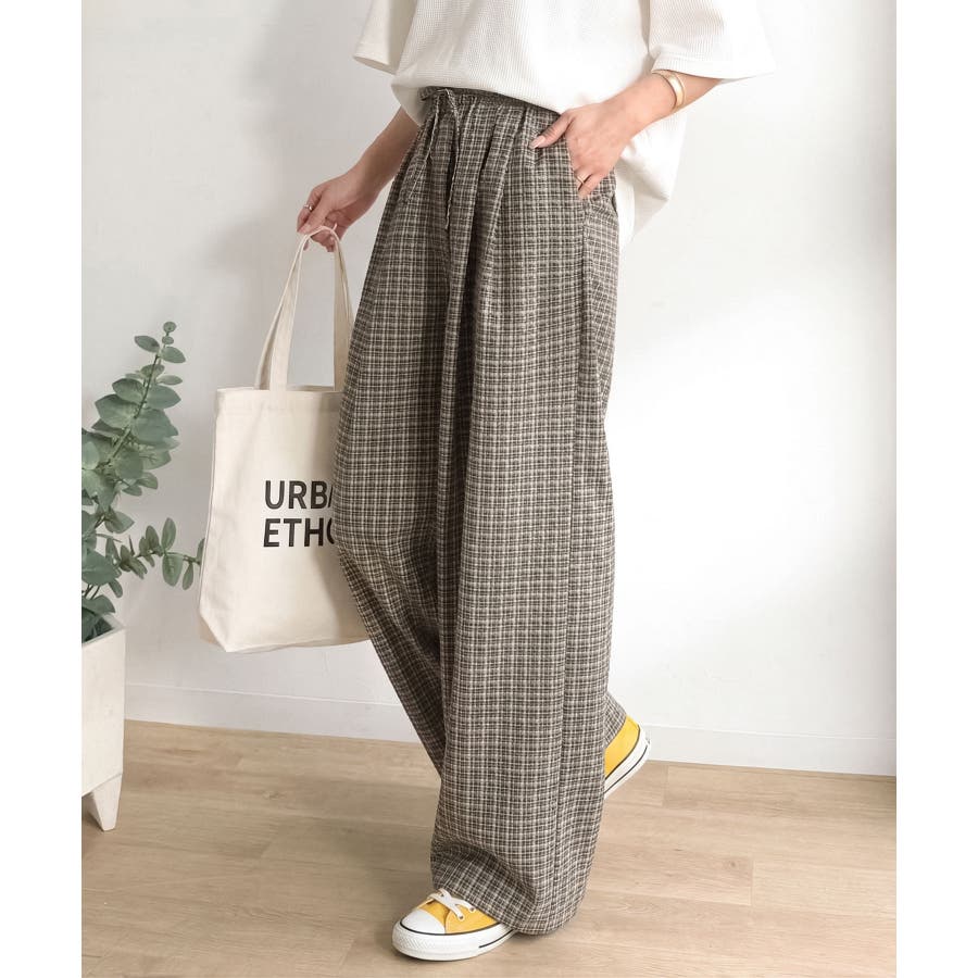 履くだけでお洒落見え。涼しげ素材で魅せる。サッカーチェックタックワイドパンツ