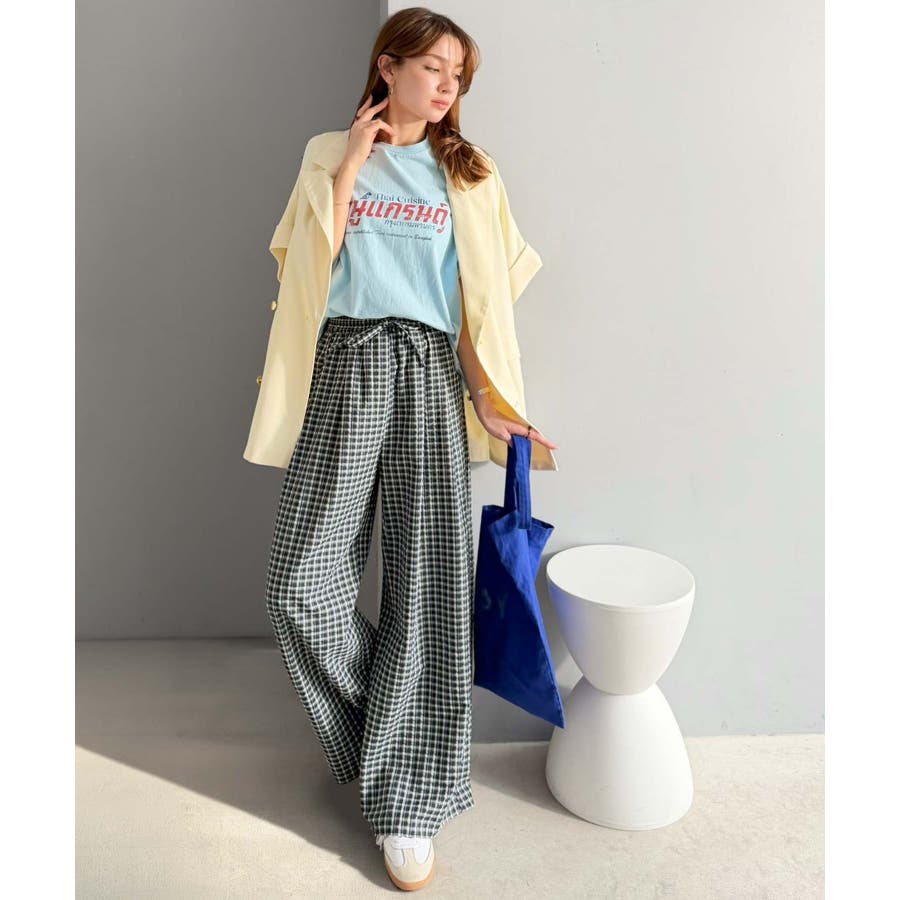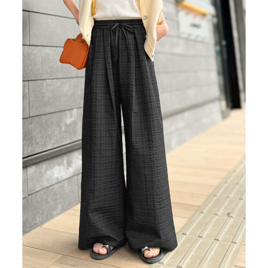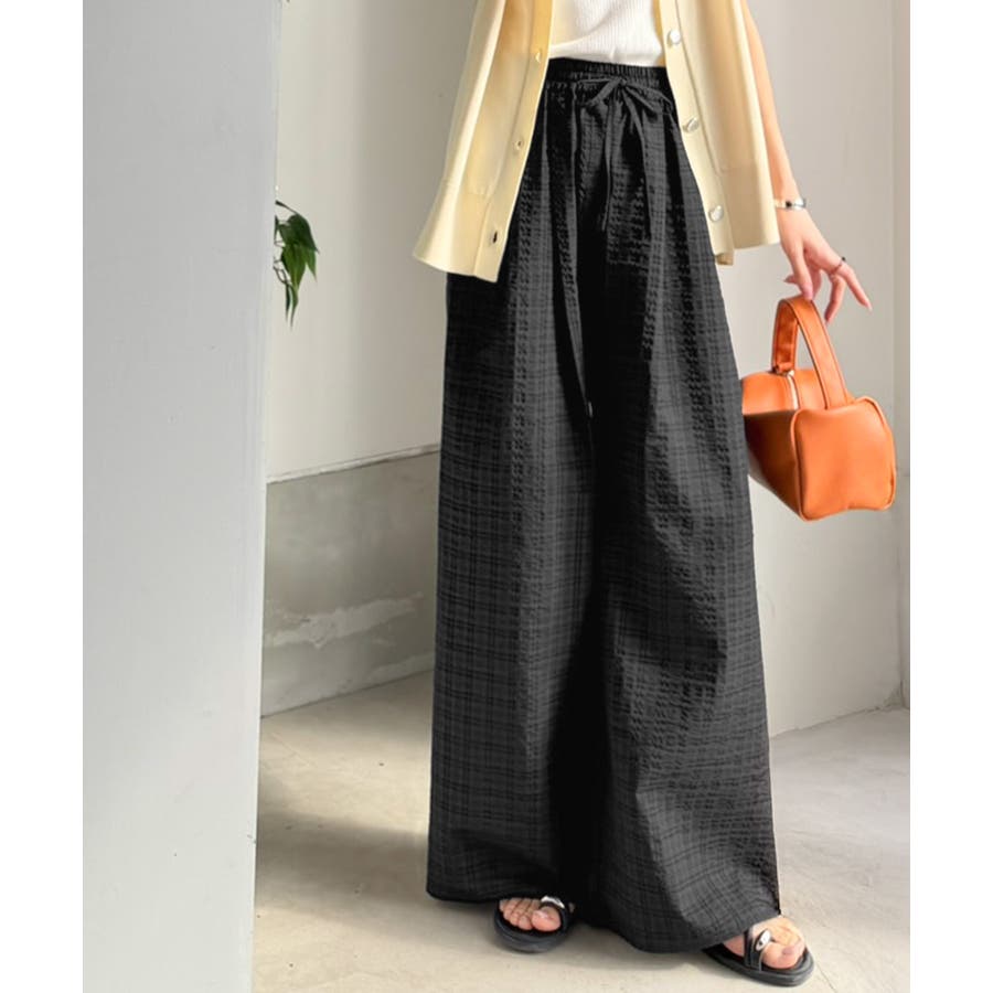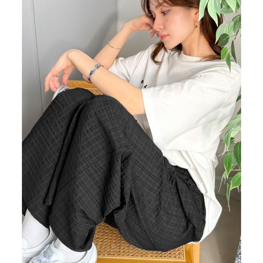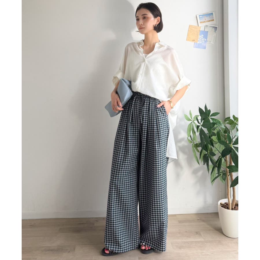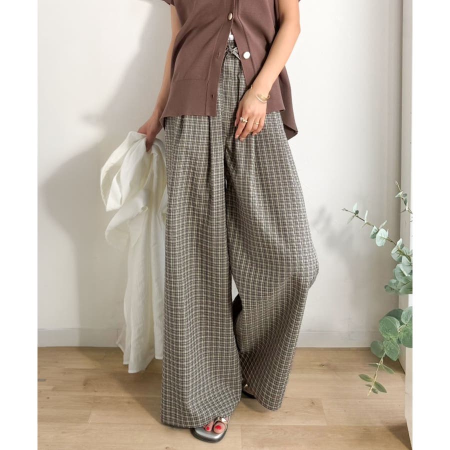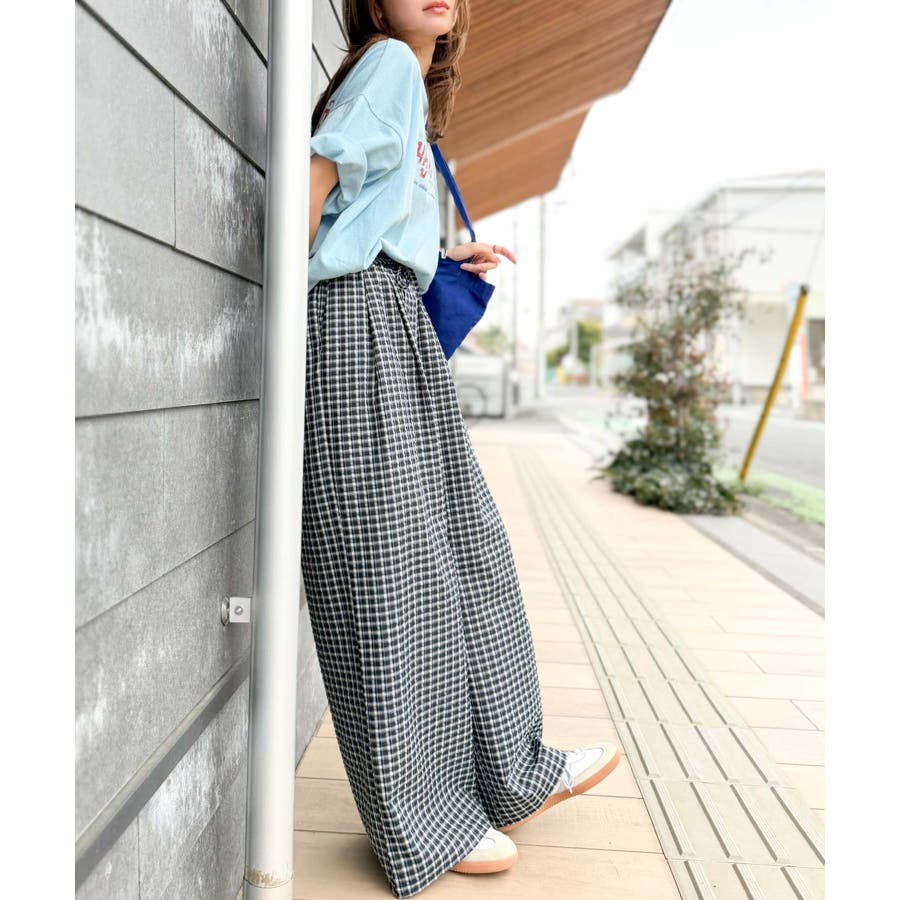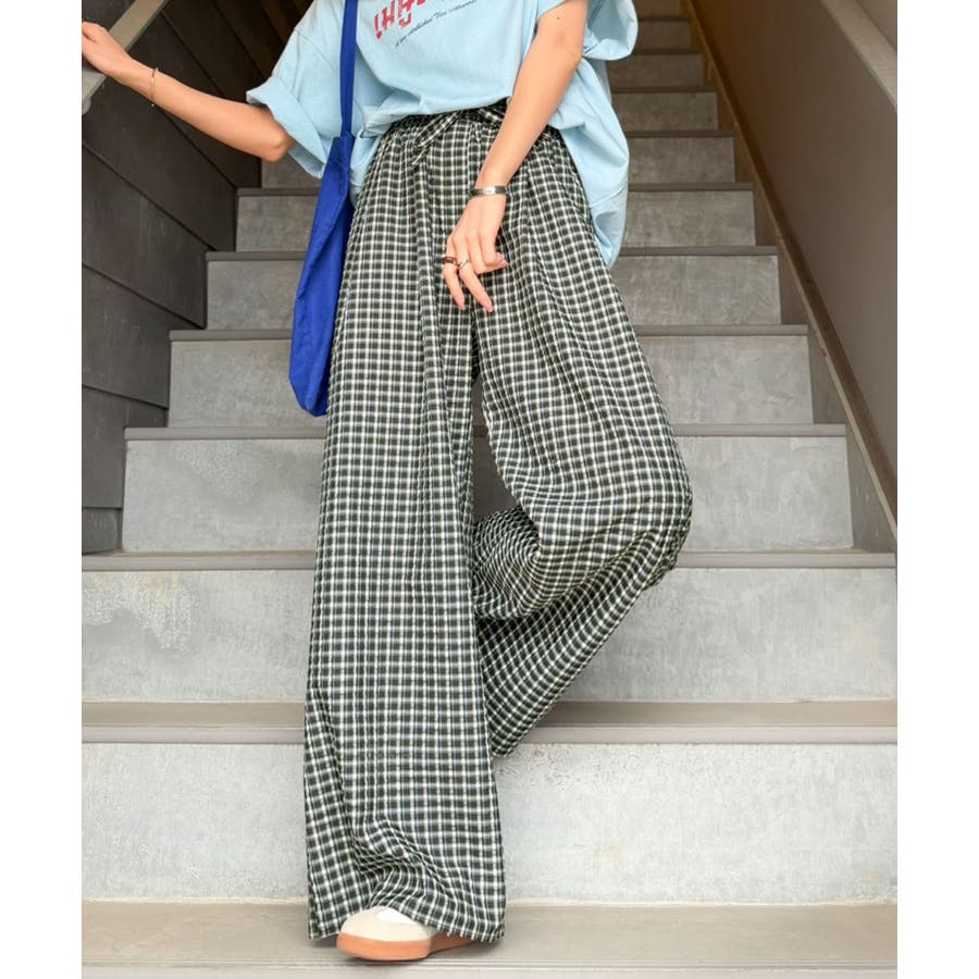 履くだけでお洒落見え。涼しげ素材で魅せる。サッカーチェックタックワイドパンツ