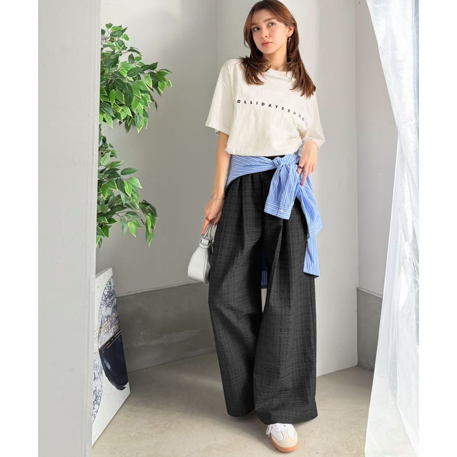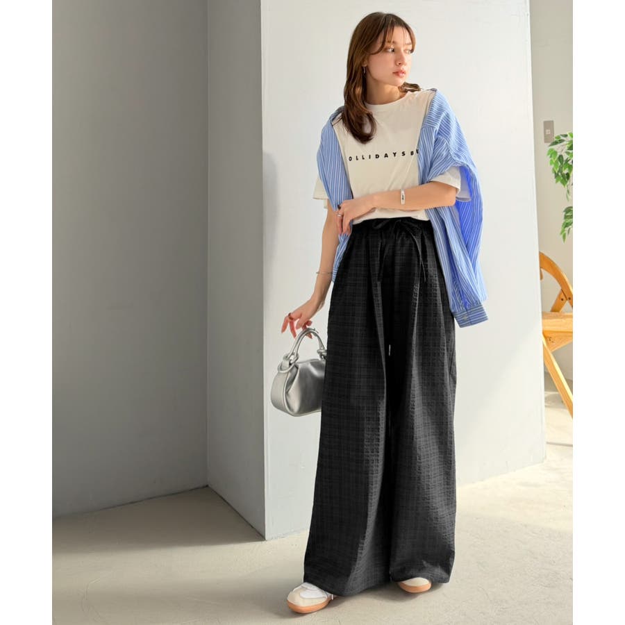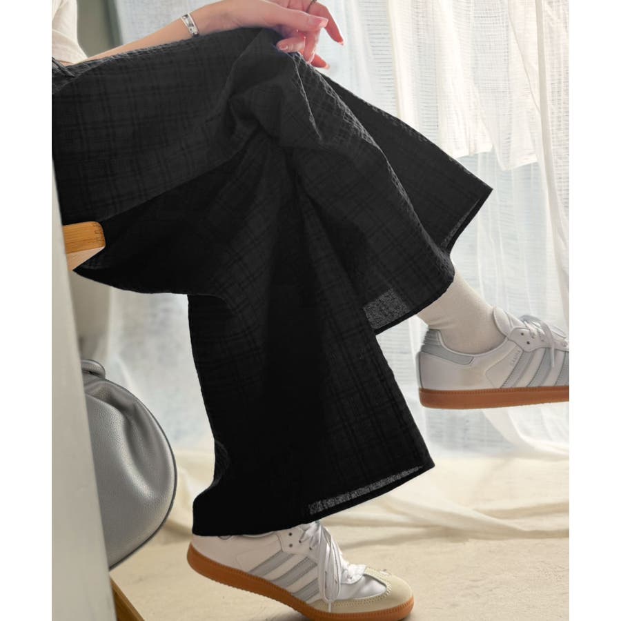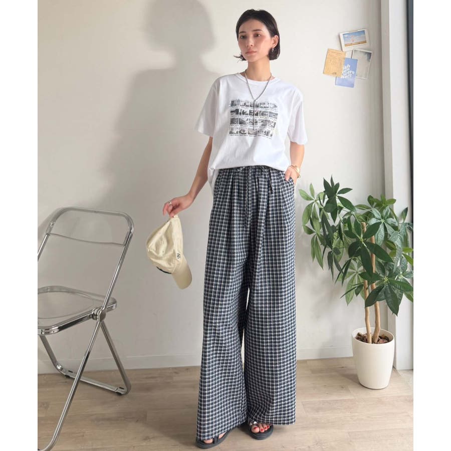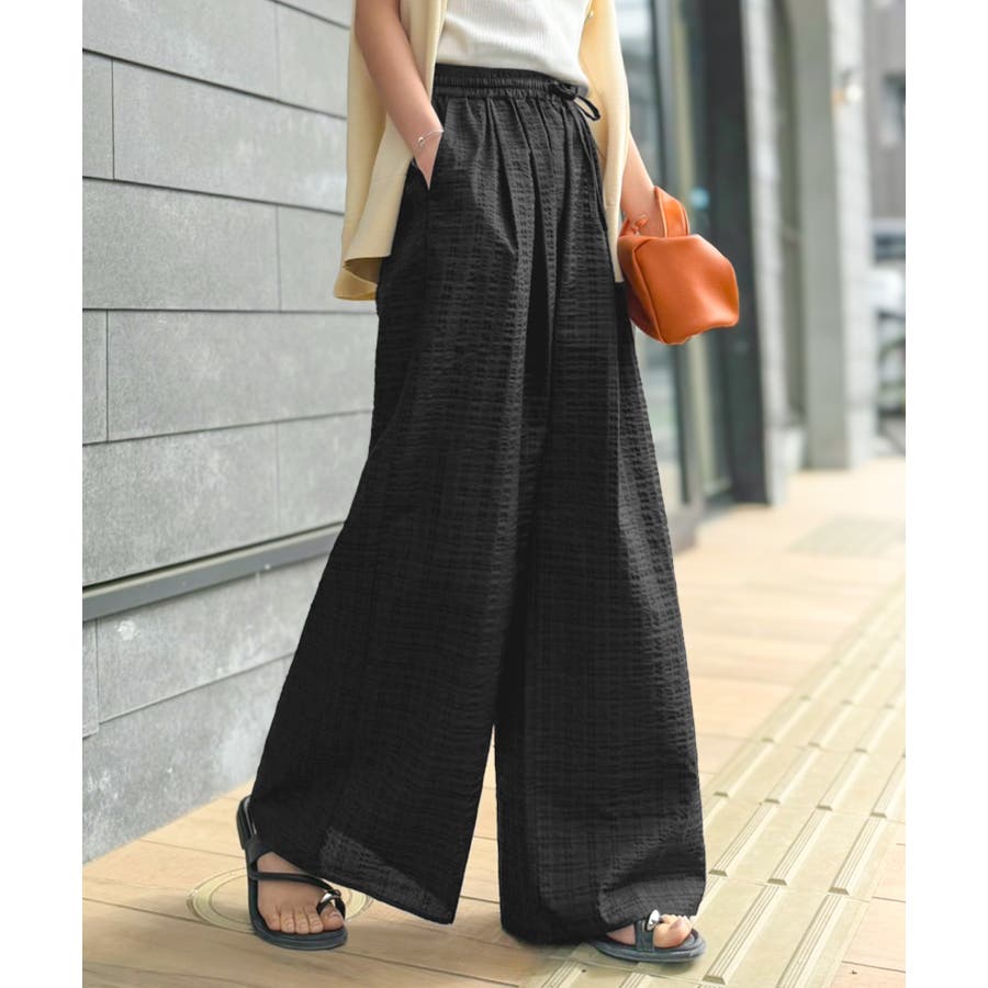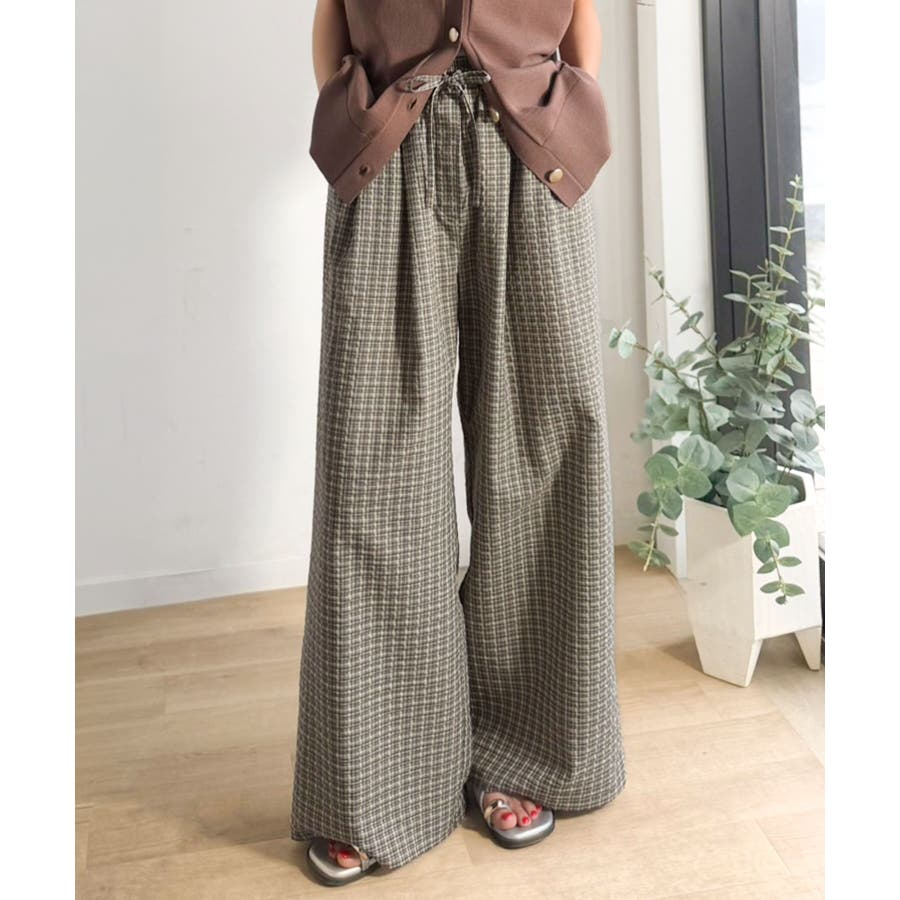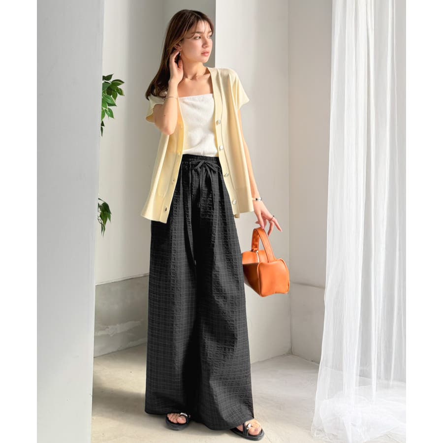 履くだけでお洒落見え。涼しげ素材で魅せる。サッカーチェックタックワイドパンツ