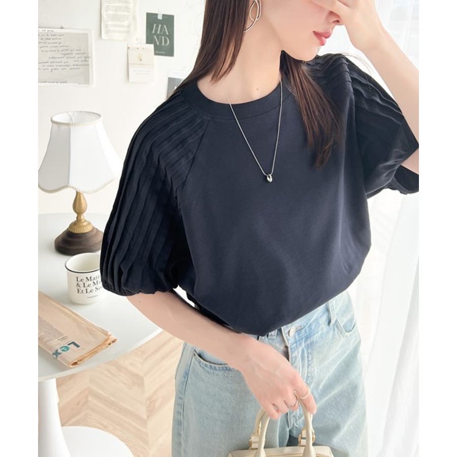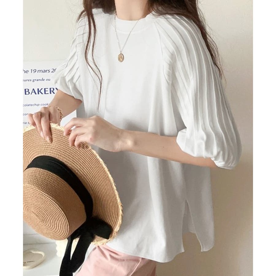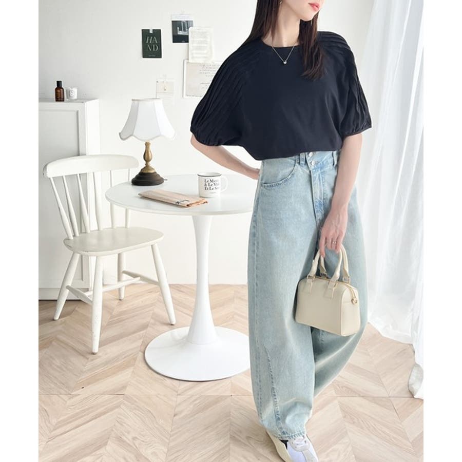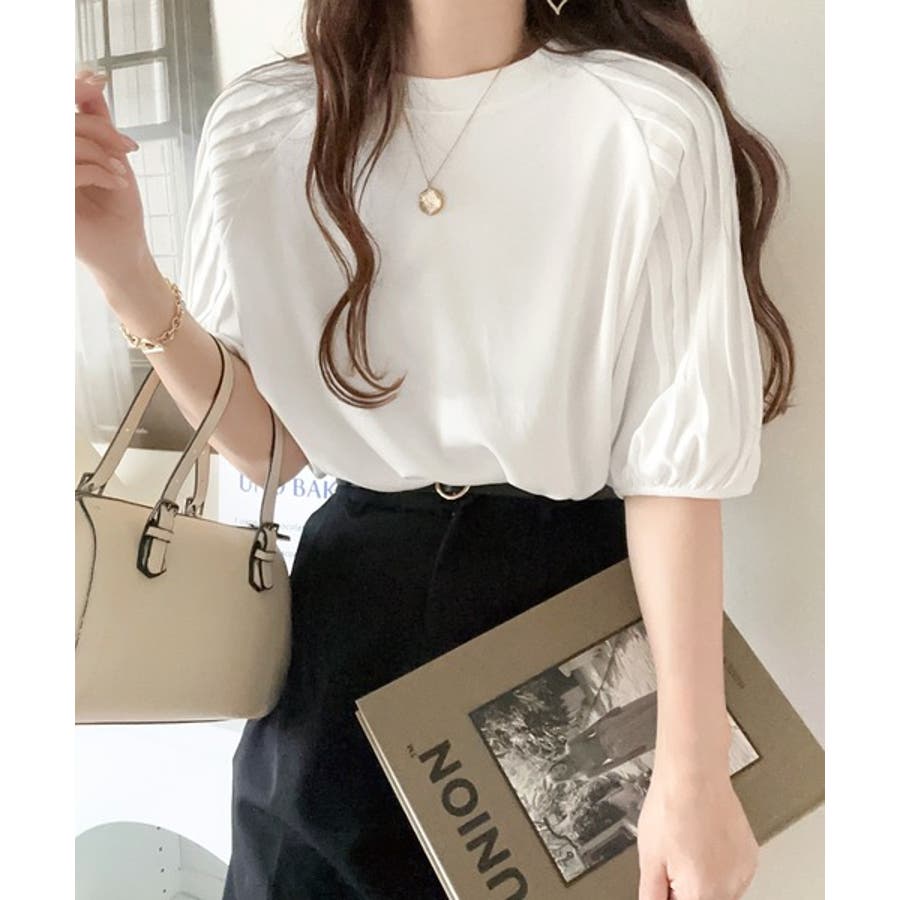 タックの入ったバルーンスリーブが特徴的なTシャツ。