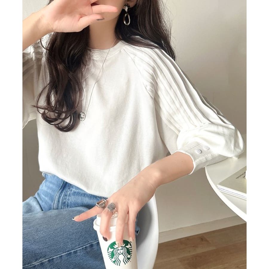 カジュアルな中にも上品さを。綿100%袖山タックラグラン長袖Tシャツ
