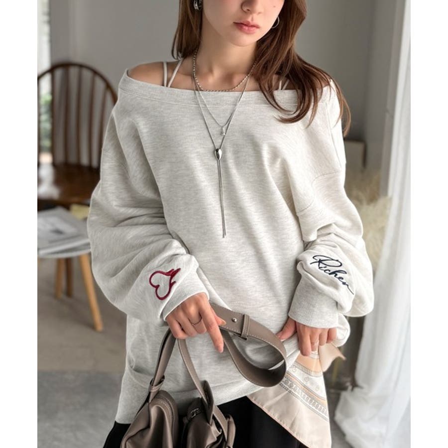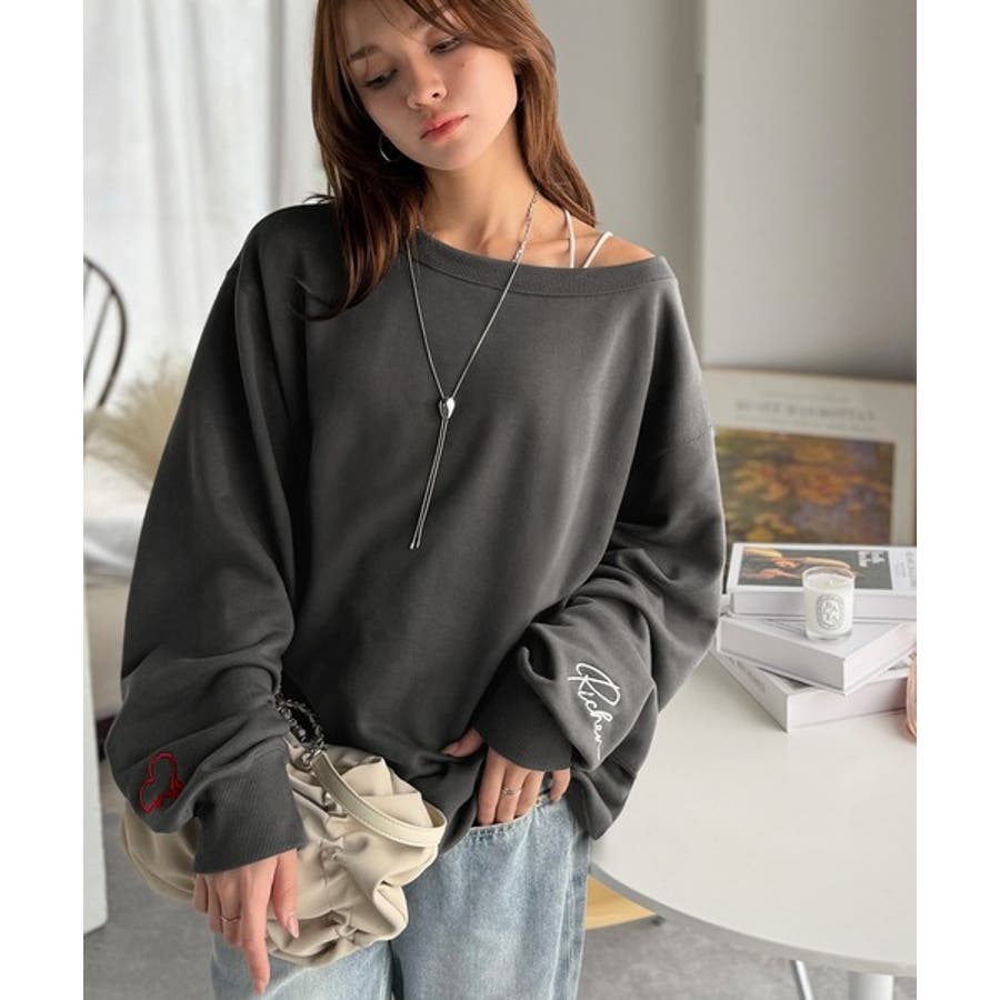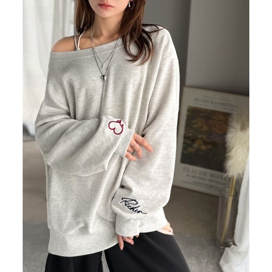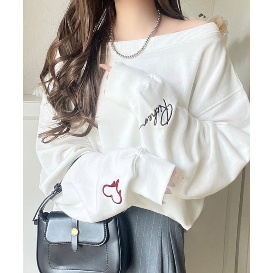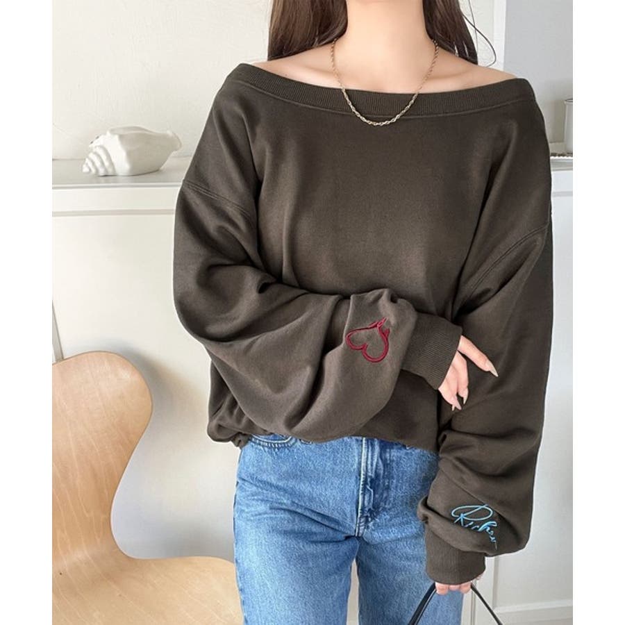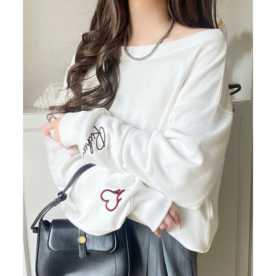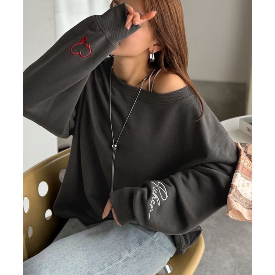 こなれた主役級の存在感♪袖ハート&手書き風ロゴ刺繍裏毛オフショルオーバーサイズス…