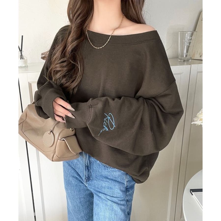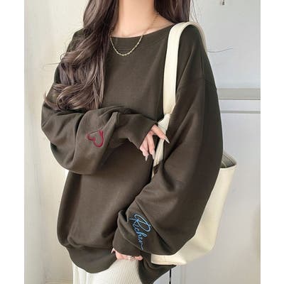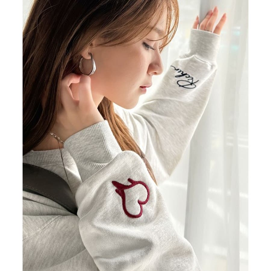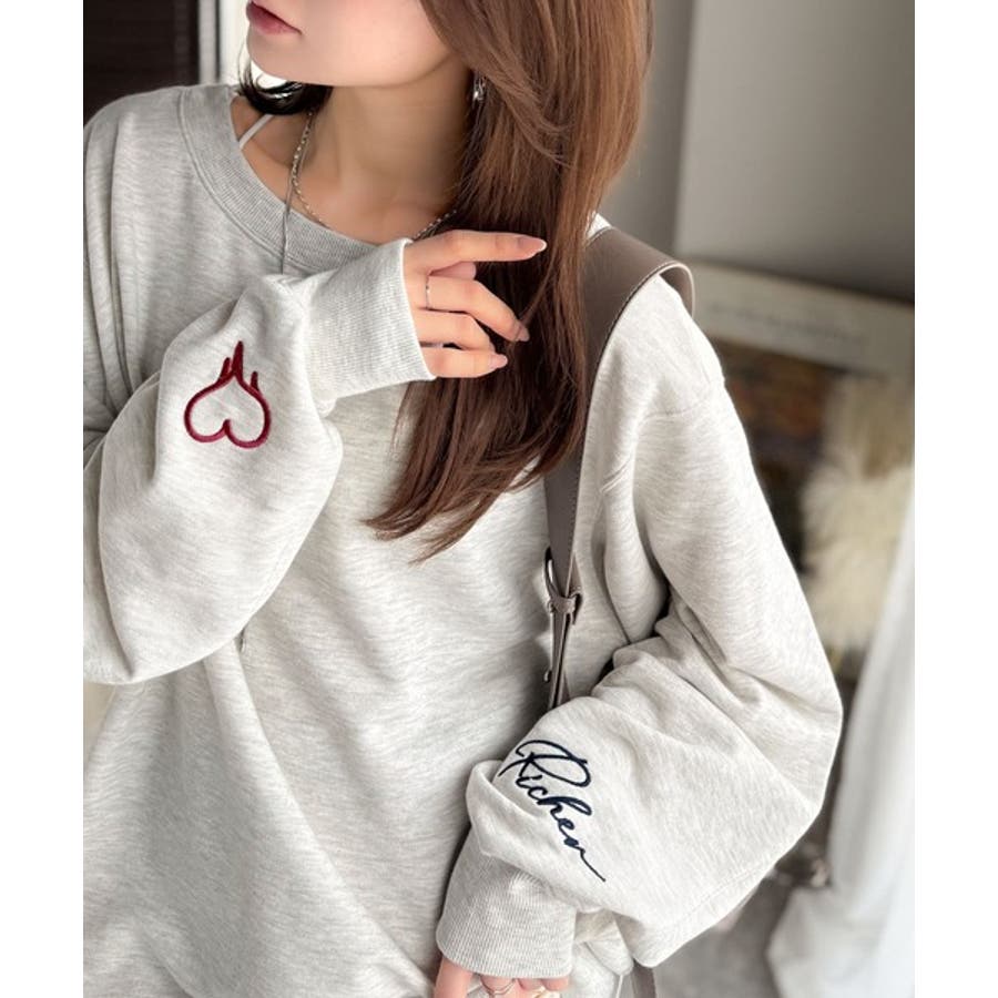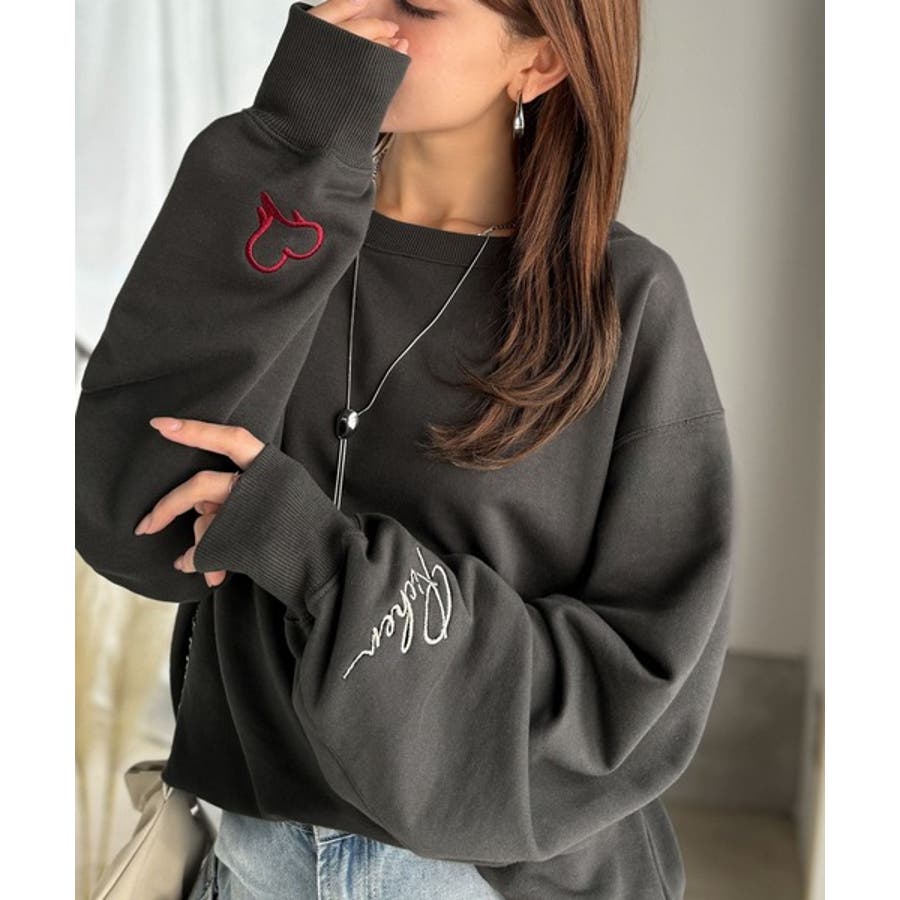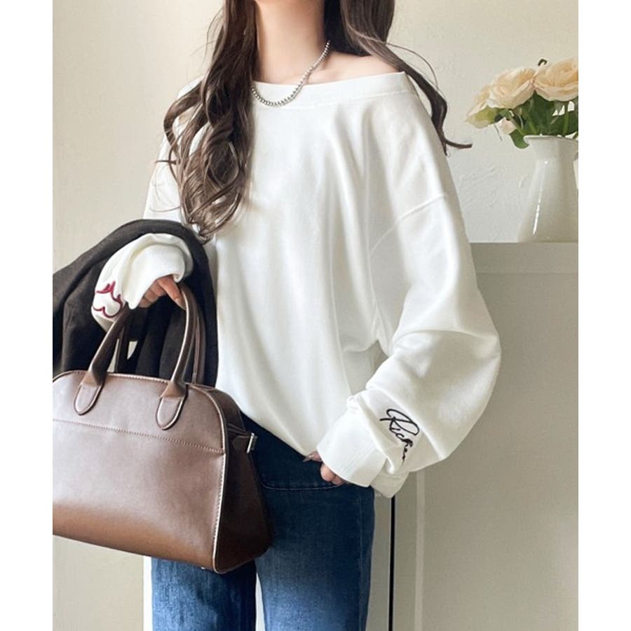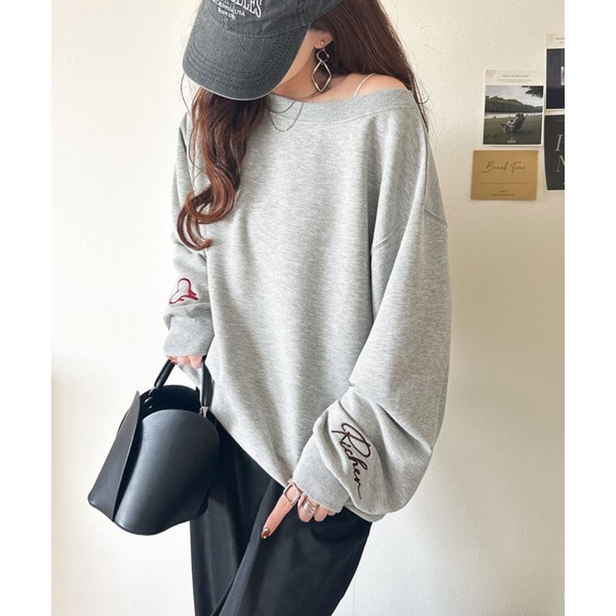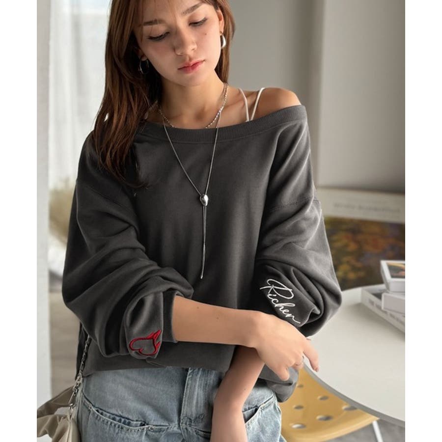 こなれた主役級の存在感♪袖ハート&手書き風ロゴ刺繍裏毛オフショルオーバーサイズス…