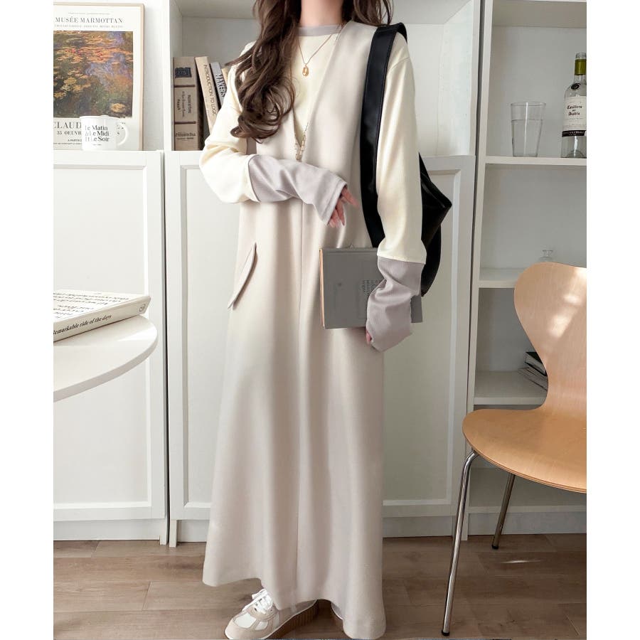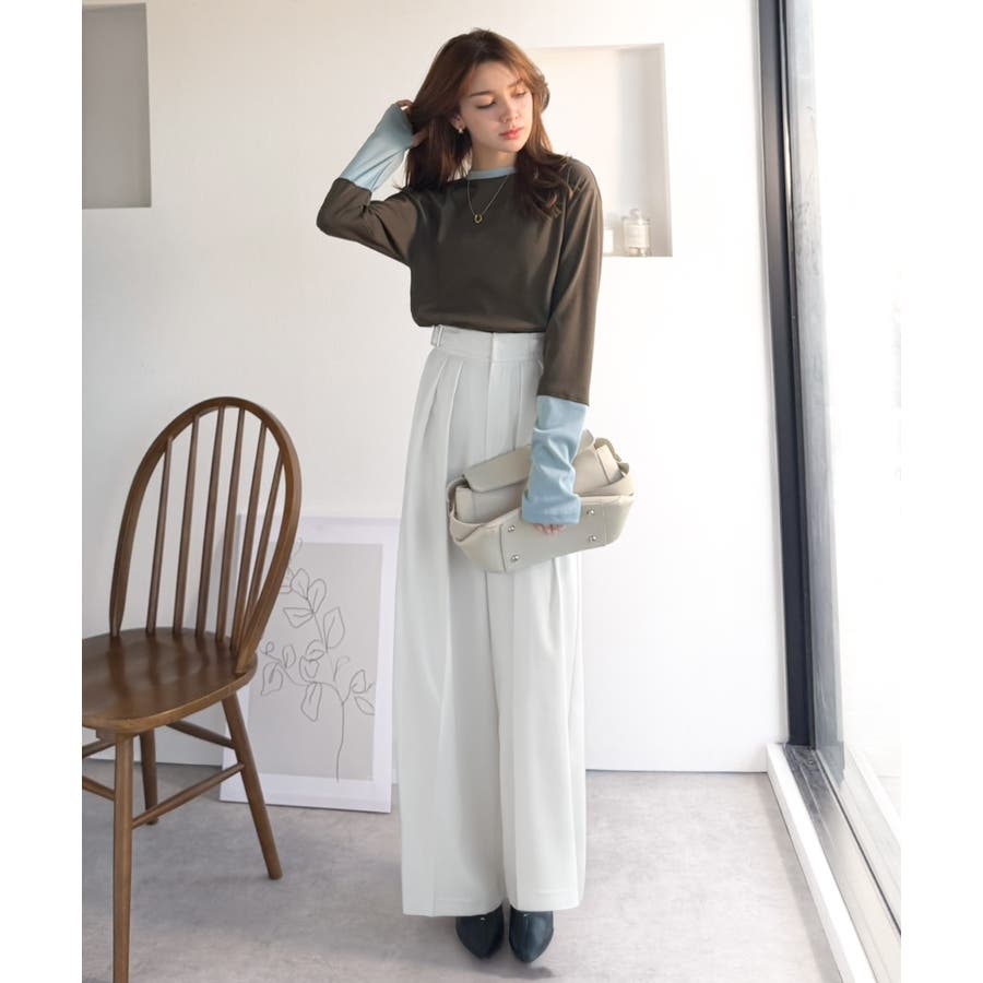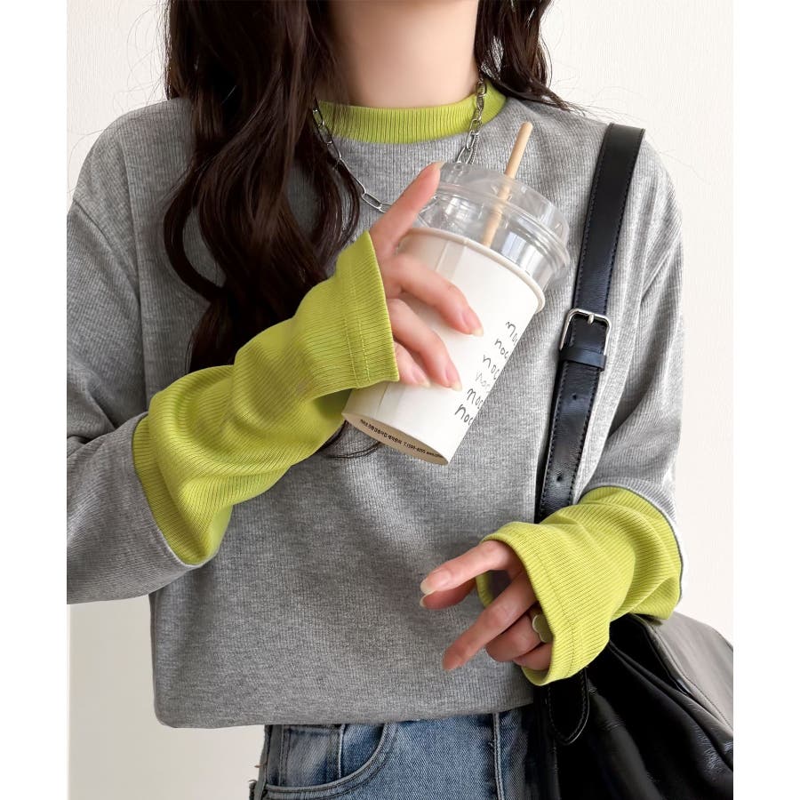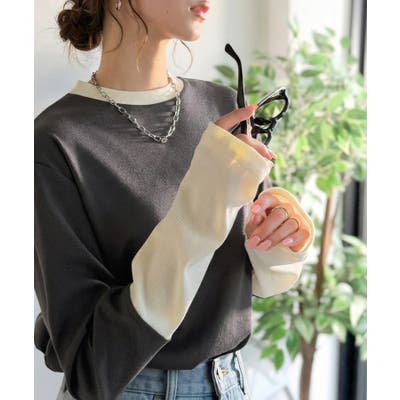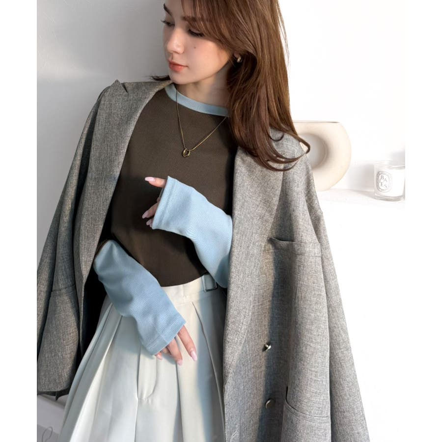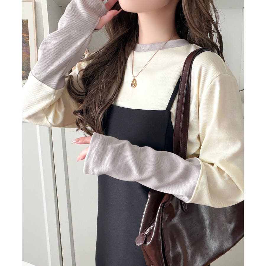 レイヤード見えで仕上げる、きれいめモード。指穴(サムホール)付き袖配色切り替えテ…