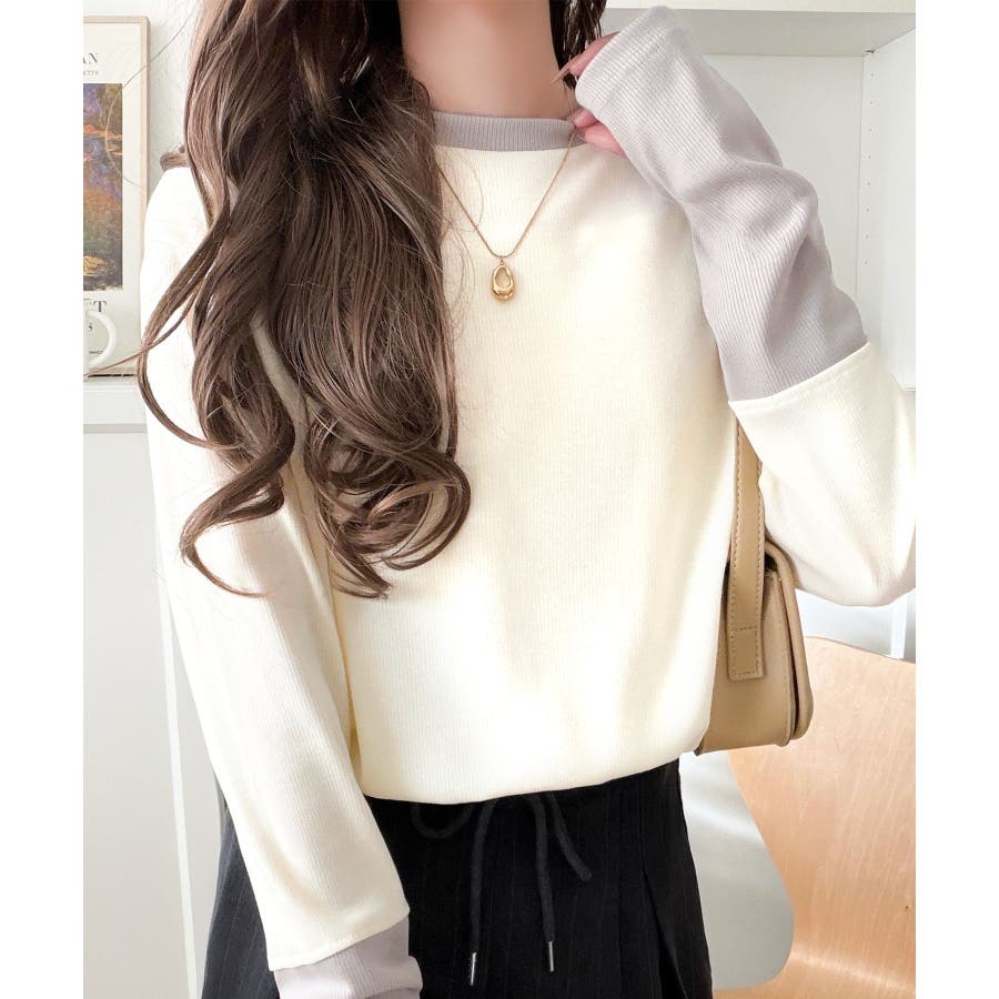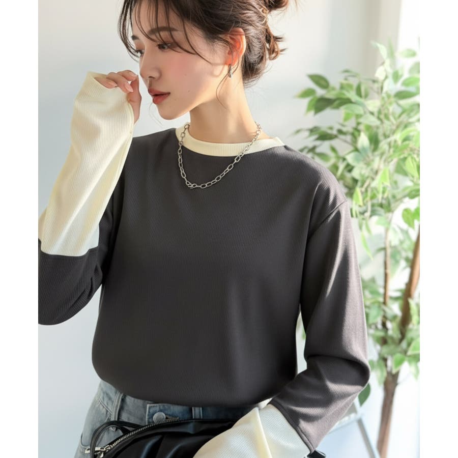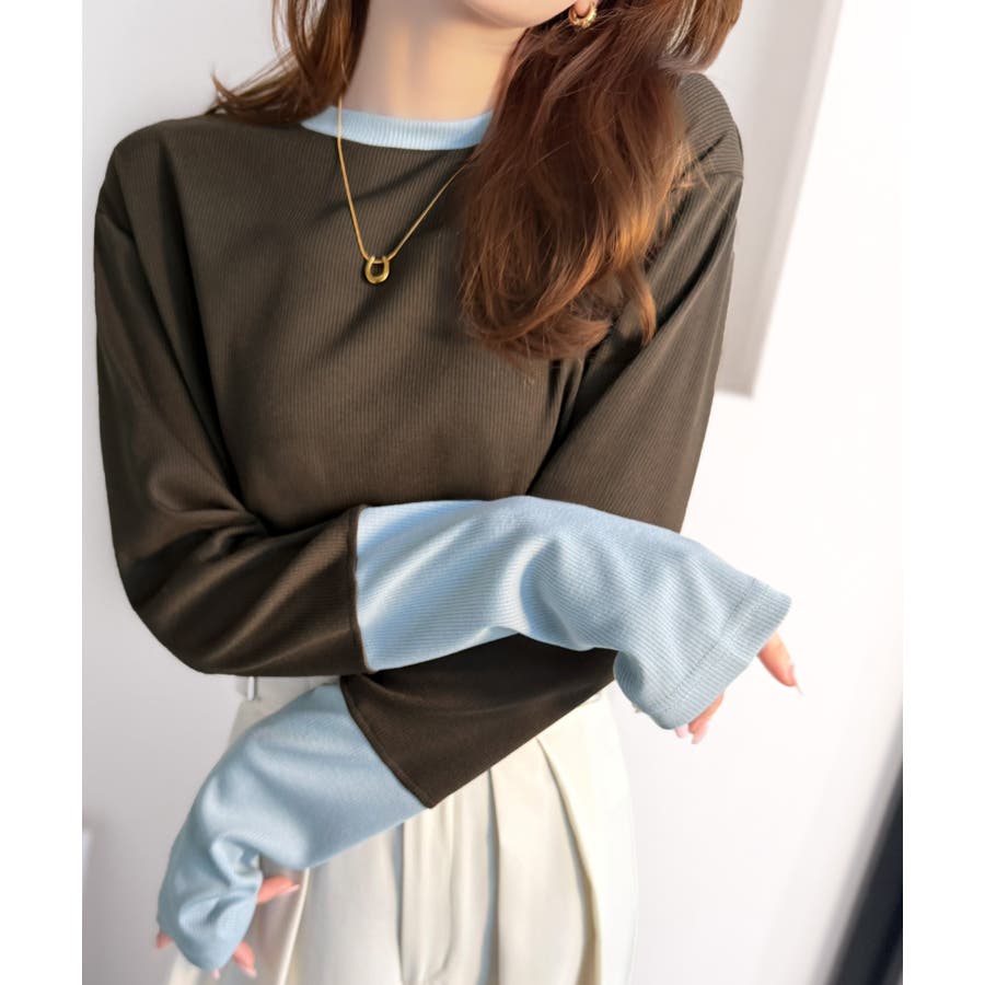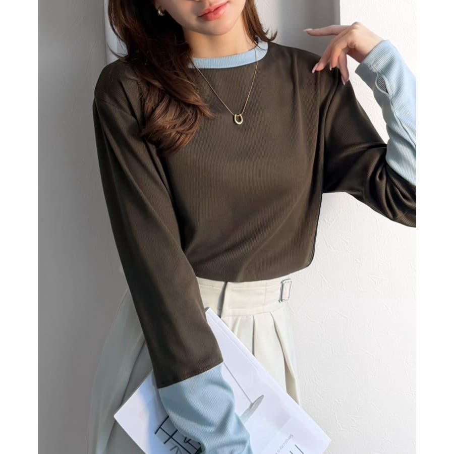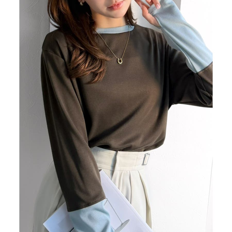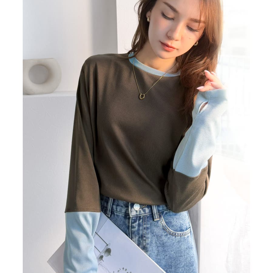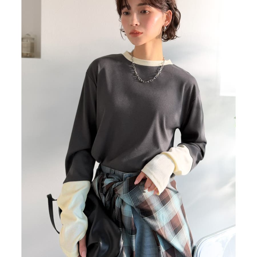 一枚でレイヤード見えが叶う、袖配色切り替えテレコリブニット。