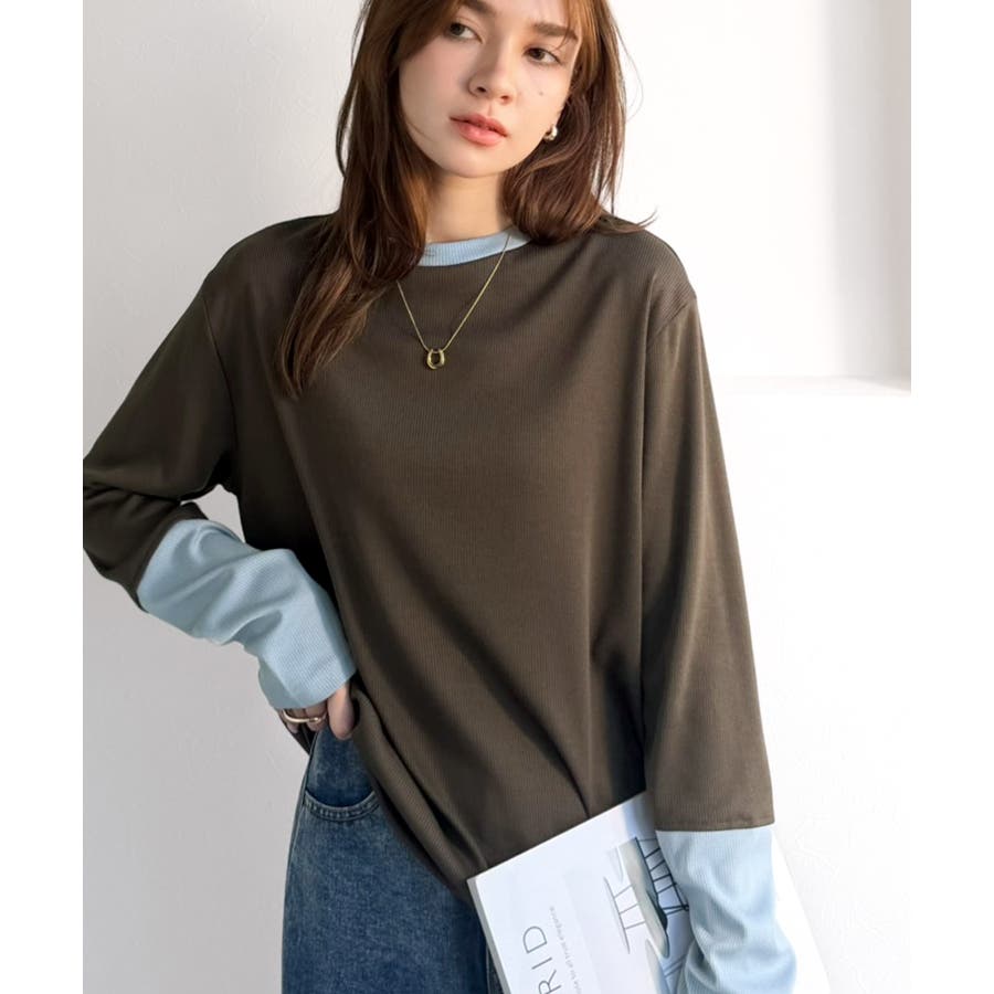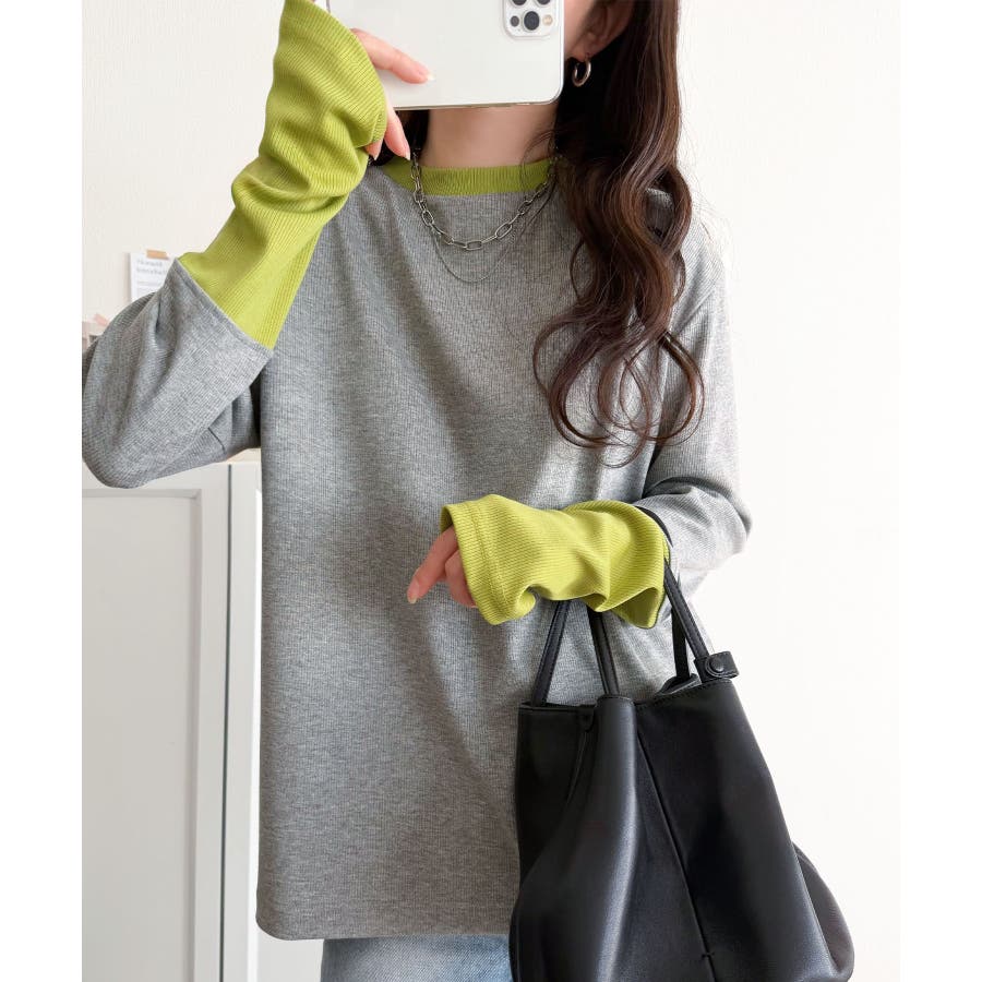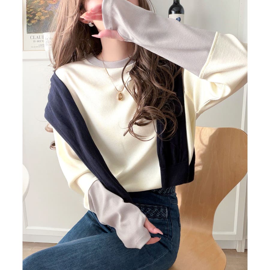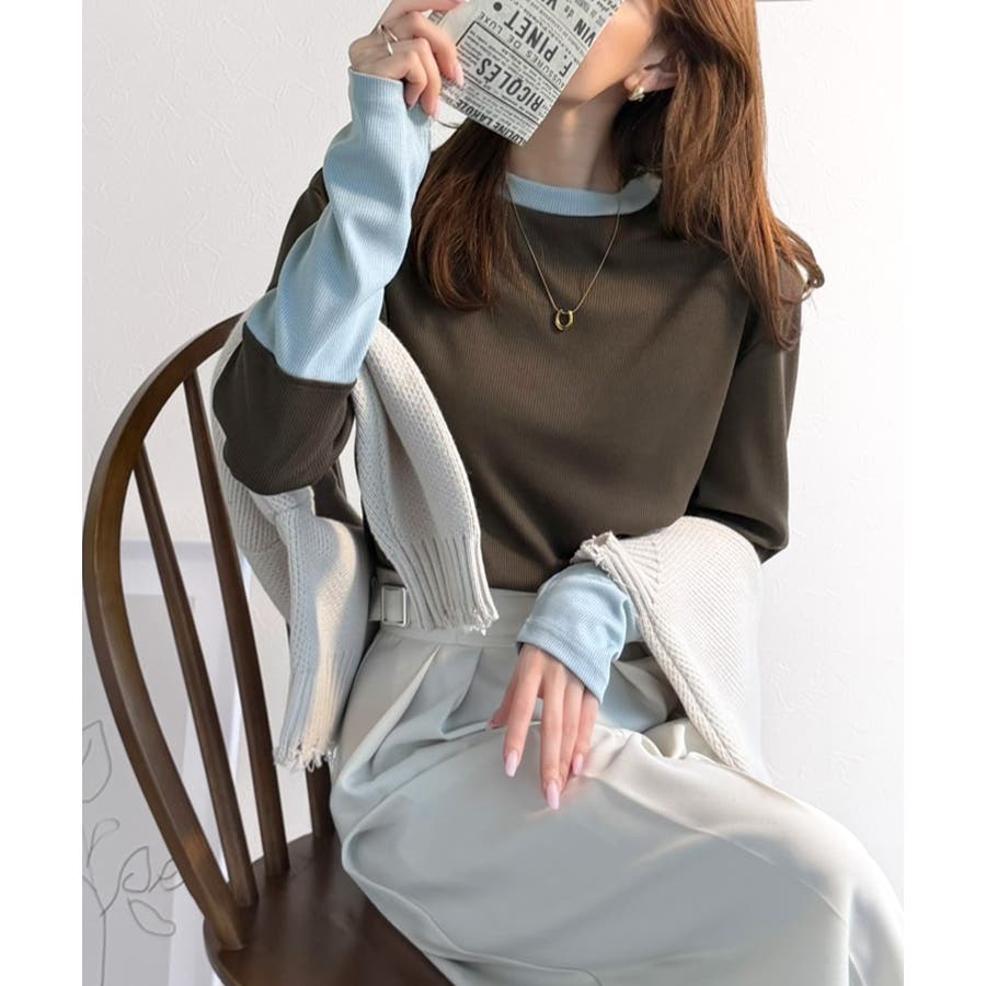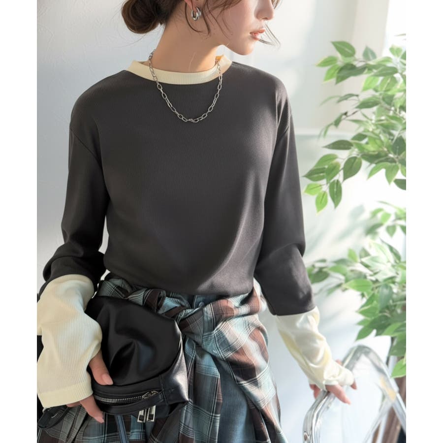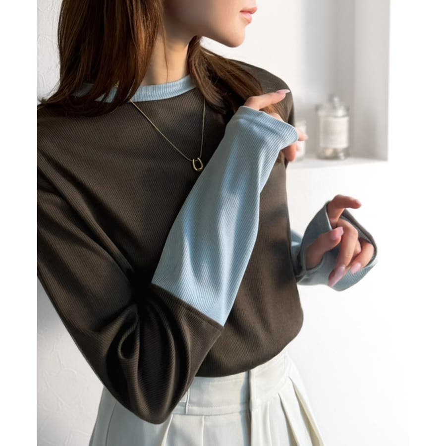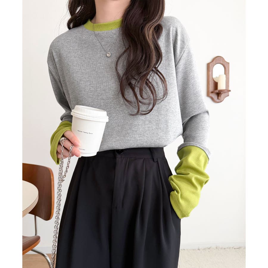 一枚でレイヤード見えが叶う、袖配色切り替えテレコリブニット。