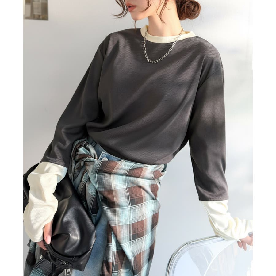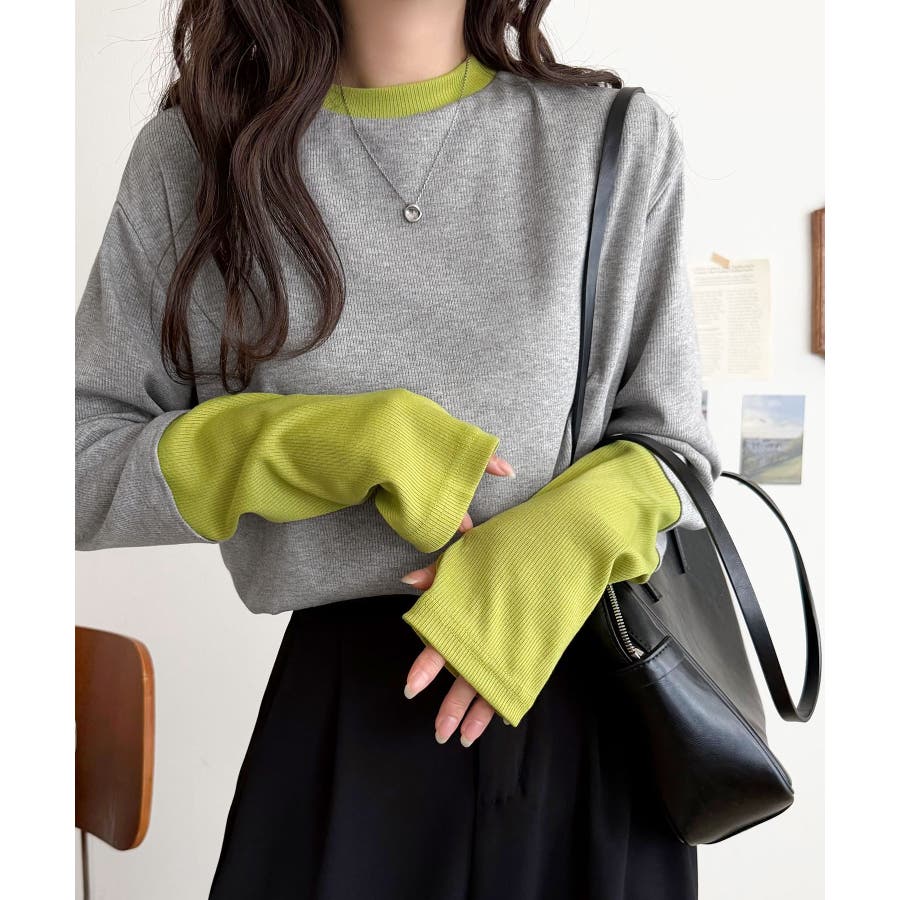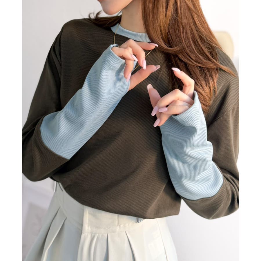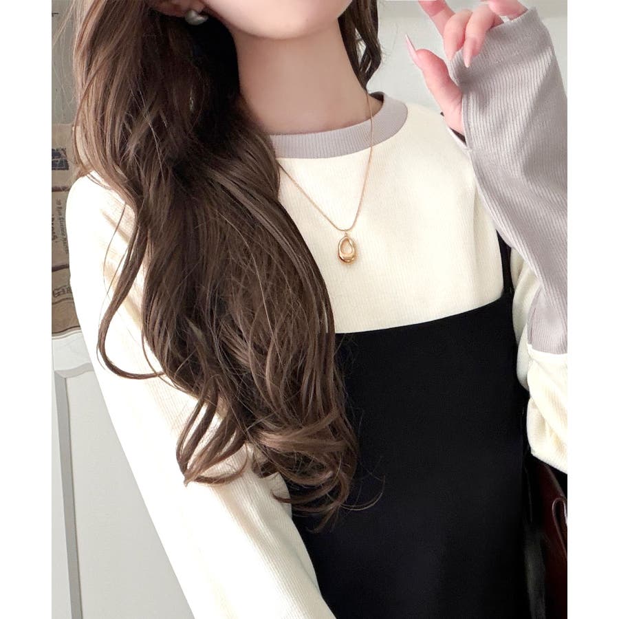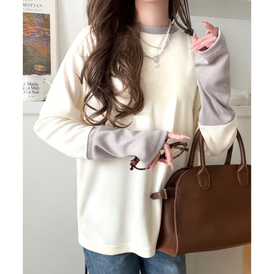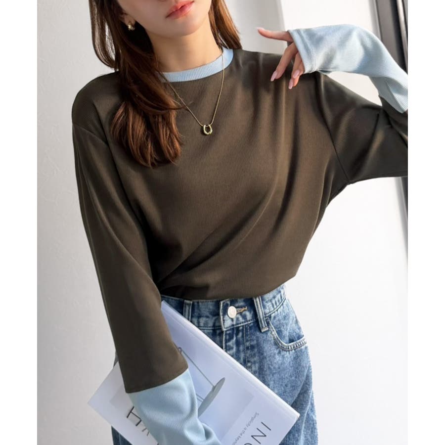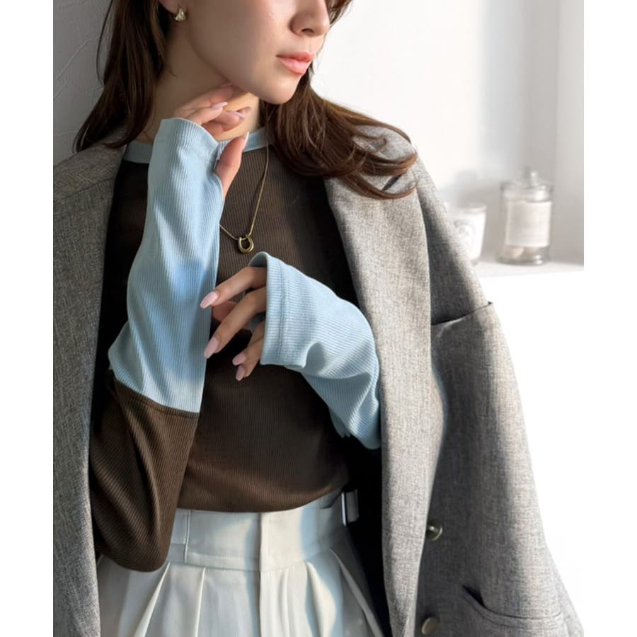 一枚でレイヤード見えが叶う、袖配色切り替えテレコリブニット。