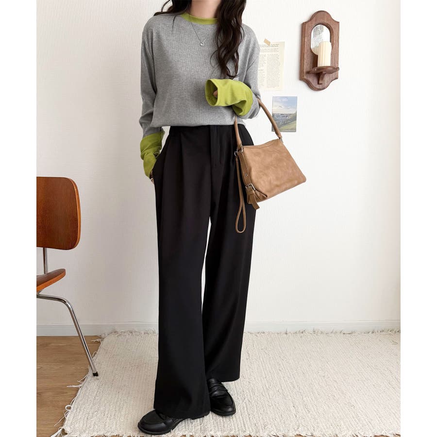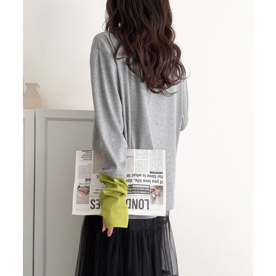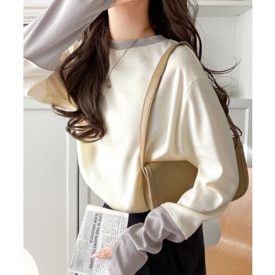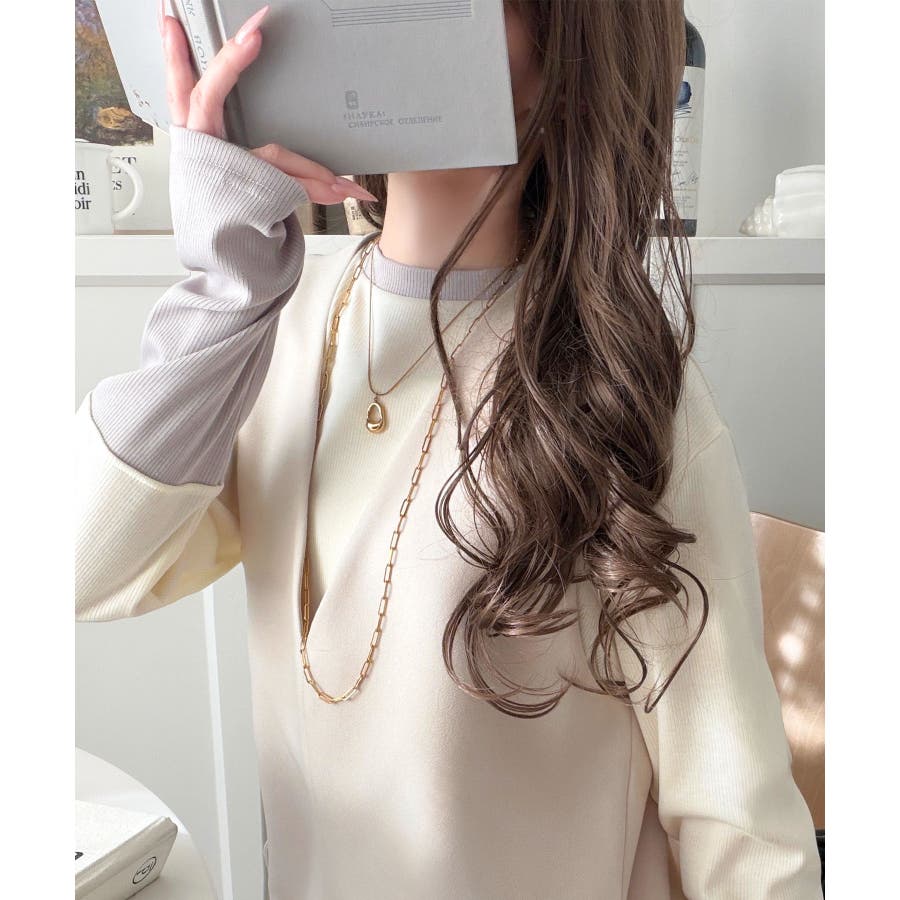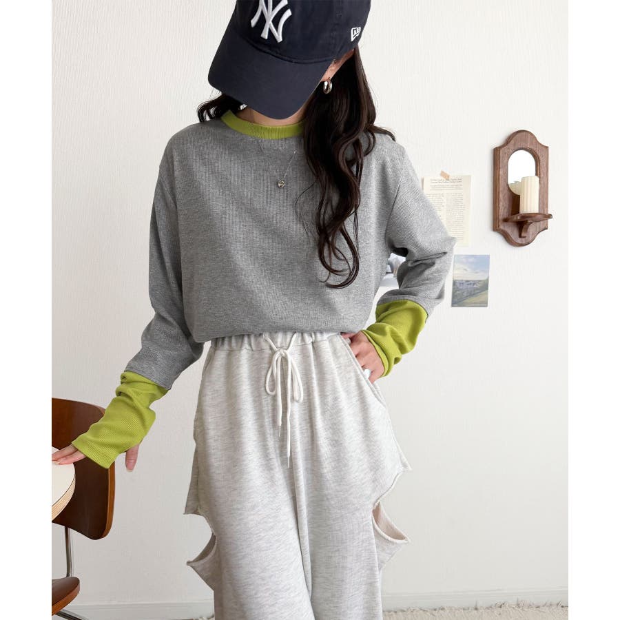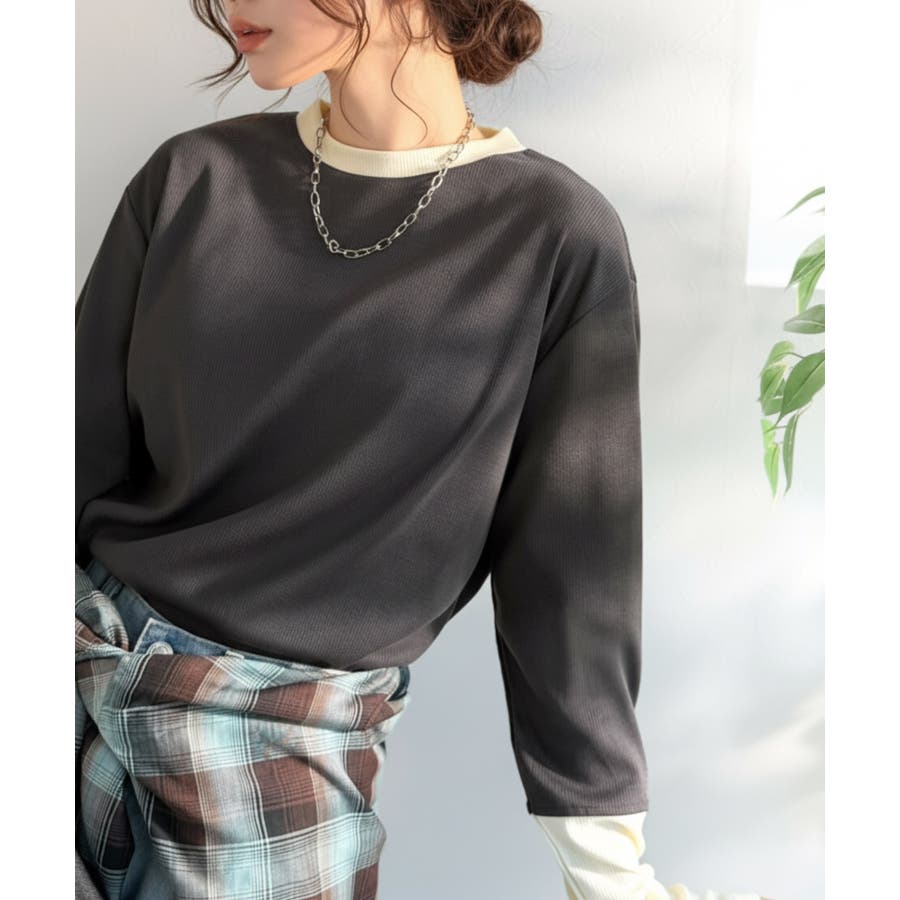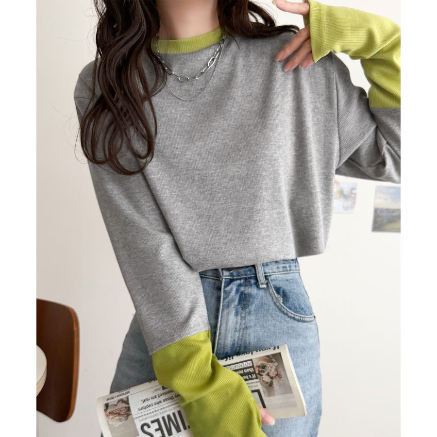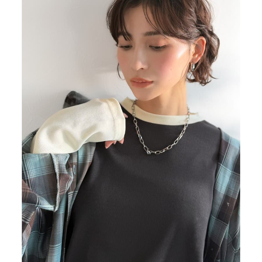 一枚でレイヤード見えが叶う、袖配色切り替えテレコリブニット。
