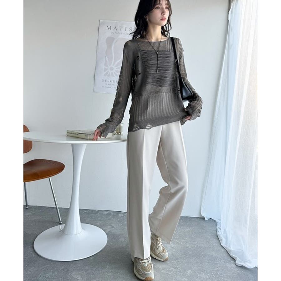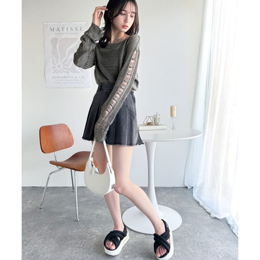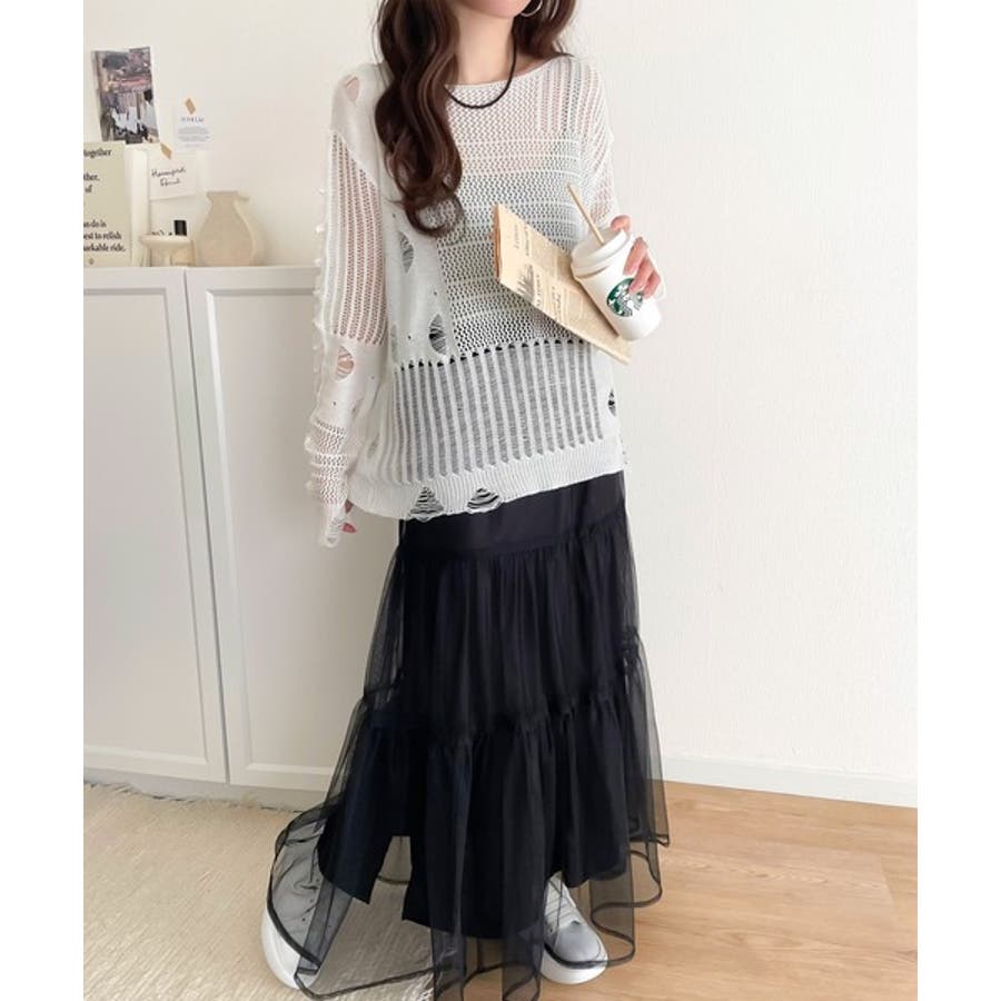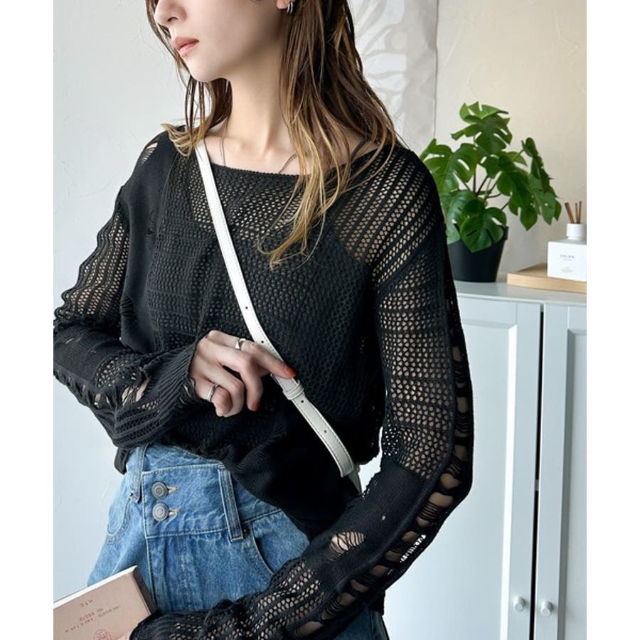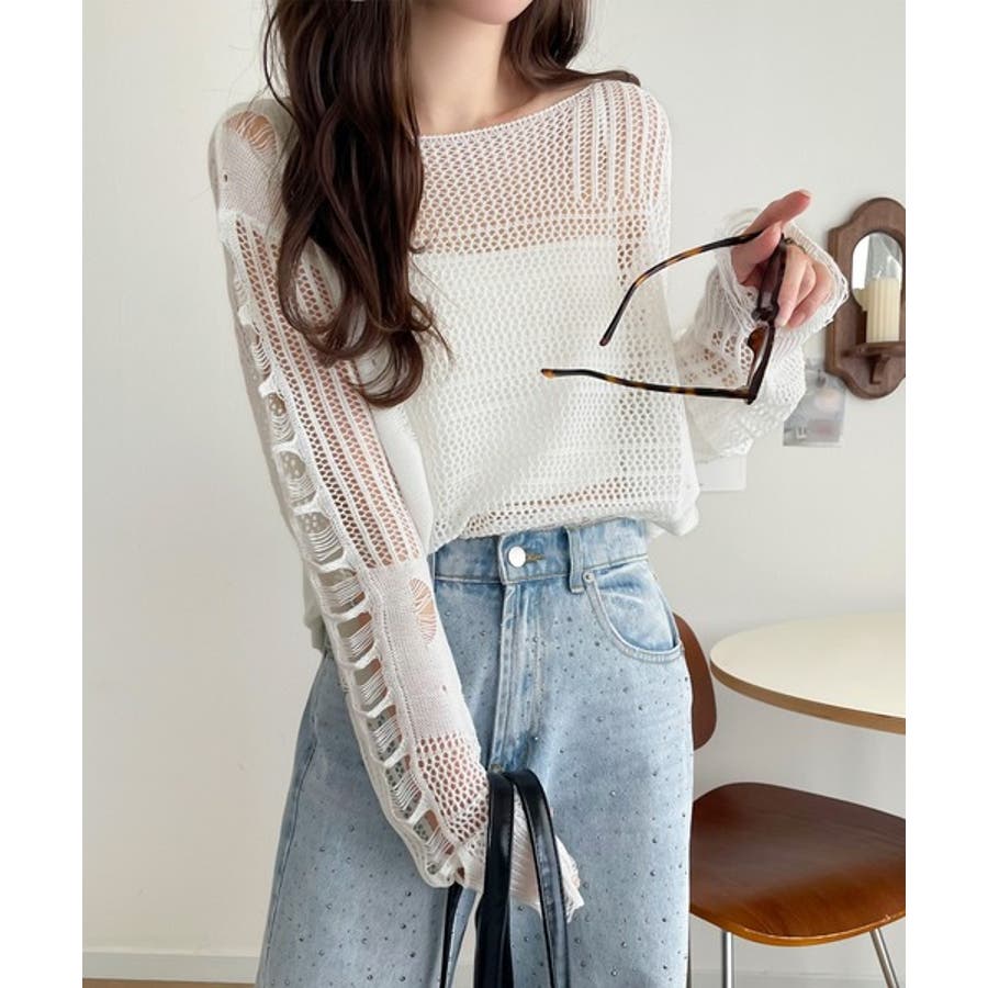ランダムな透け感とダメージ加工がポイントの透かし編みニット。