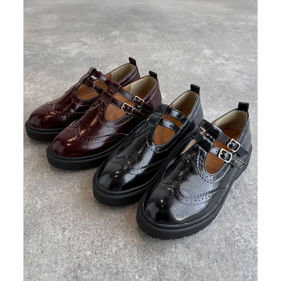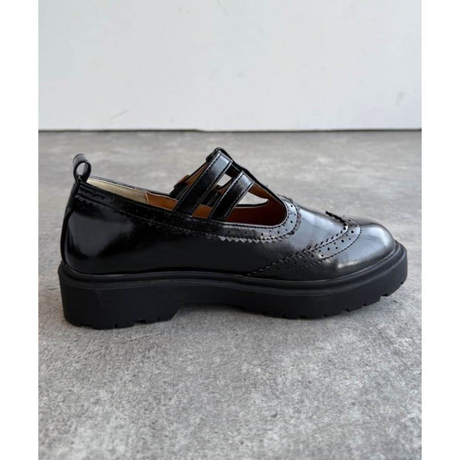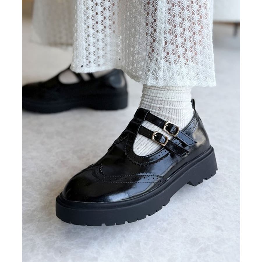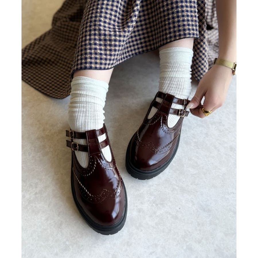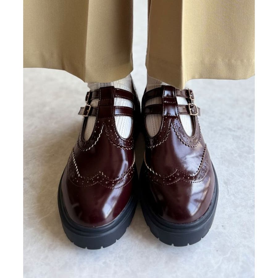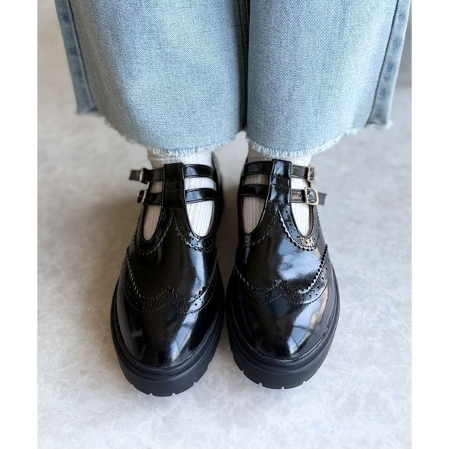 マニッシュなウイングチップと穴飾りに、Tストラップがほどよい抜け感をプラス◎