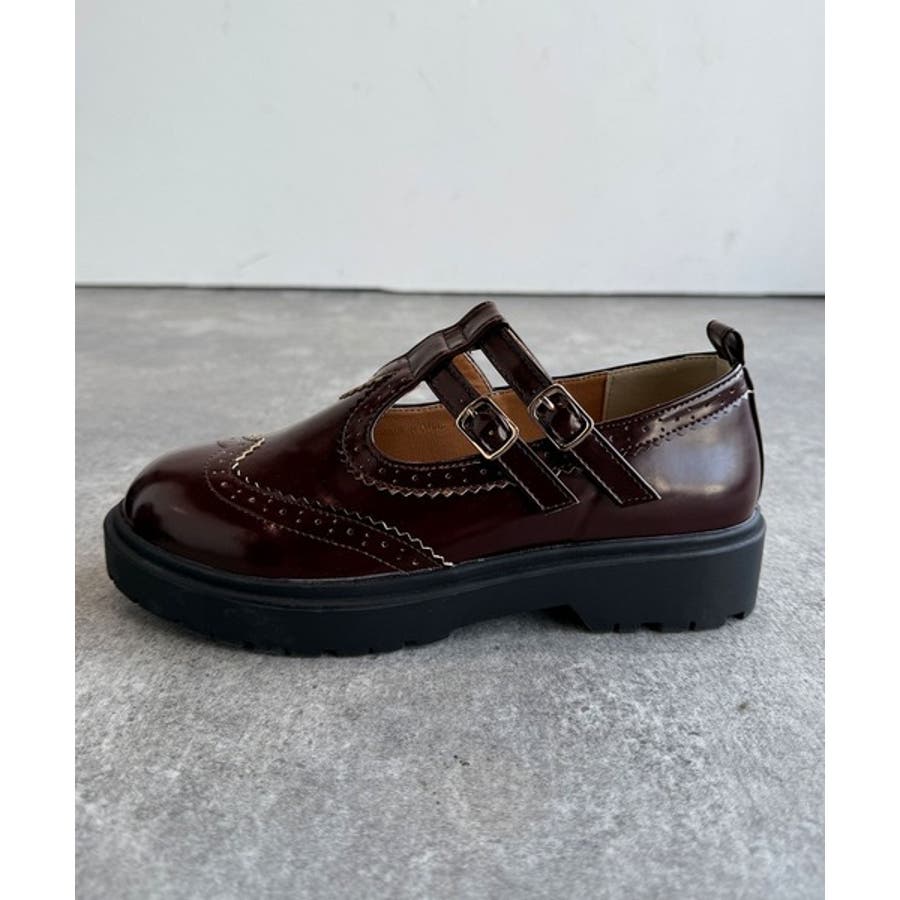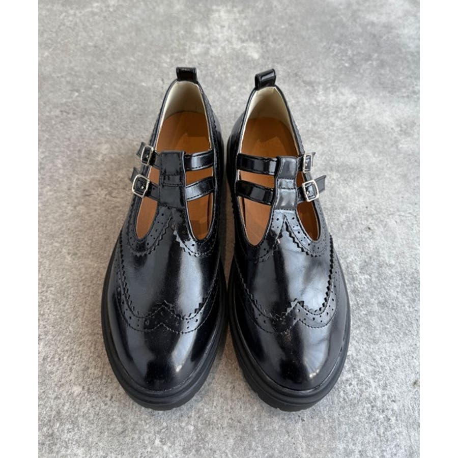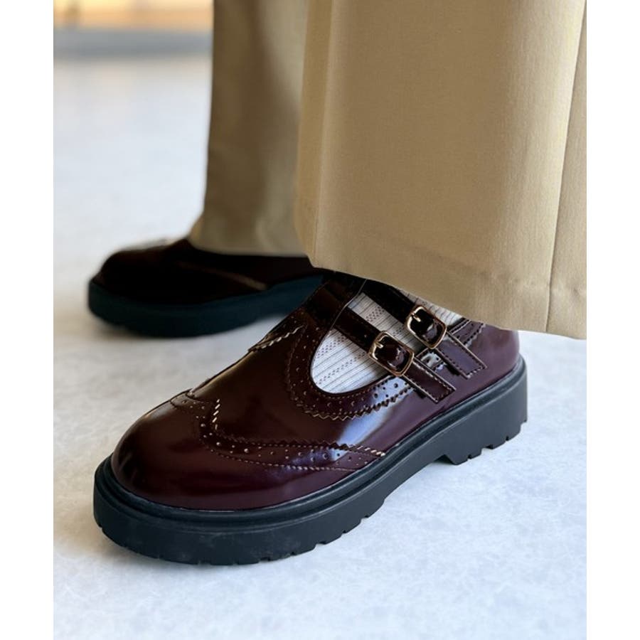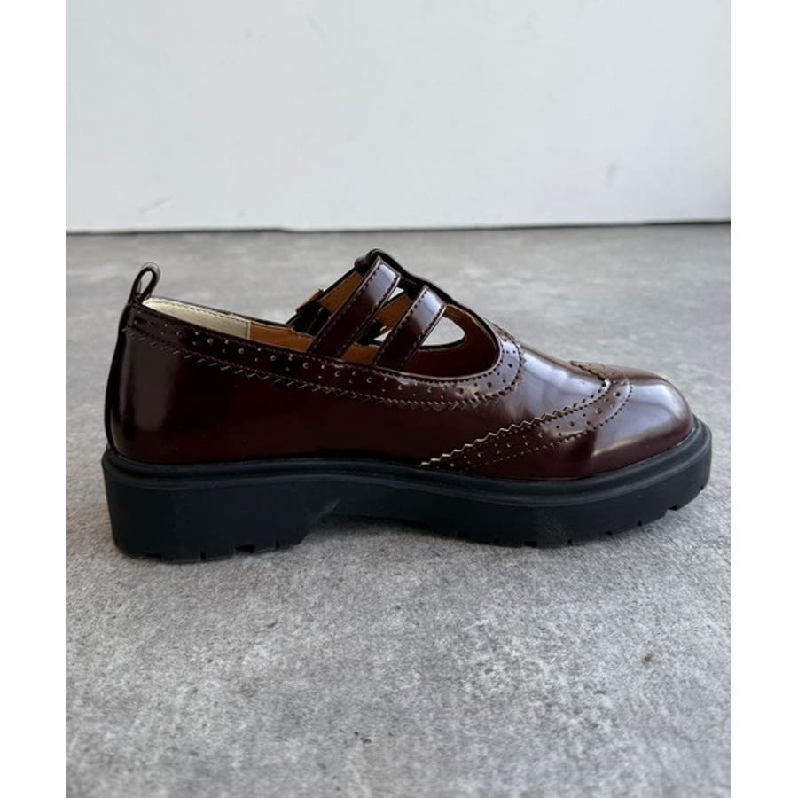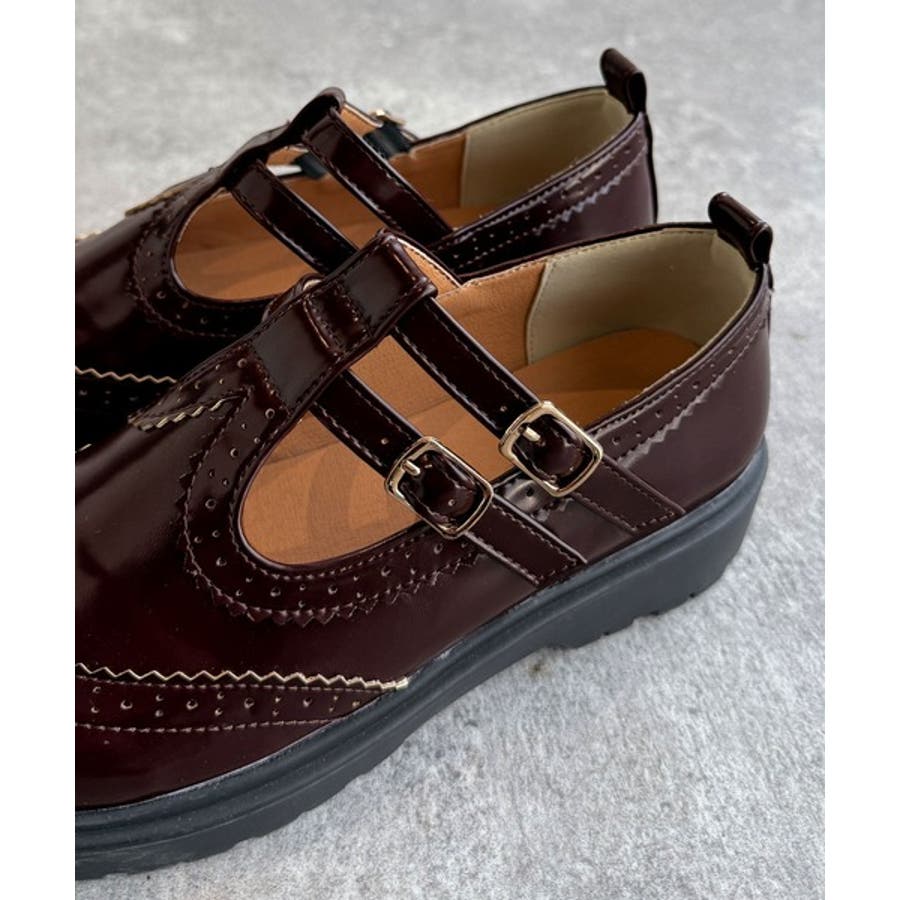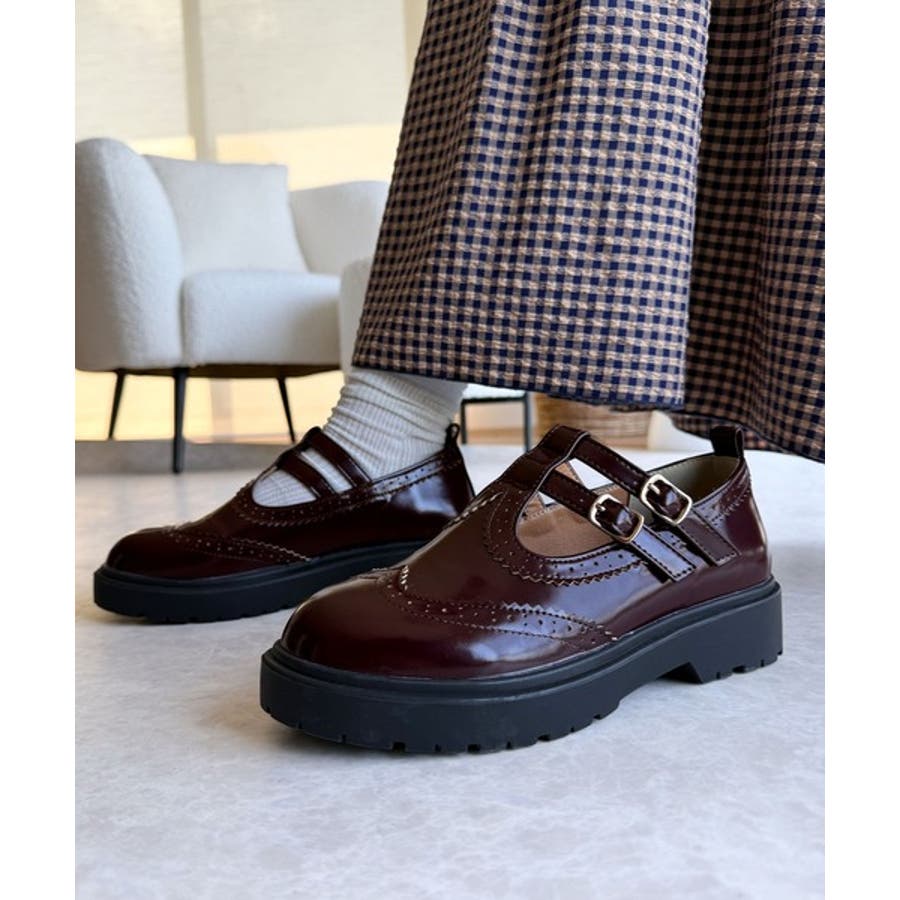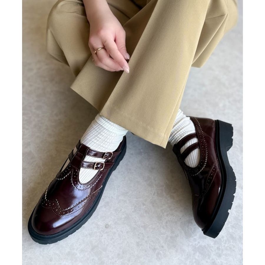 マニッシュなウイングチップと穴飾りに、Tストラップがほどよい抜け感をプラス◎