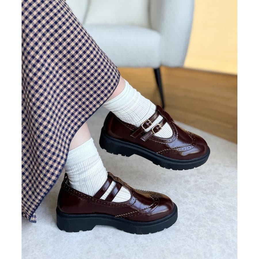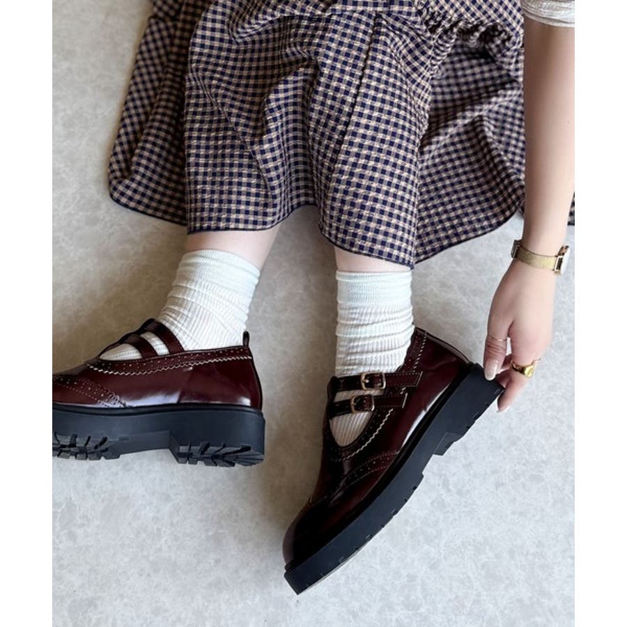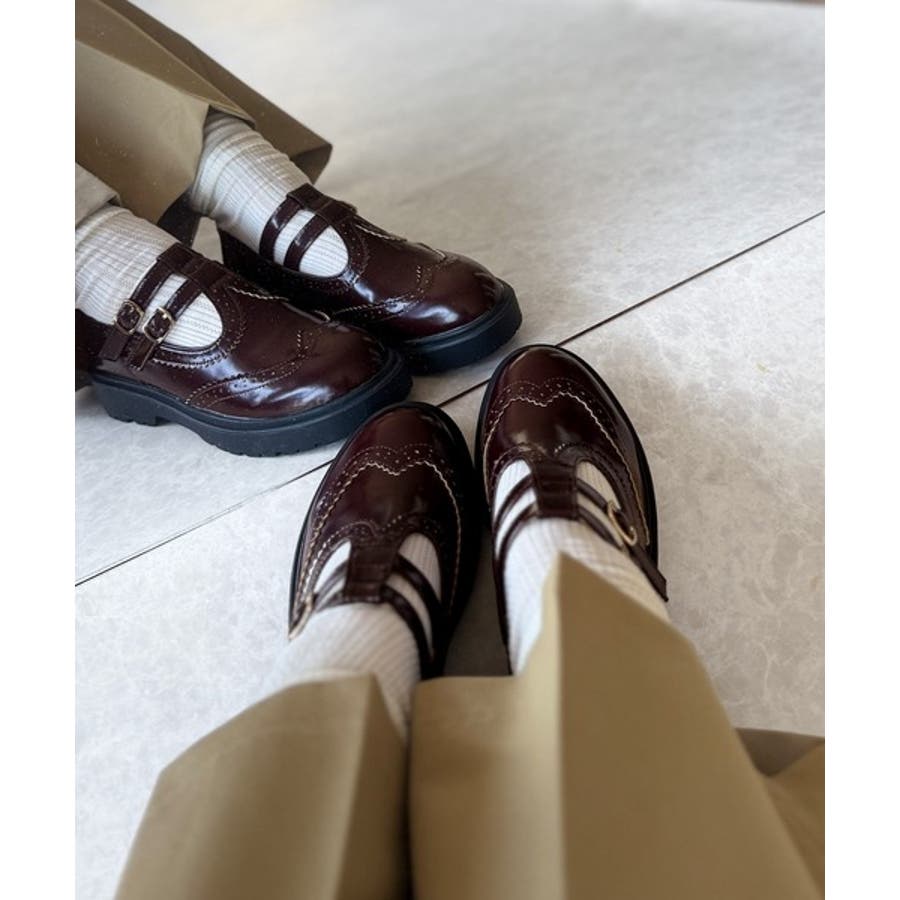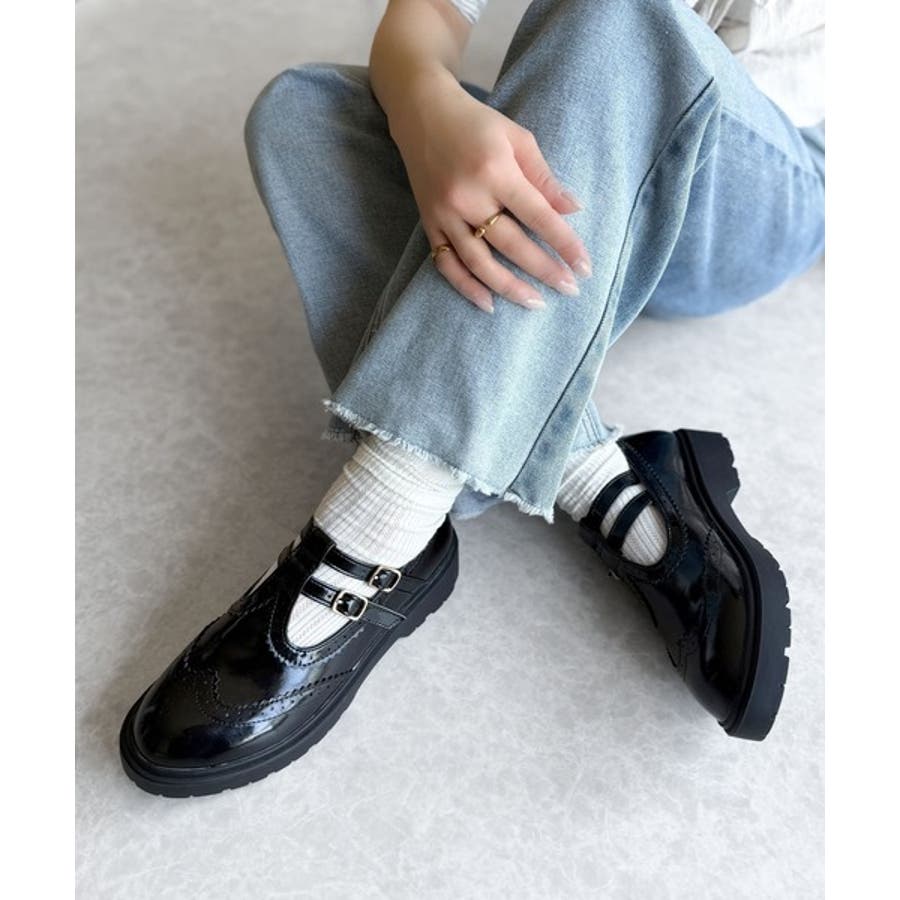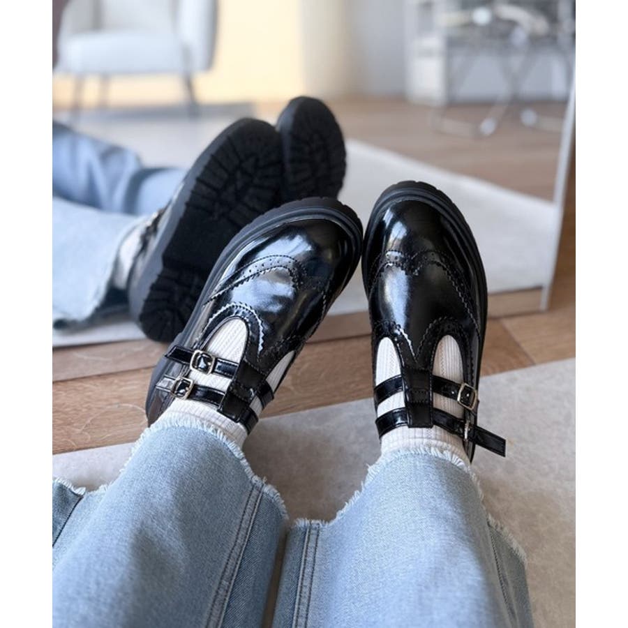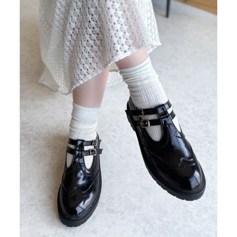 マニッシュなウイングチップと穴飾りに、Tストラップがほどよい抜け感をプラス◎