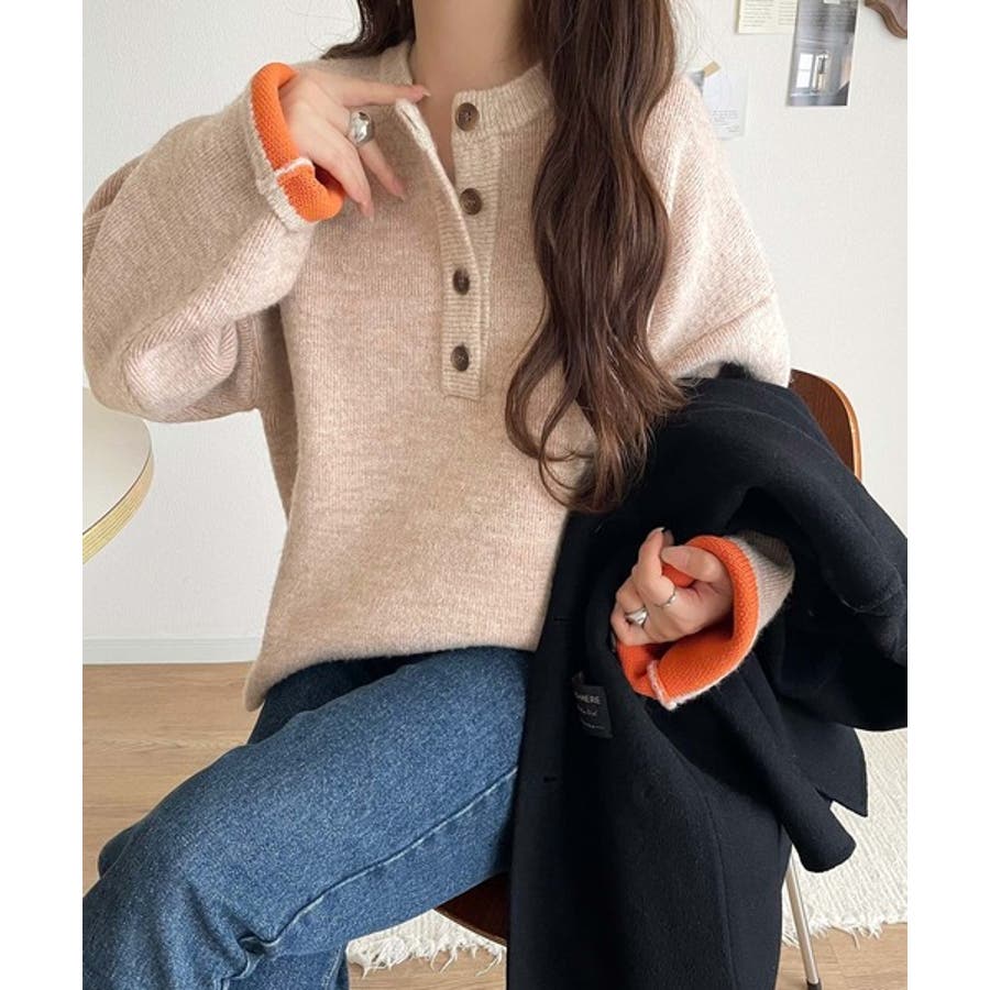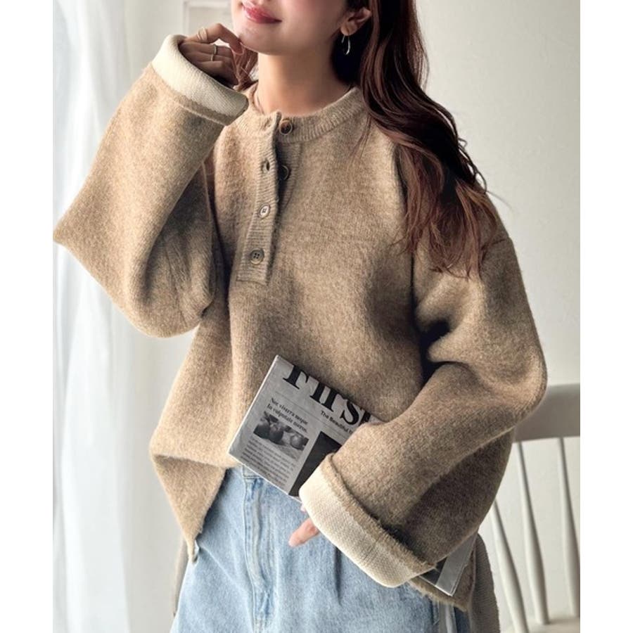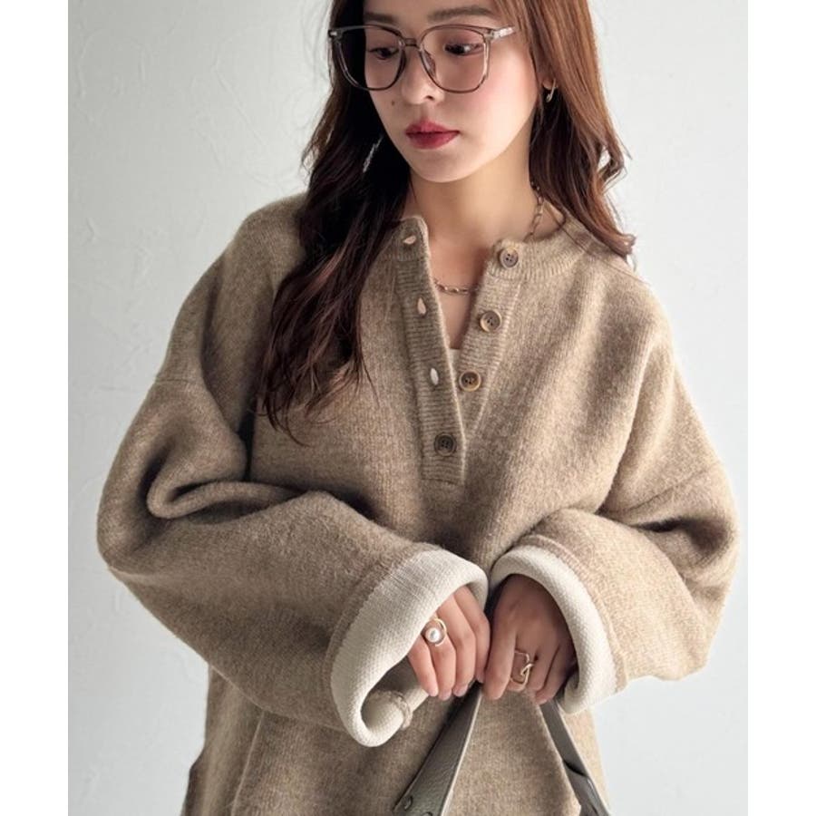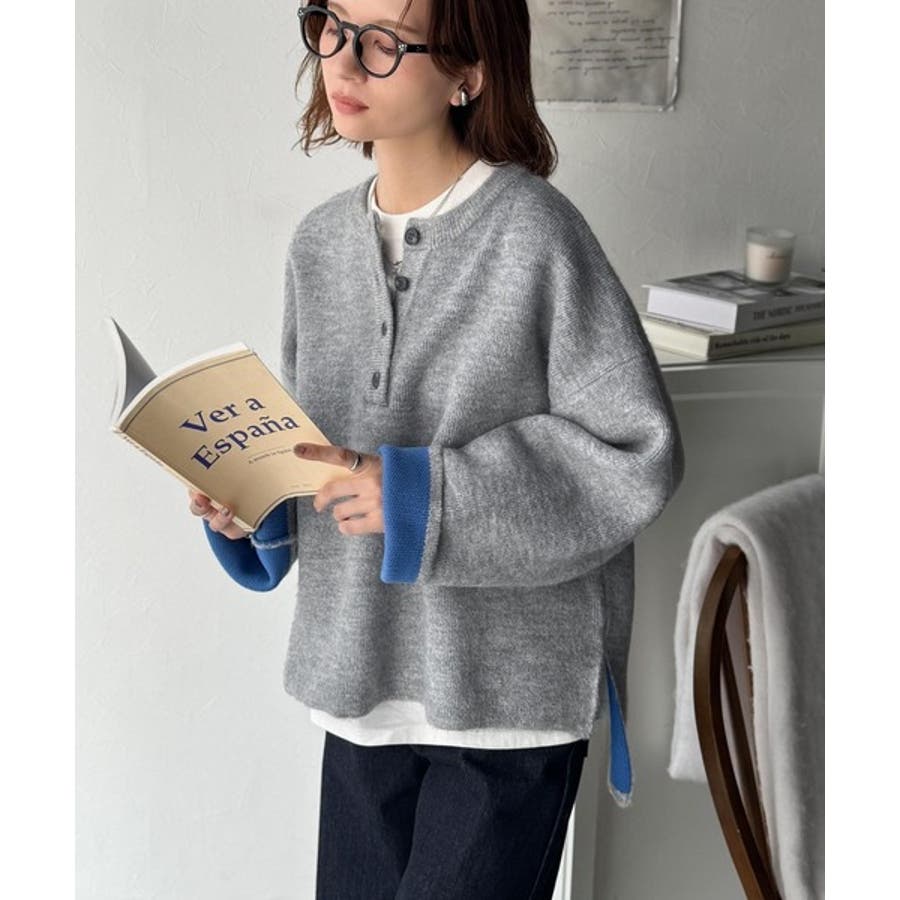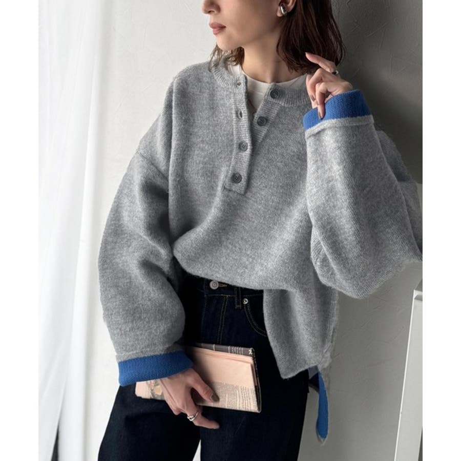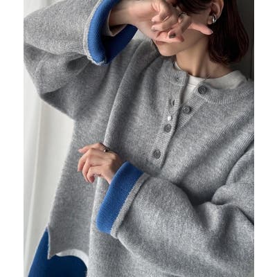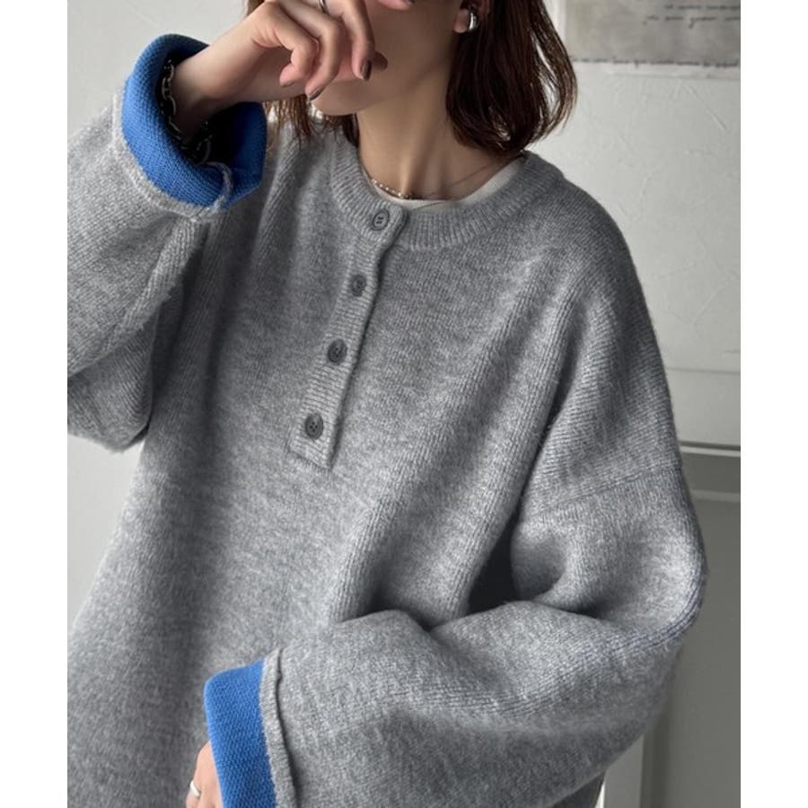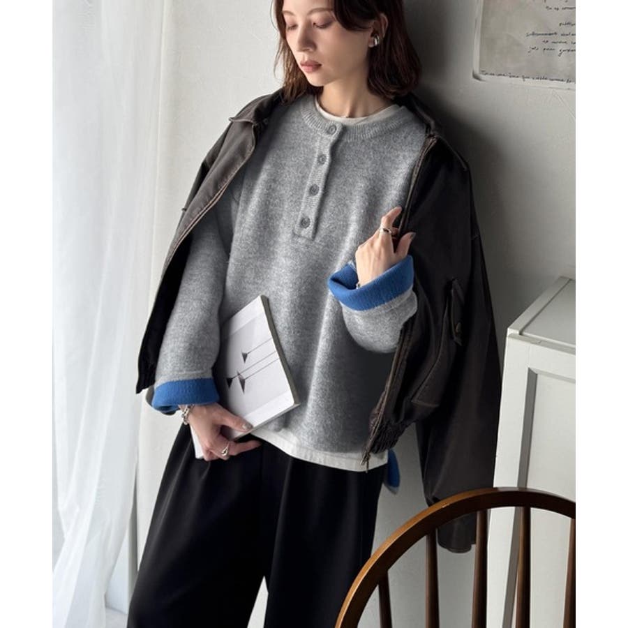 ・4つボタンがアクセントのヘンリーネック・前後差をつけたストレートラインの裾・折り返し可能な袖口の配色デザイン・軽い着心地のスウェットライクニット・同素材シリーズの展開あり