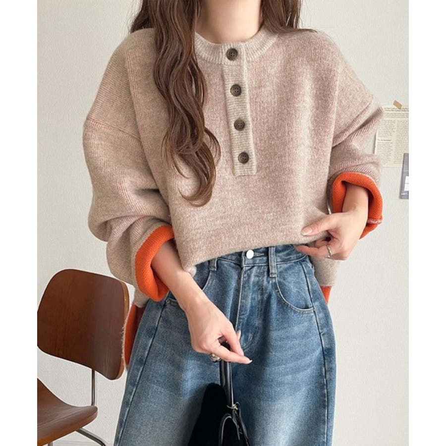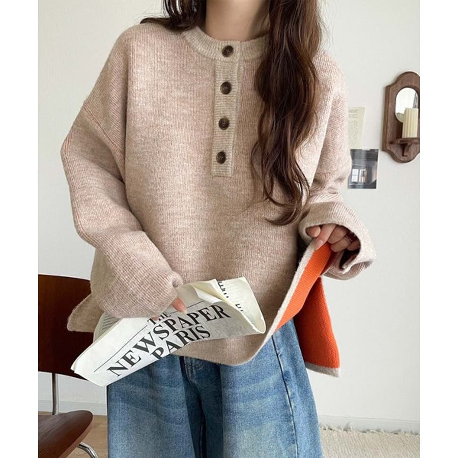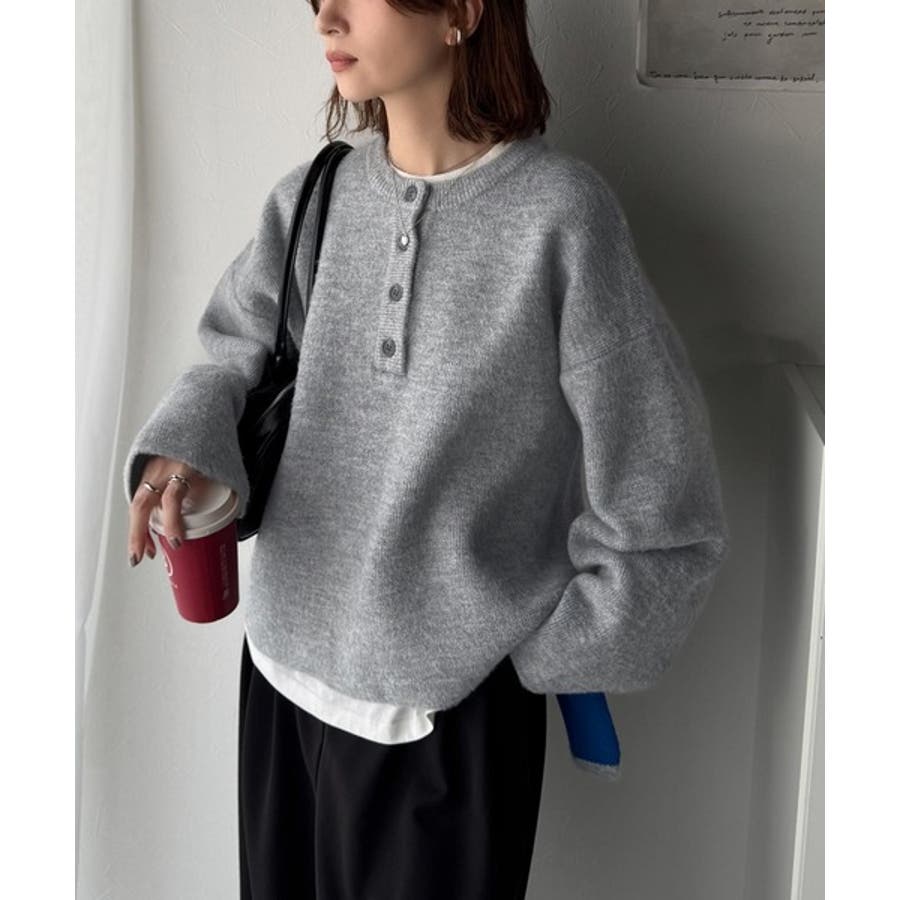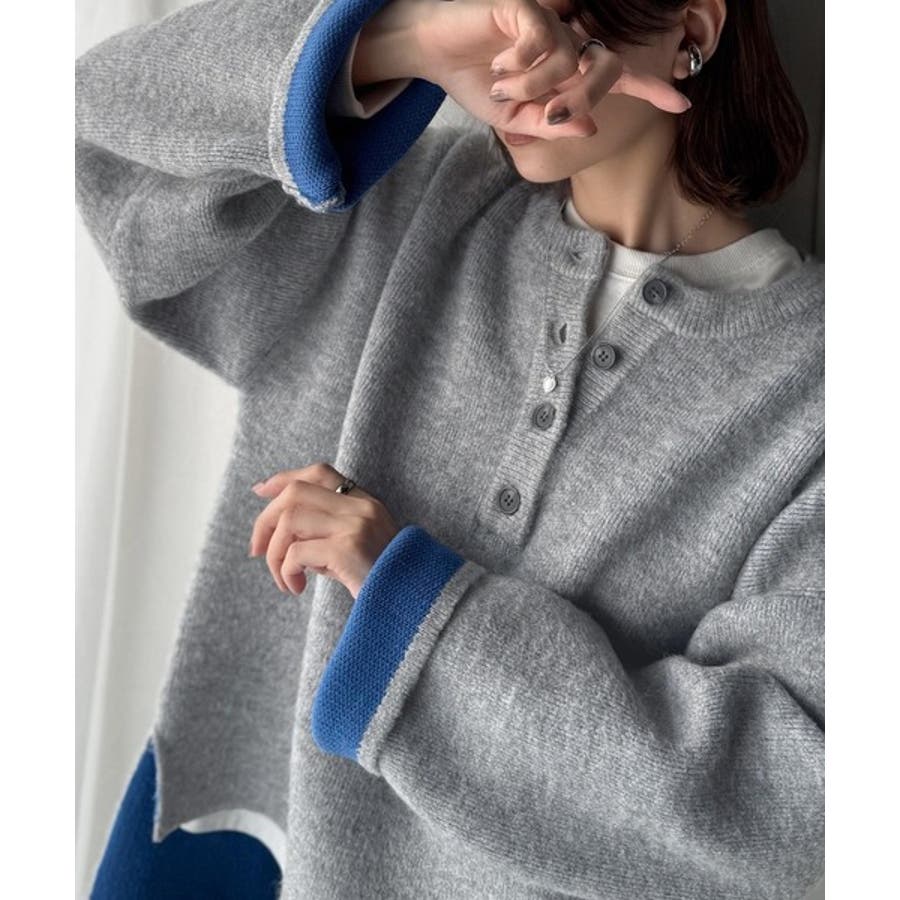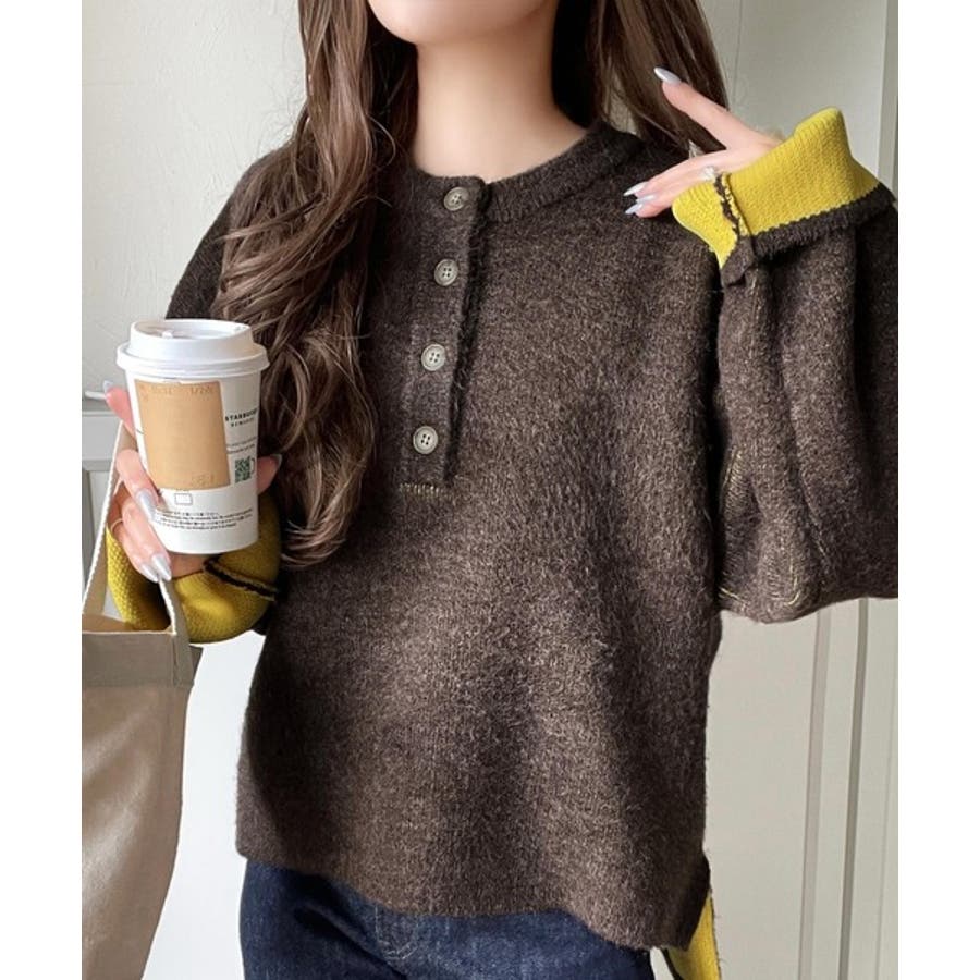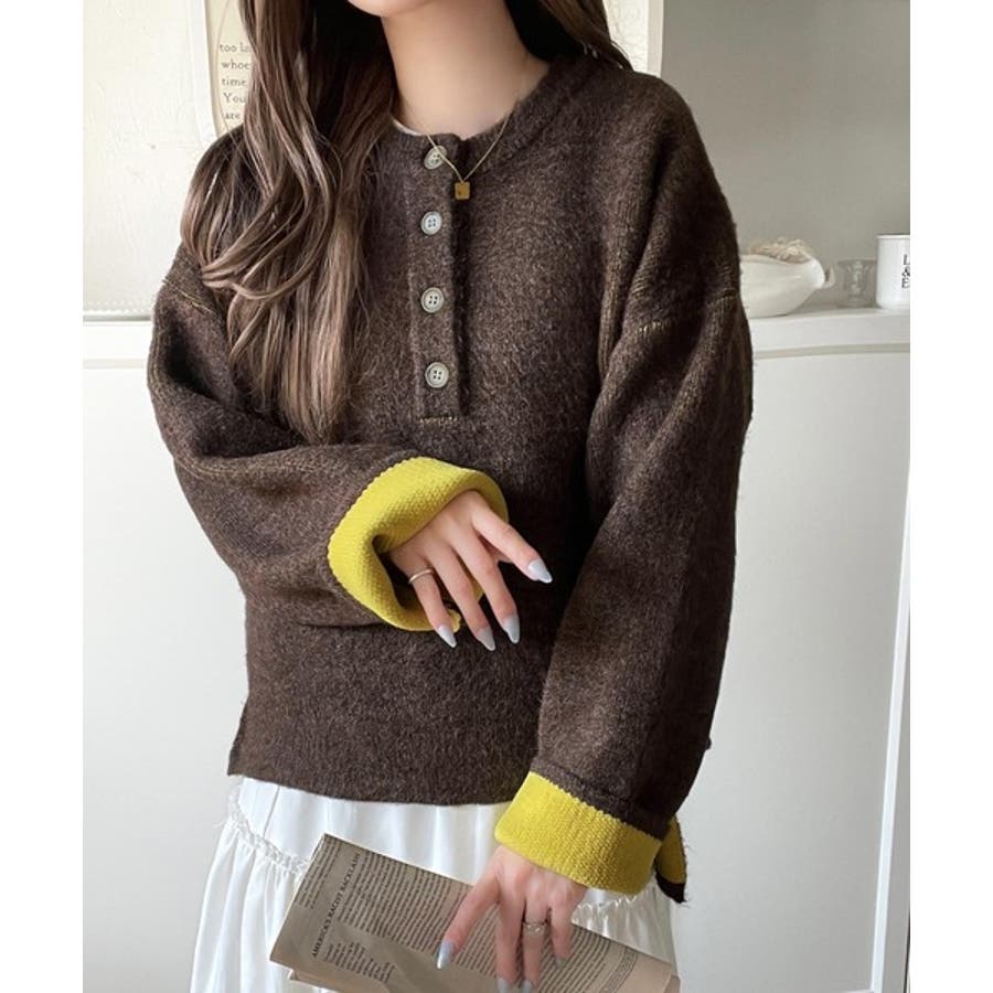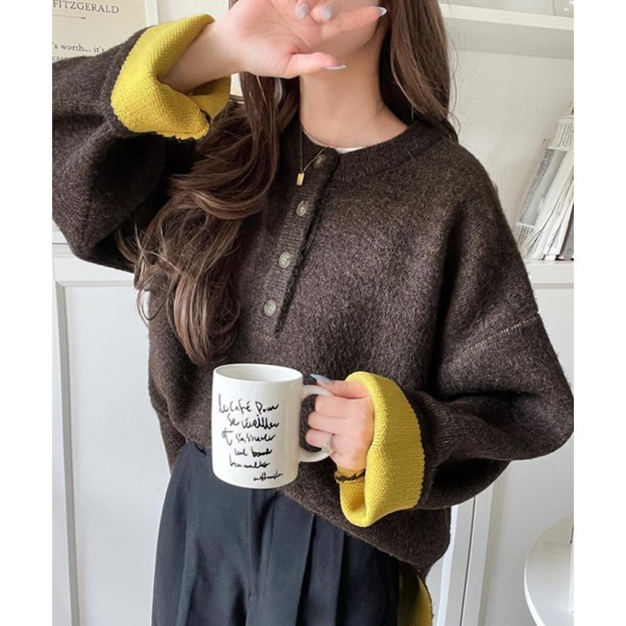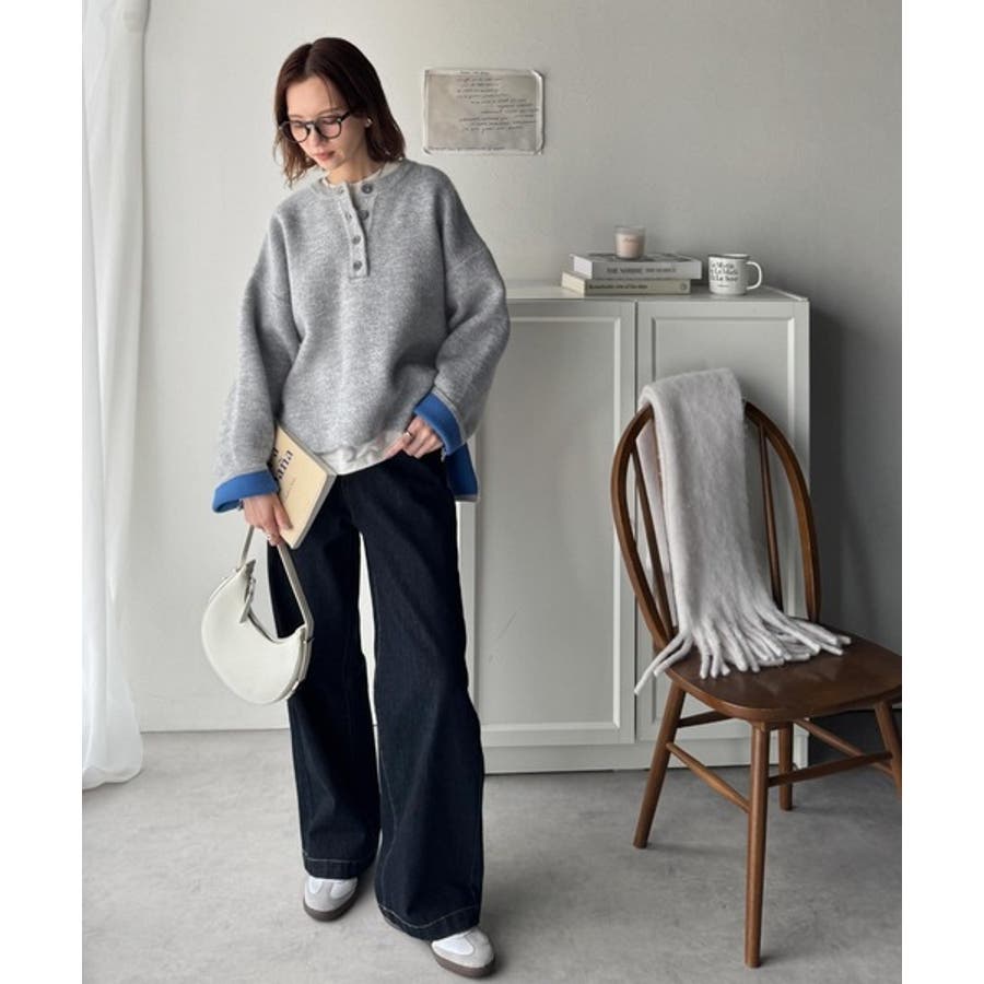 ・4つボタンがアクセントのヘンリーネック・前後差をつけたストレートラインの裾・折り返し可能な袖口の配色デザイン・軽い着心地のスウェットライクニット・同素材シリーズの展開あり