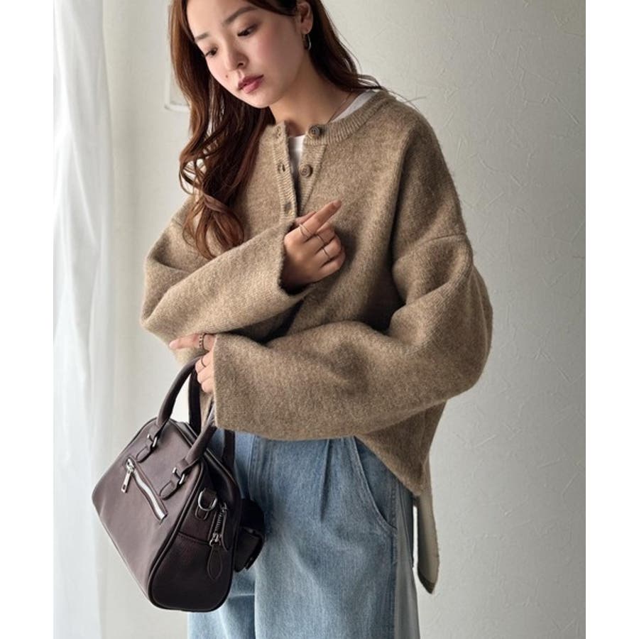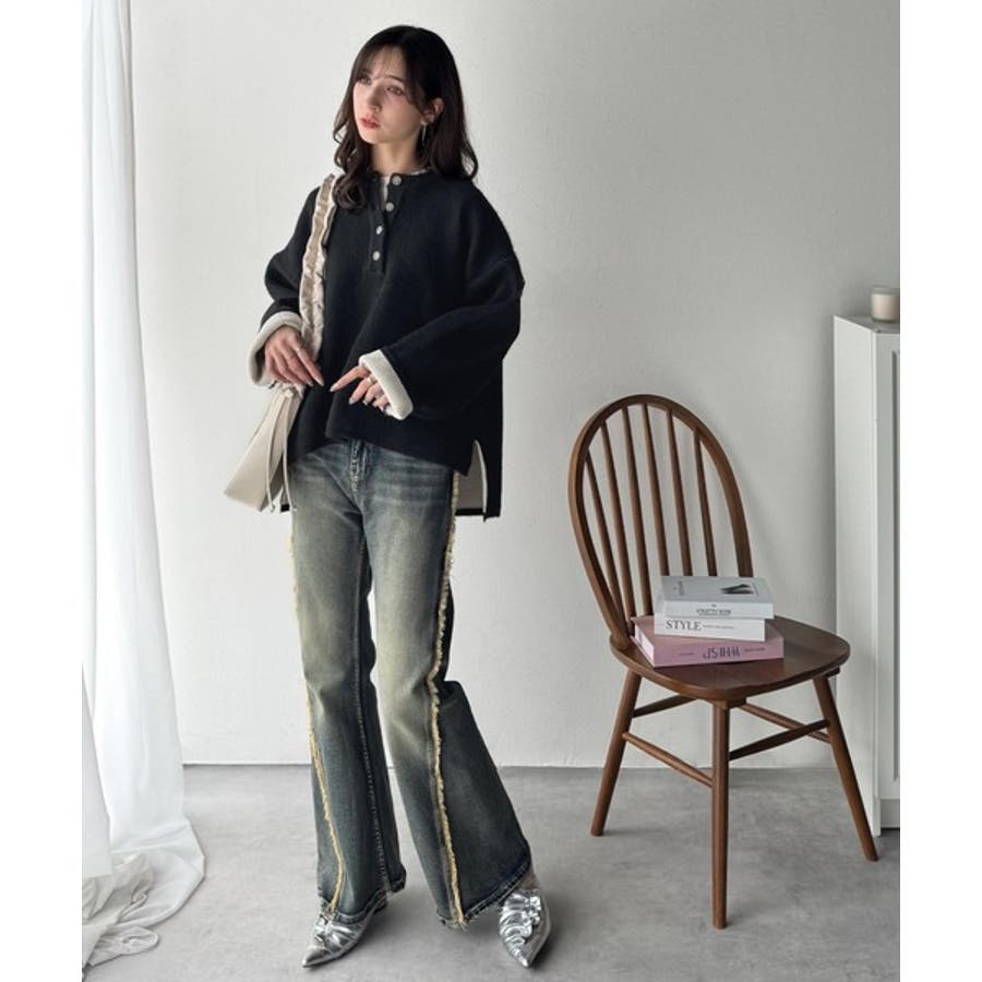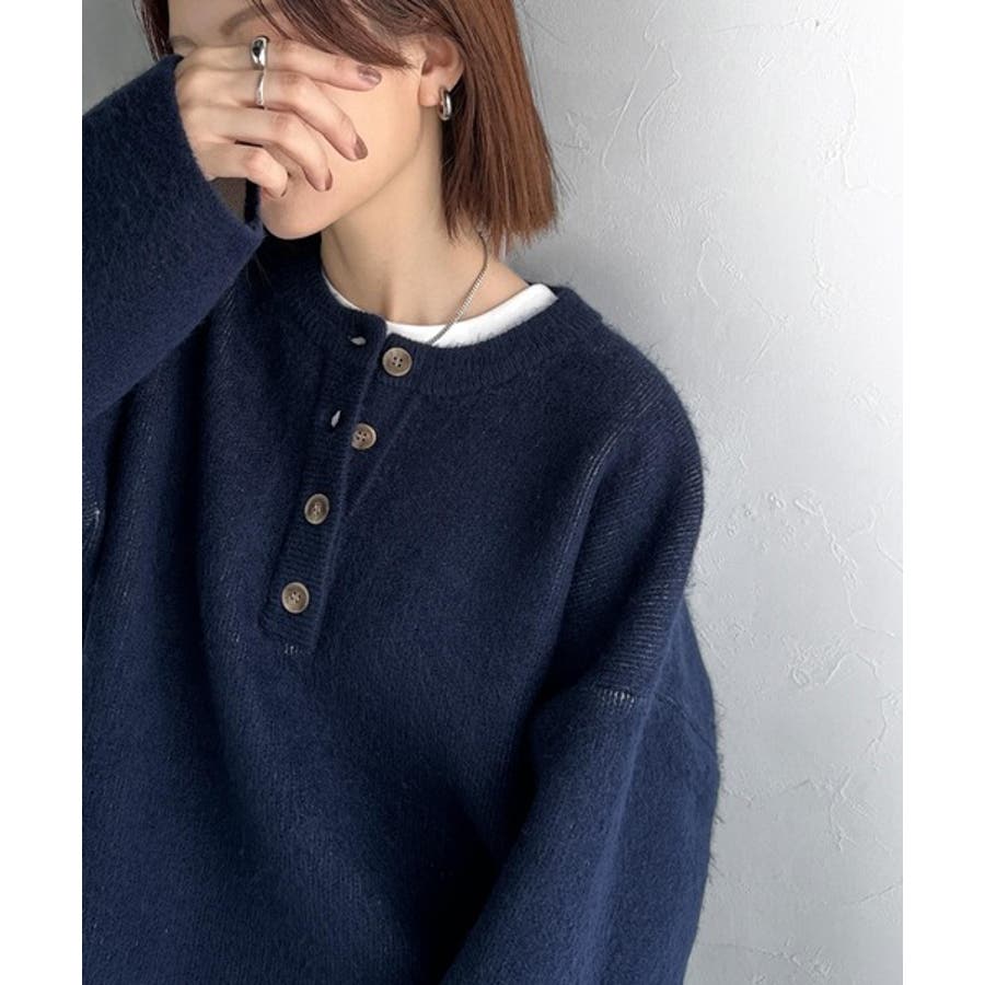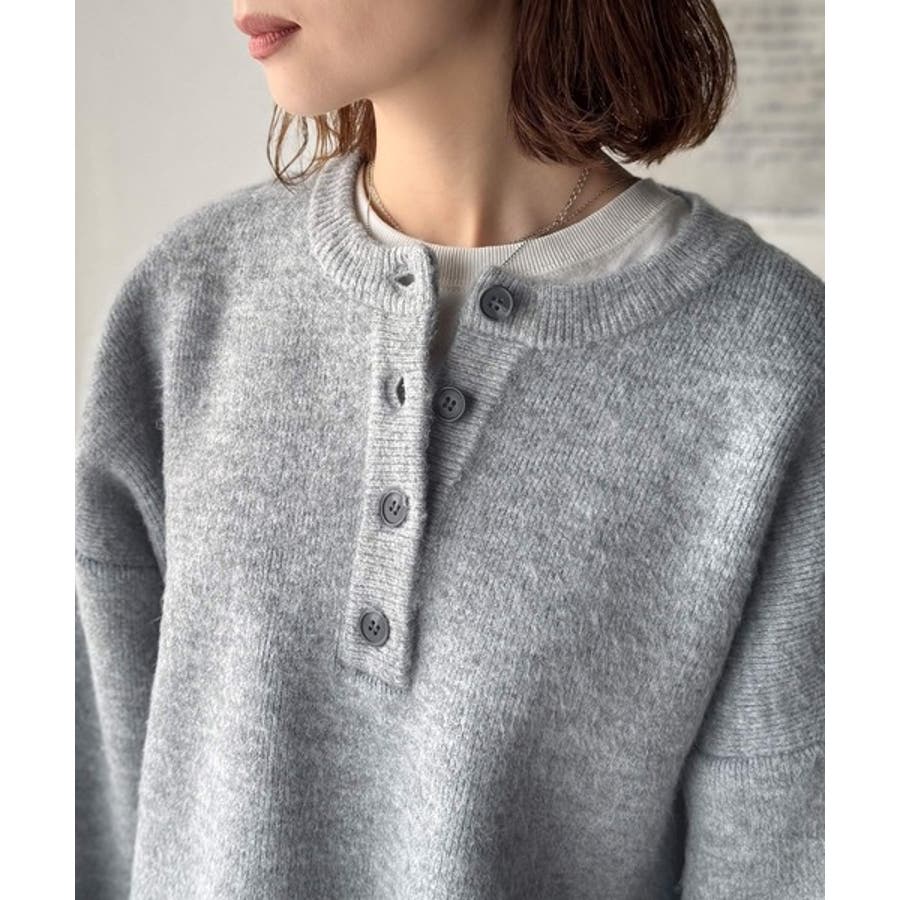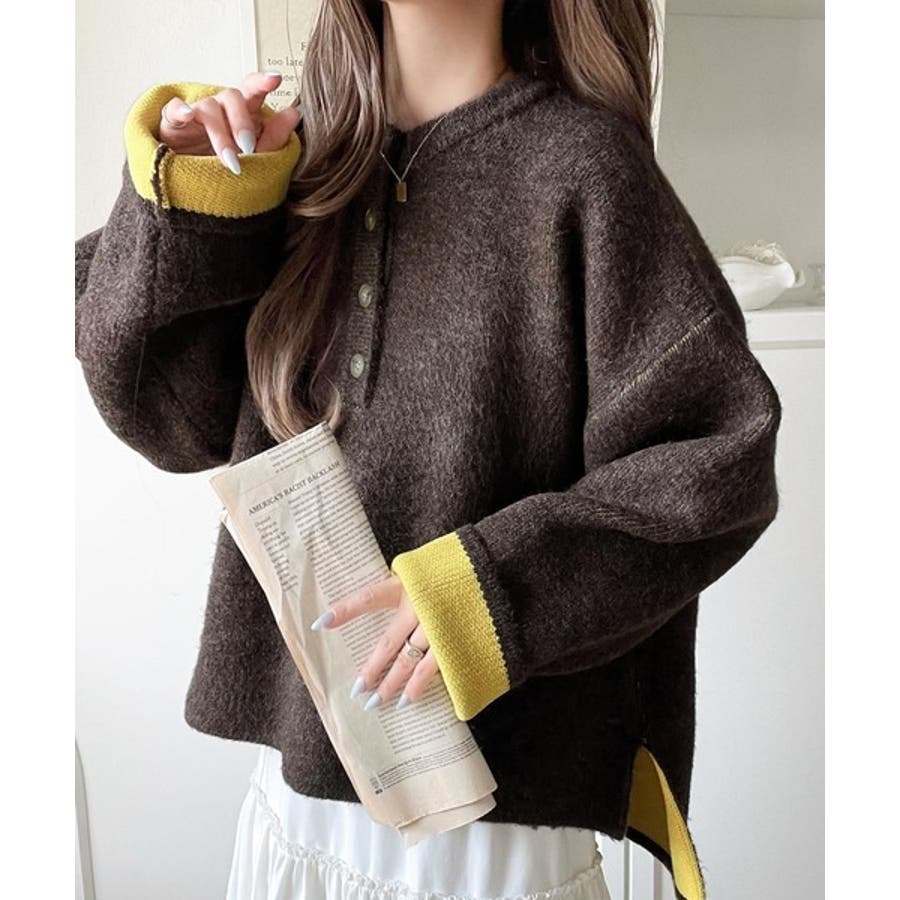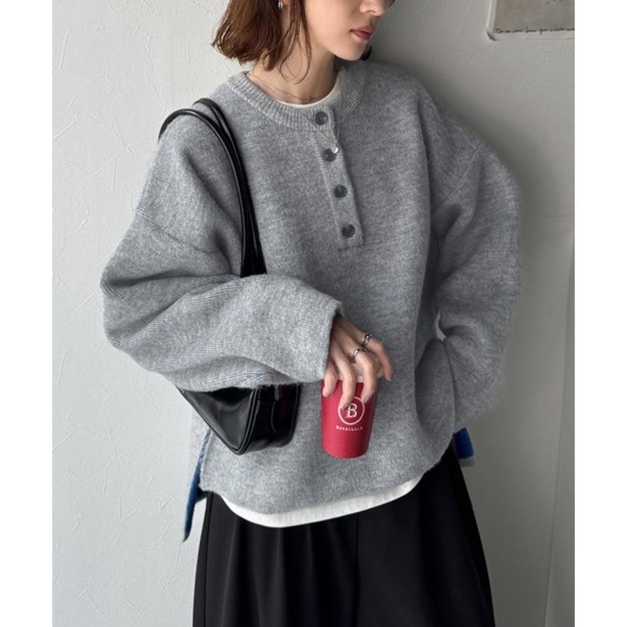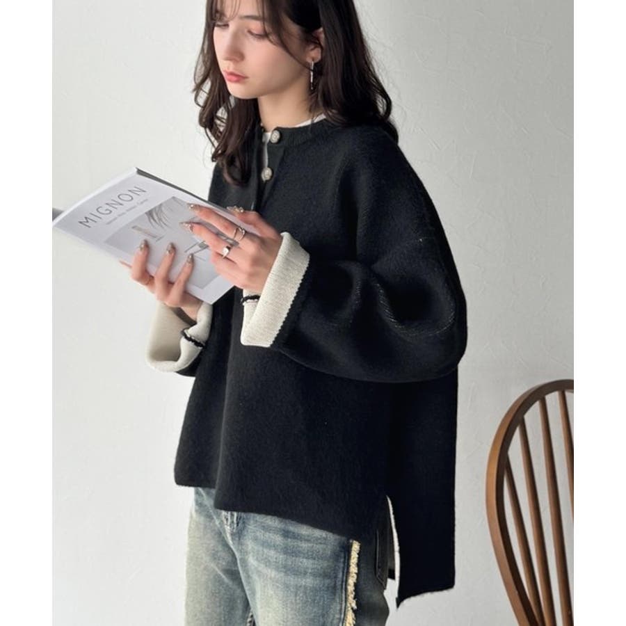 ・4つボタンがアクセントのヘンリーネック・前後差をつけたストレートラインの裾・折り返し可能な袖口の配色デザイン・軽い着心地のスウェットライクニット・同素材シリーズの展開あり