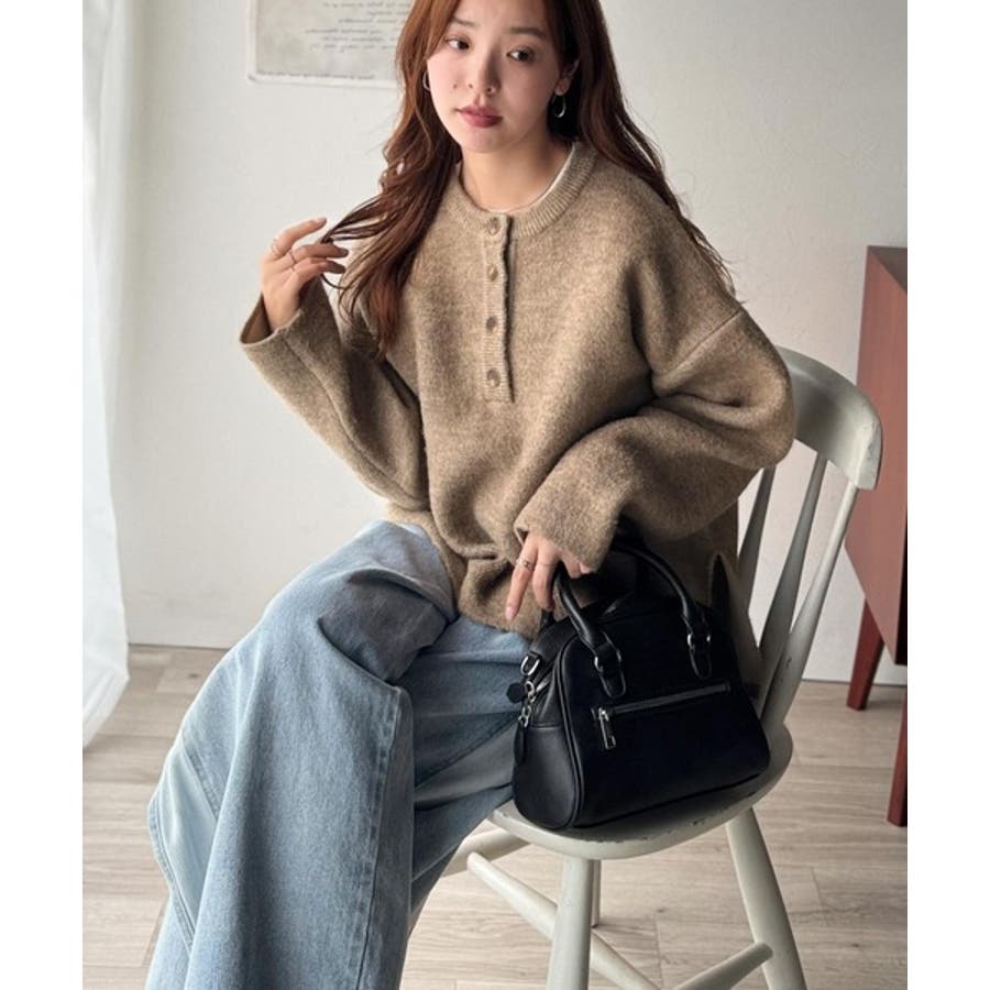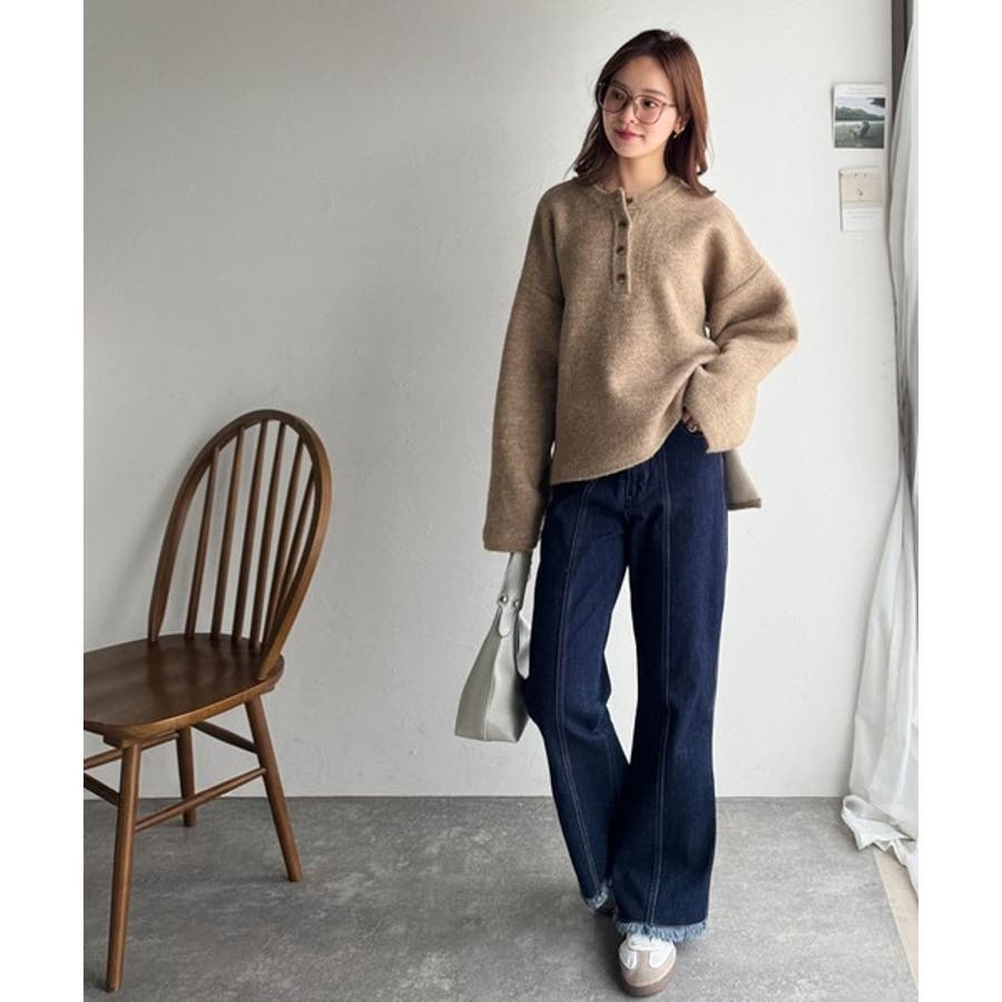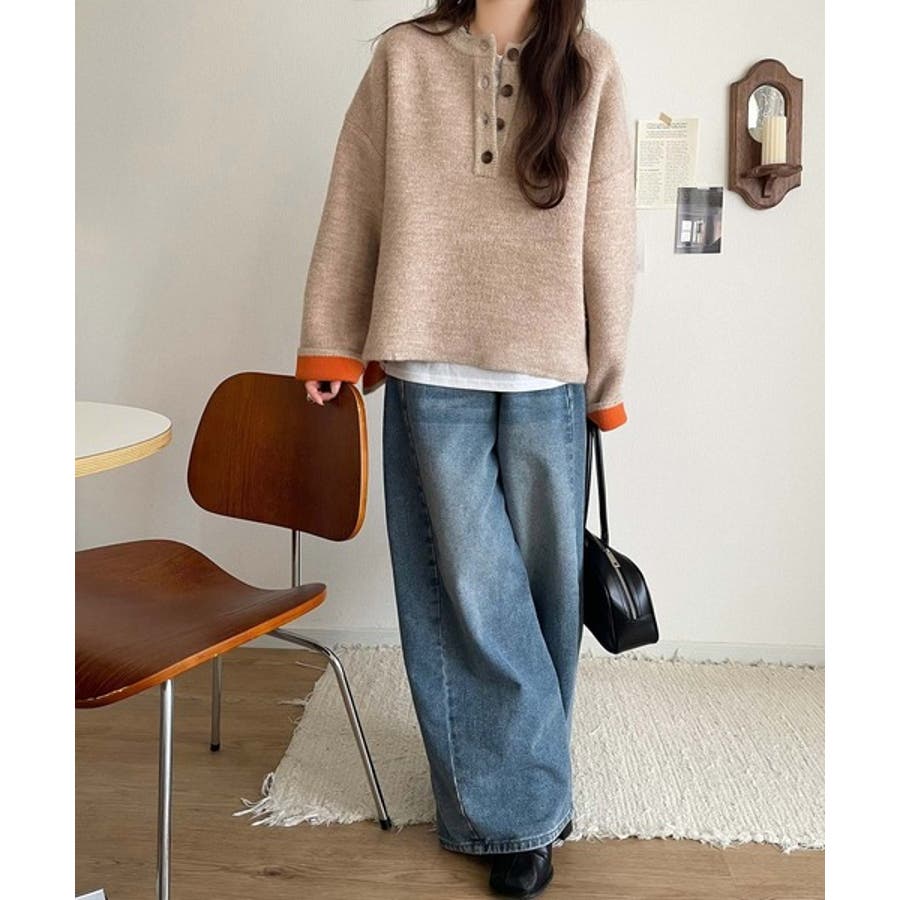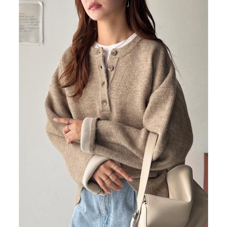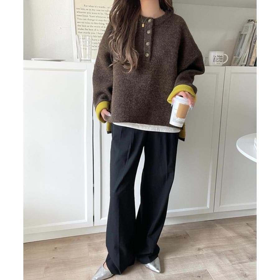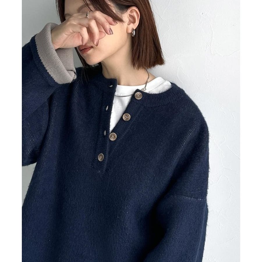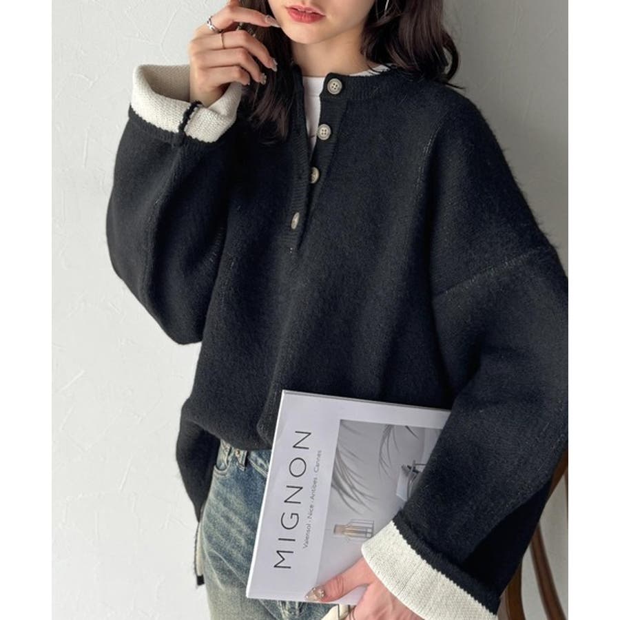 着回し力のあるヘンリーネック配色ニットプルオーバー。