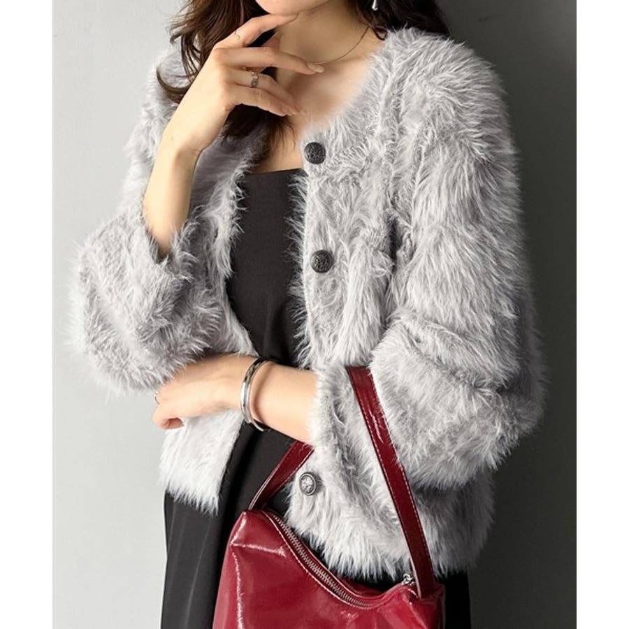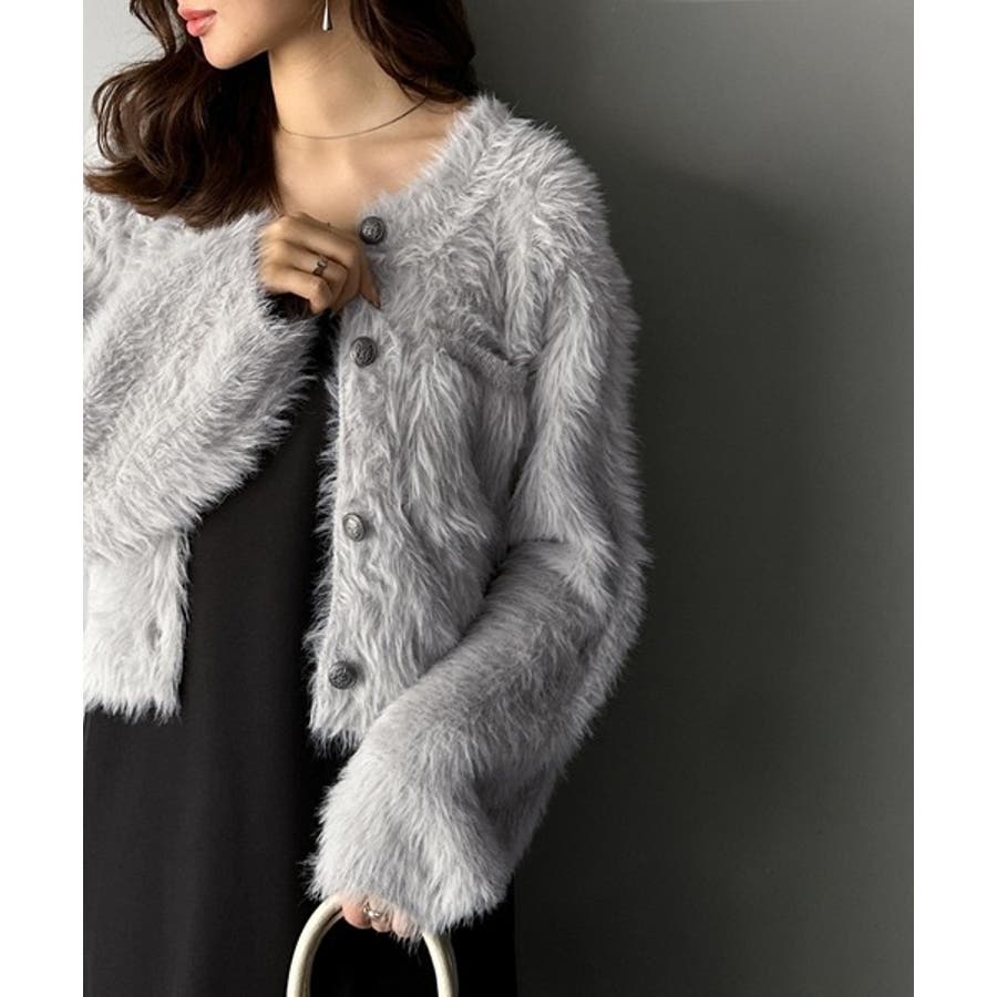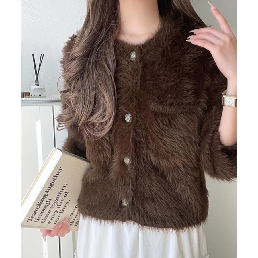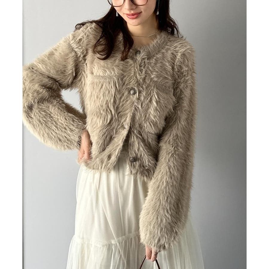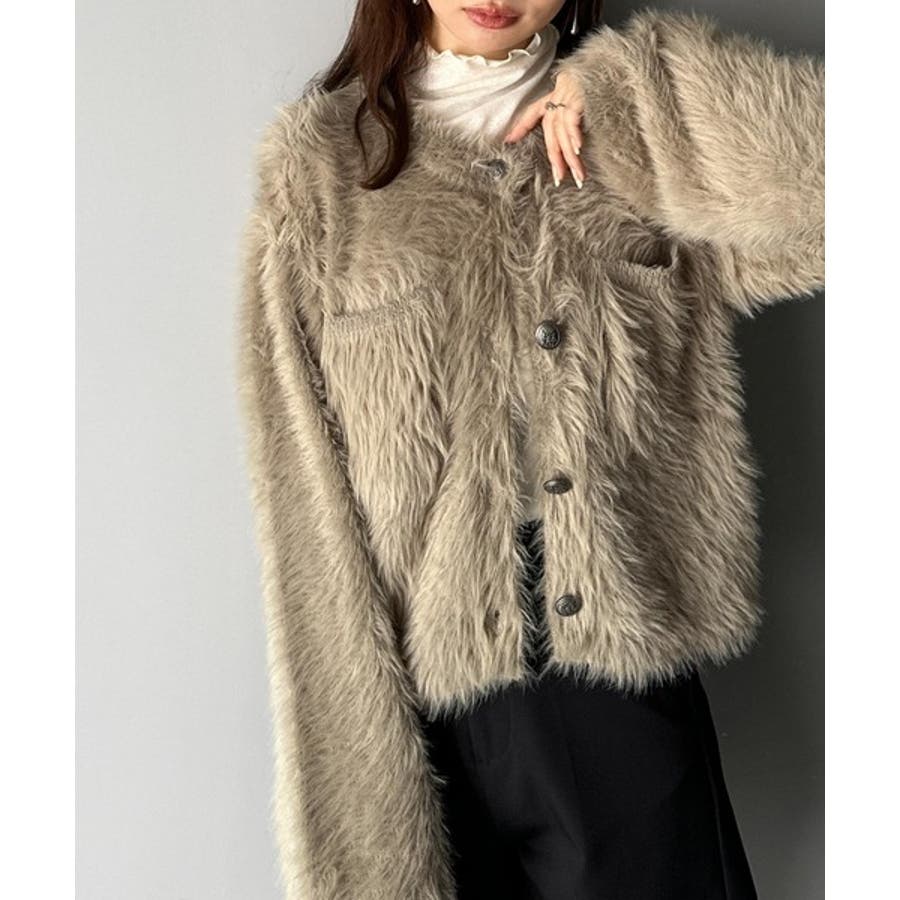 毛足の長いシャギーニットをたっぷり使用したクルーネックカーディガン。