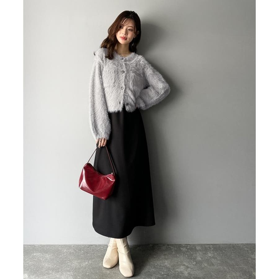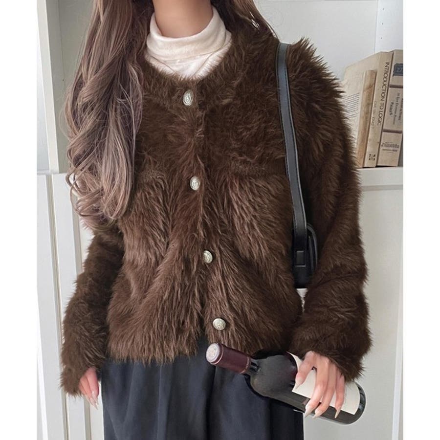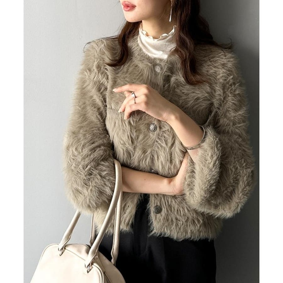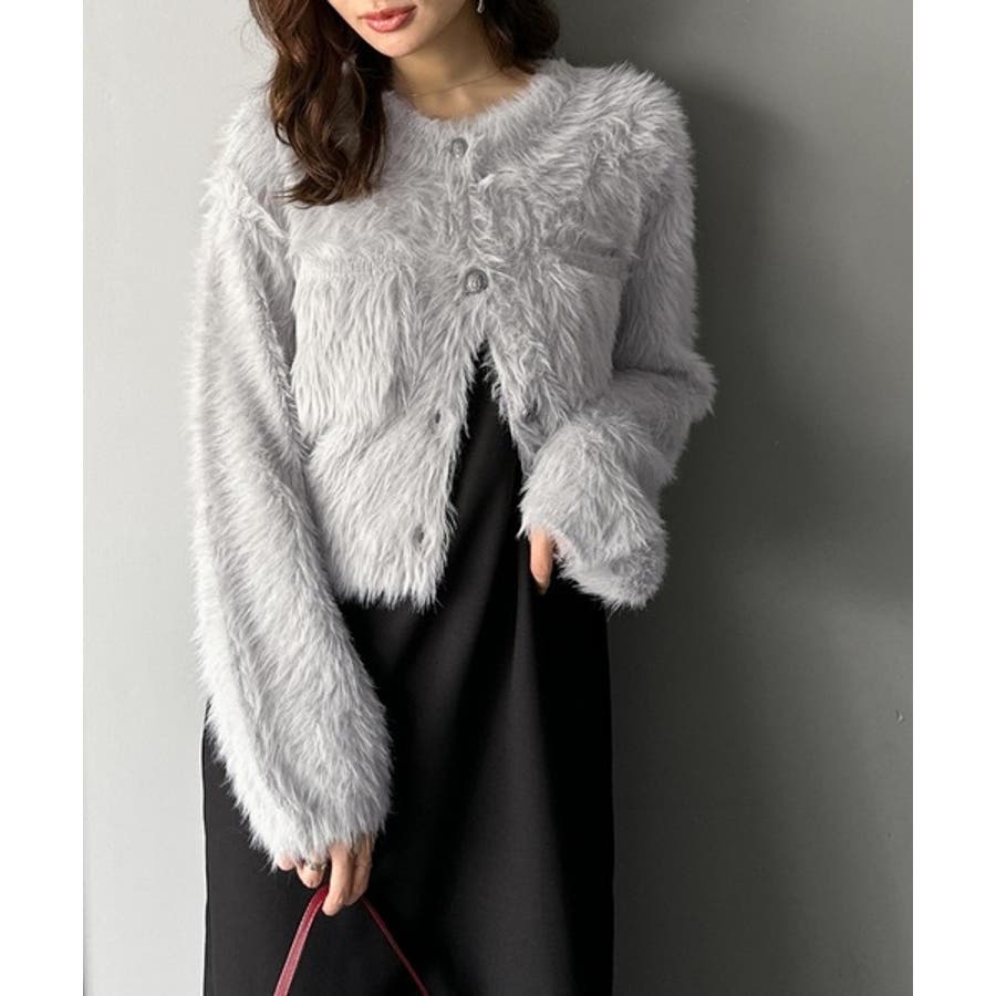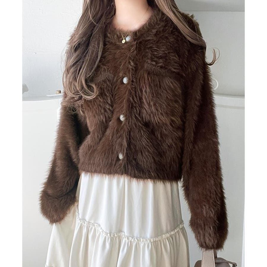 毛足の長いシャギーニットをたっぷり使用したクルーネックカーディガン。