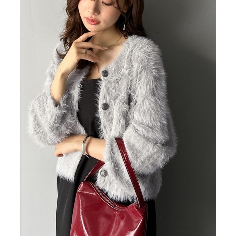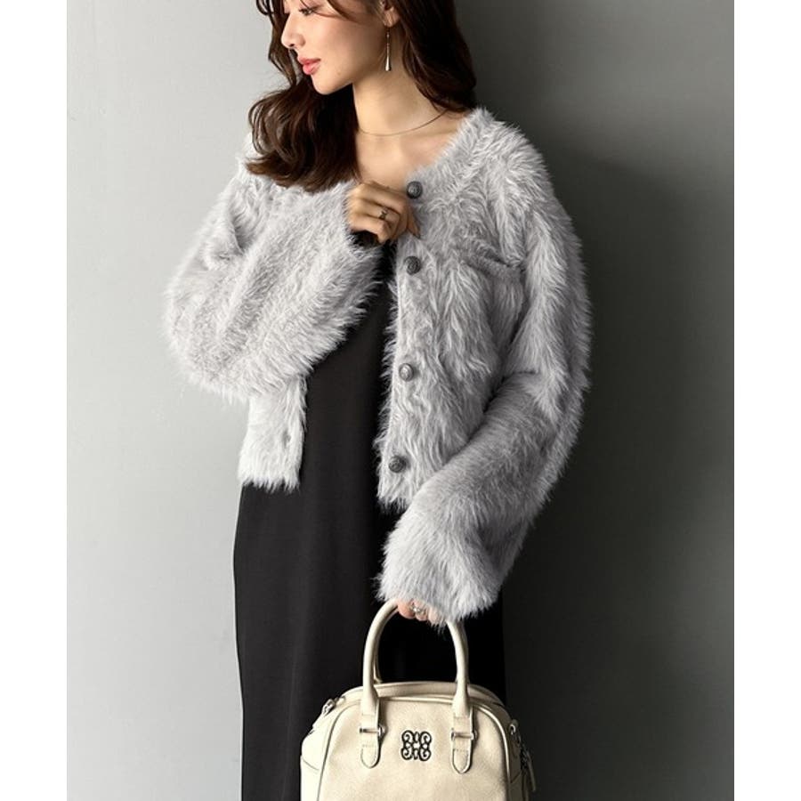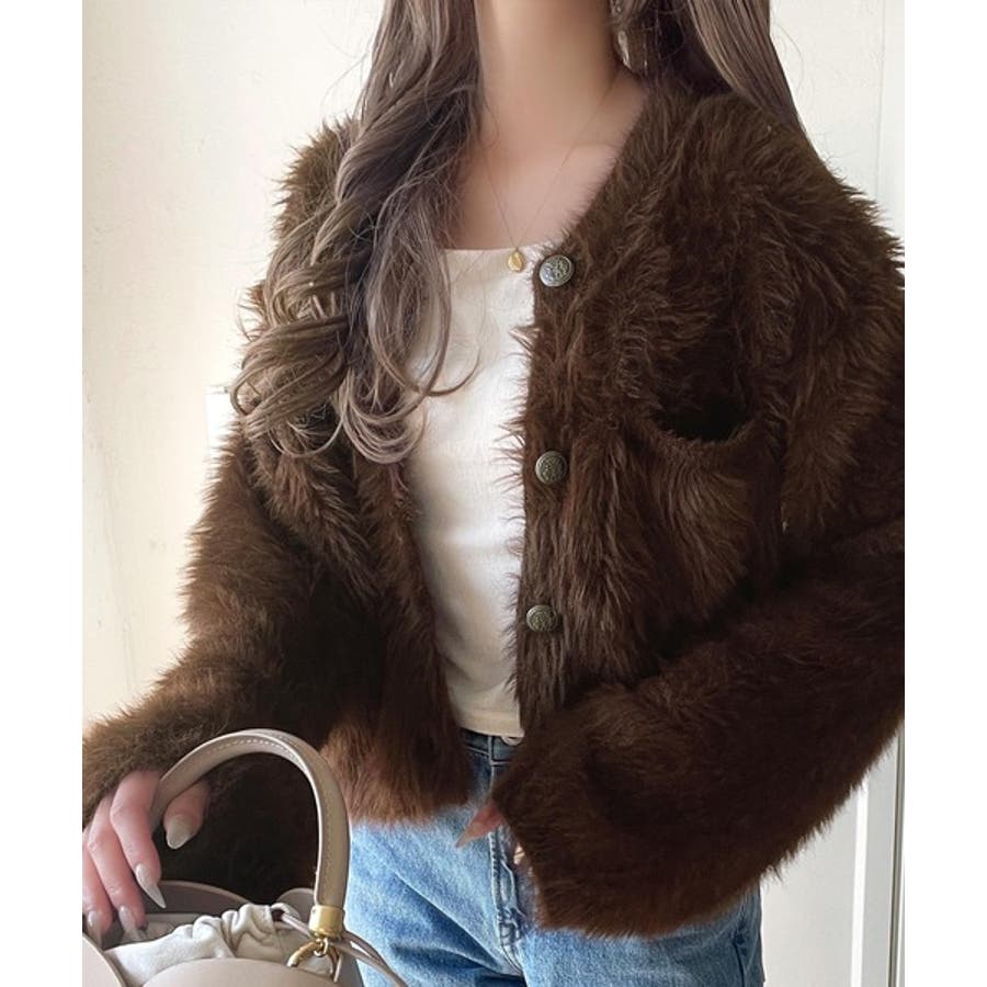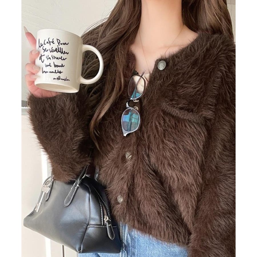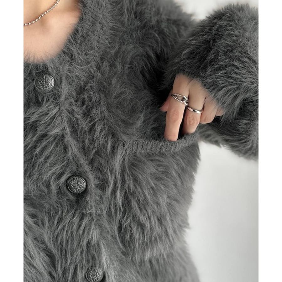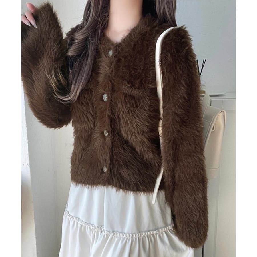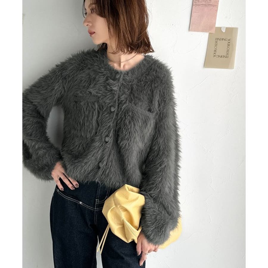 毛足の長いシャギーニットを使用したカーディガン。