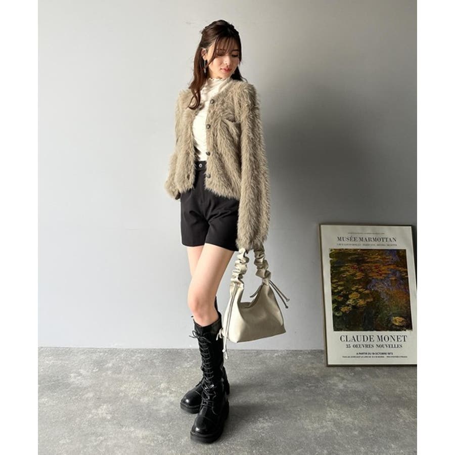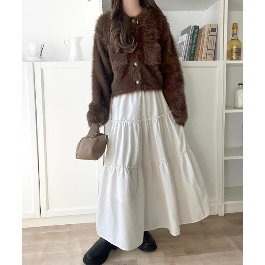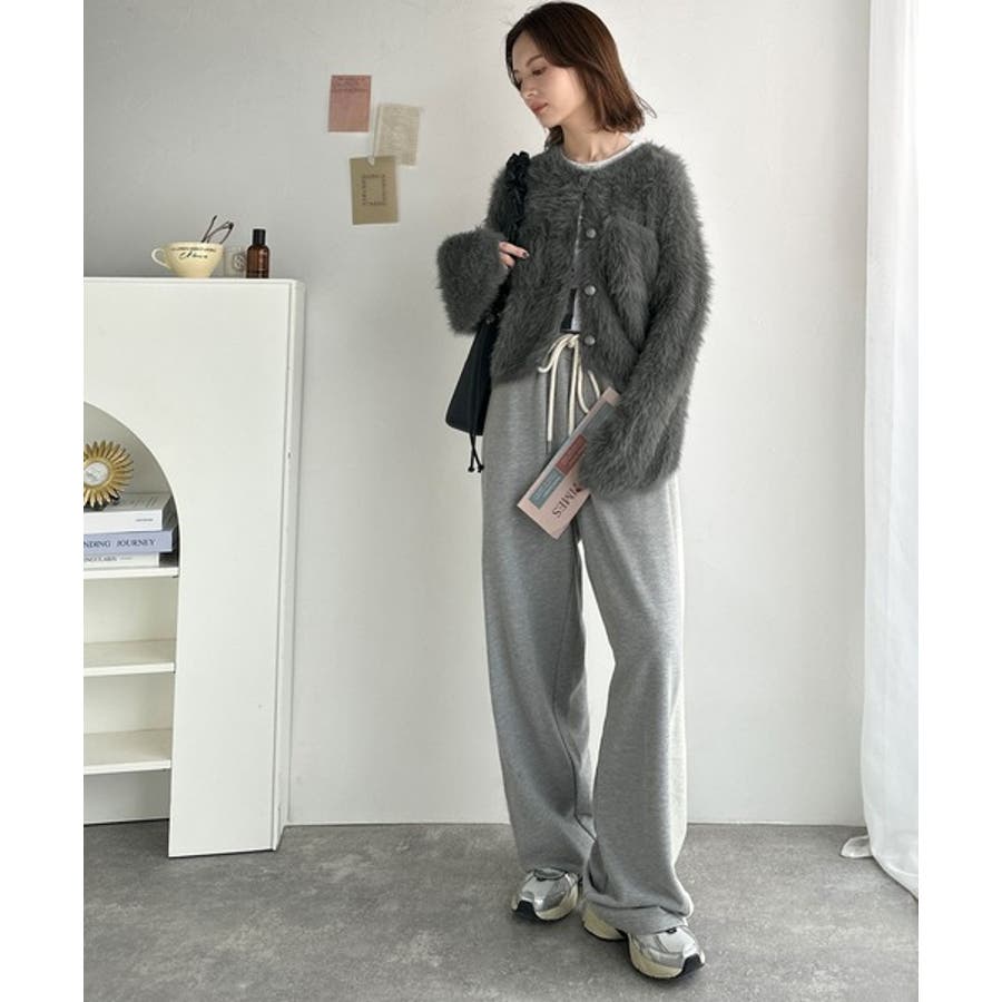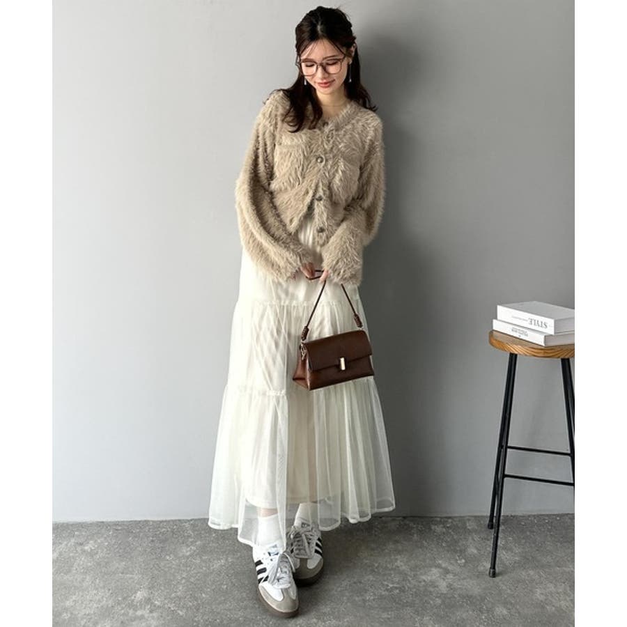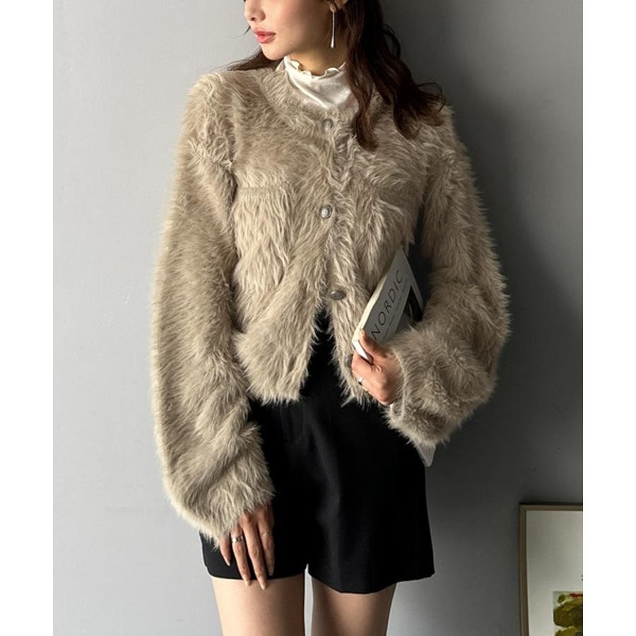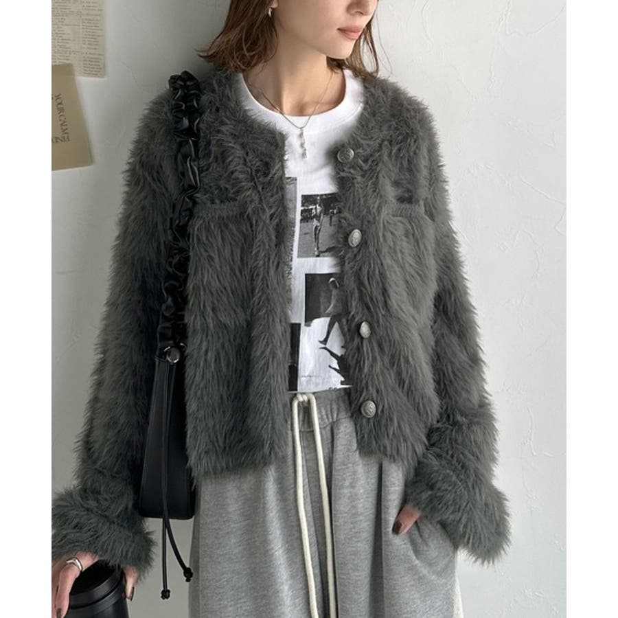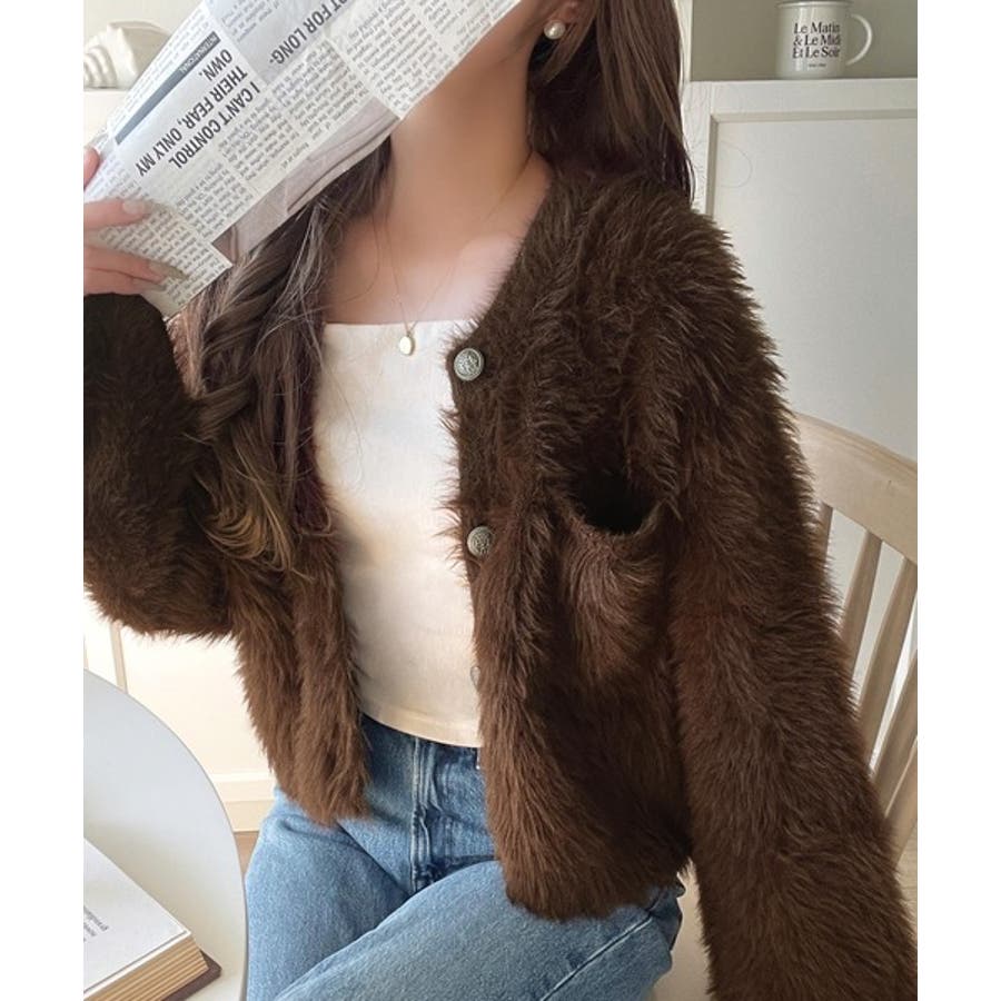 毛足の長いシャギーニットを使用したカーディガン。