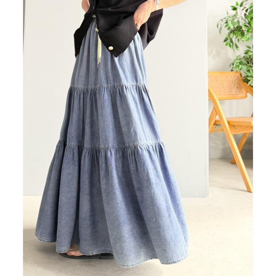 ヴィンテージ感漂う。綿100% シワ加工デニムティアードスカート