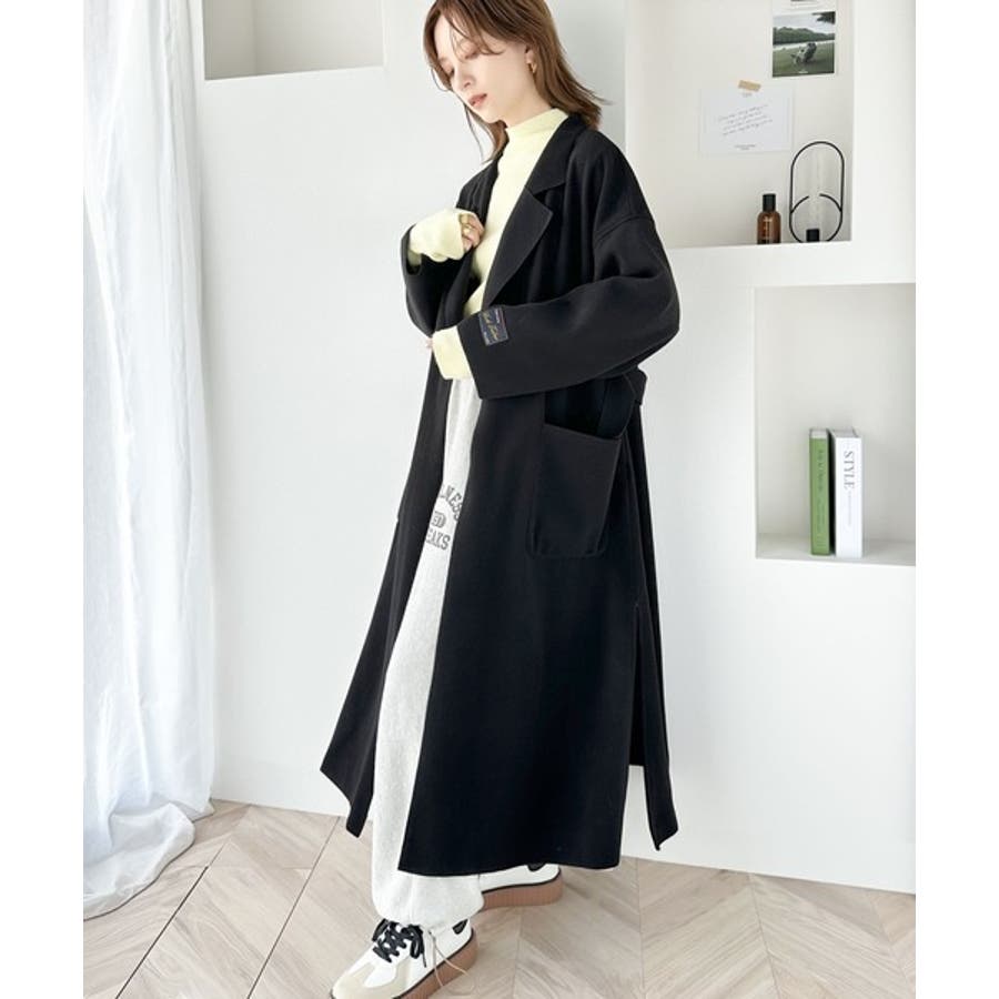 【ブラック】ベルト付無地ロング丈テーラードオーバーコート