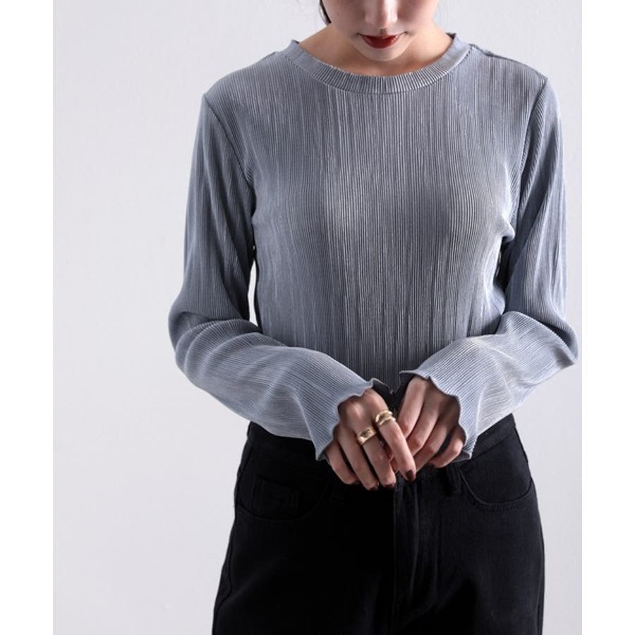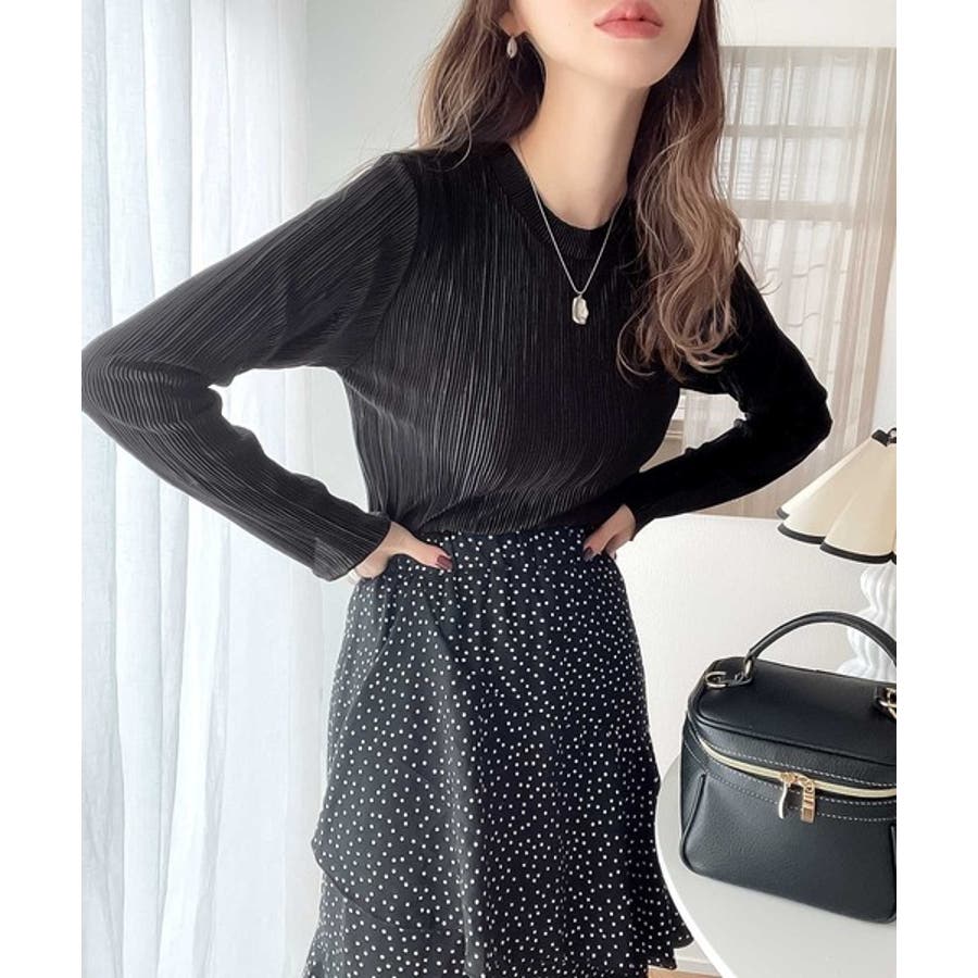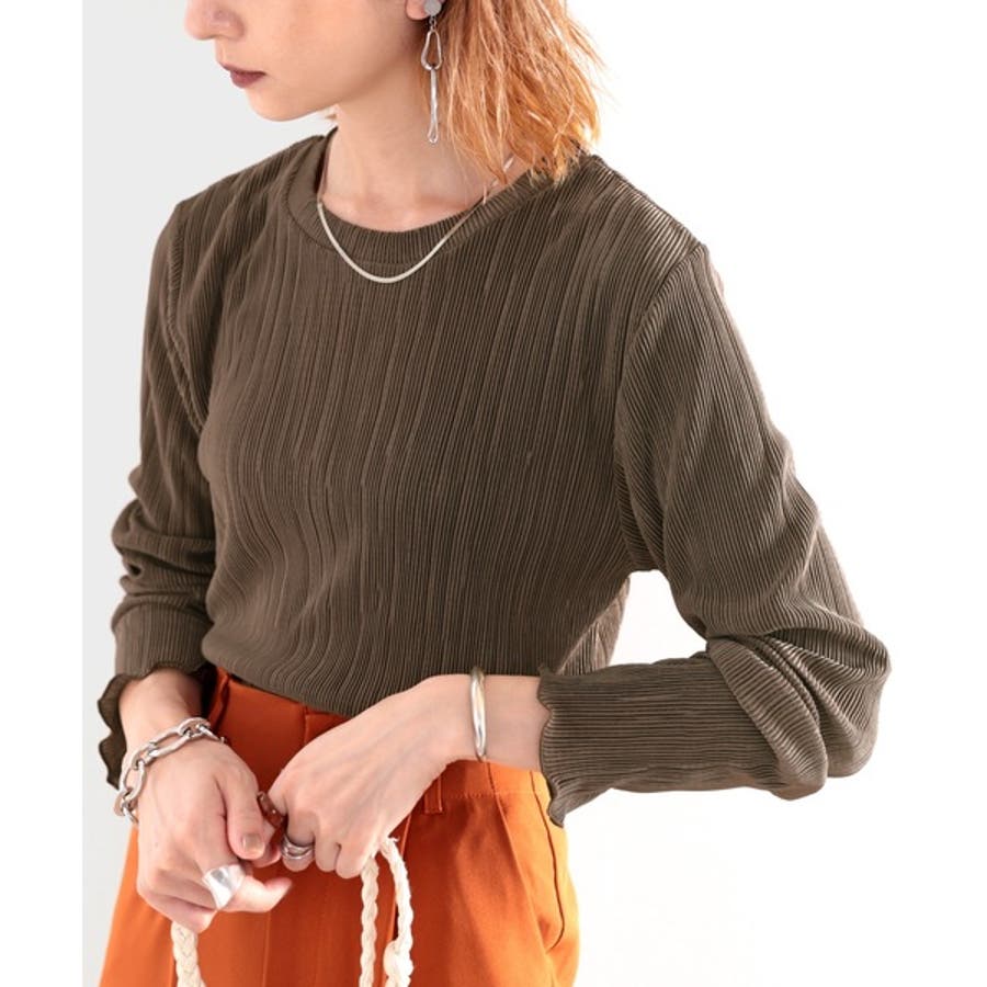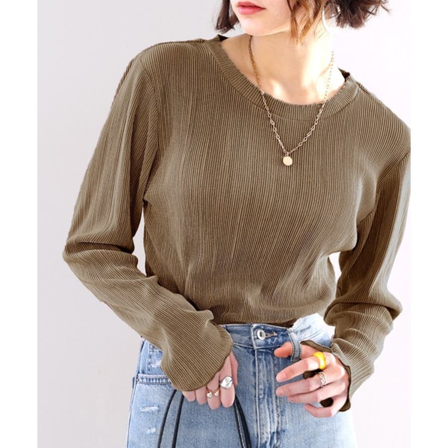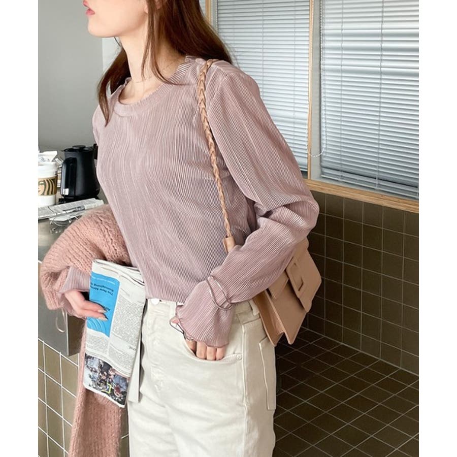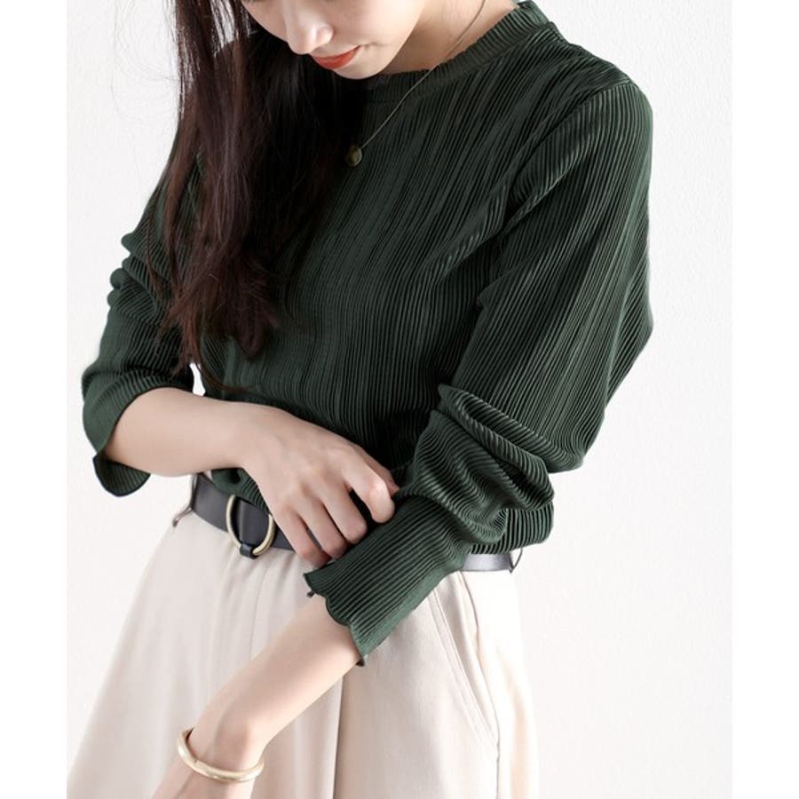 ラウンドネックミドル丈ミニプリーツ袖メローリブブラウス(長袖)