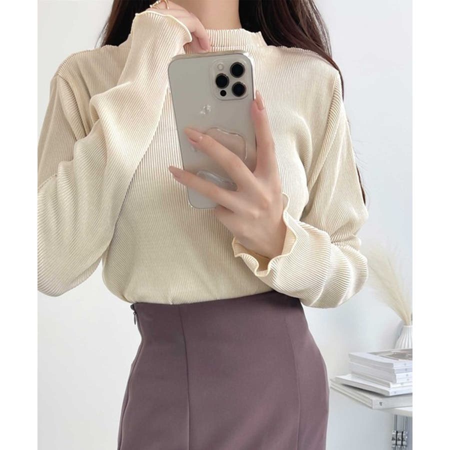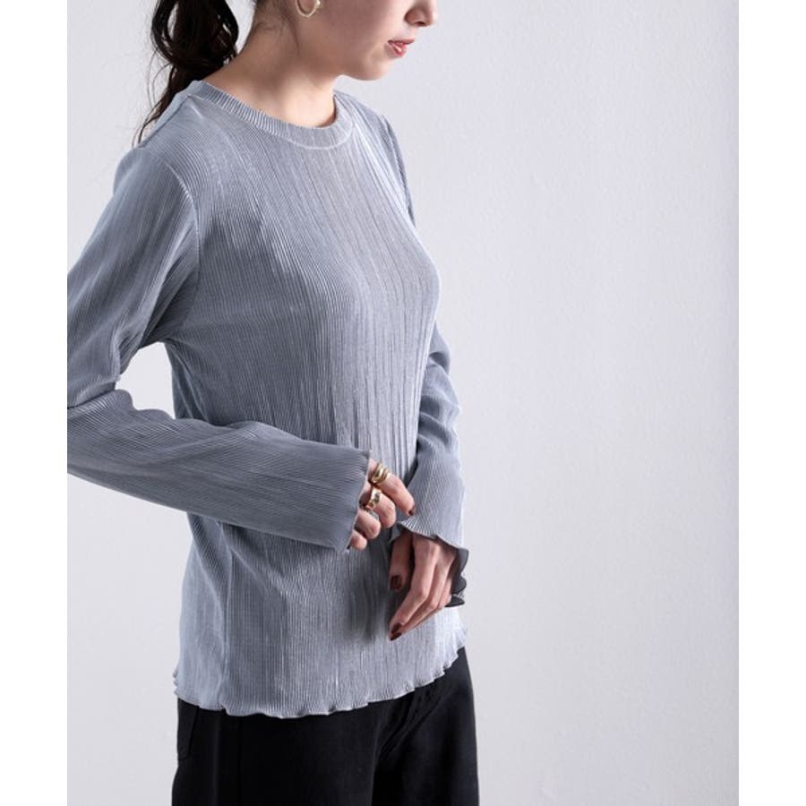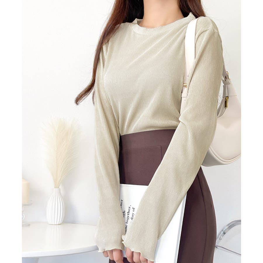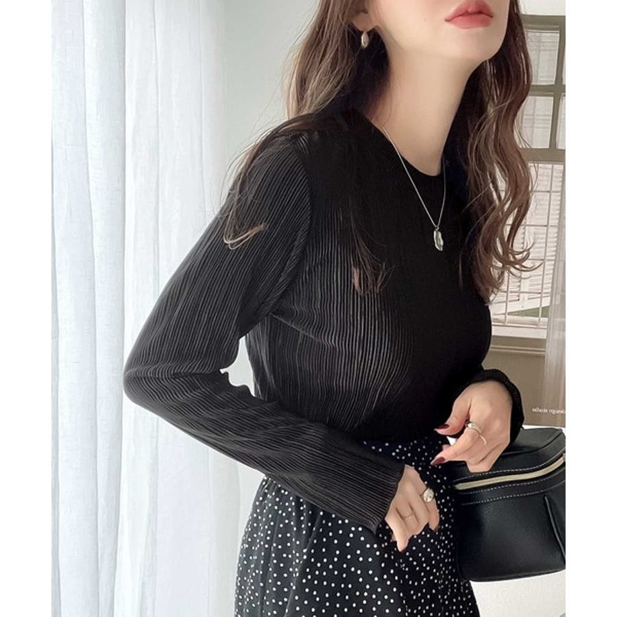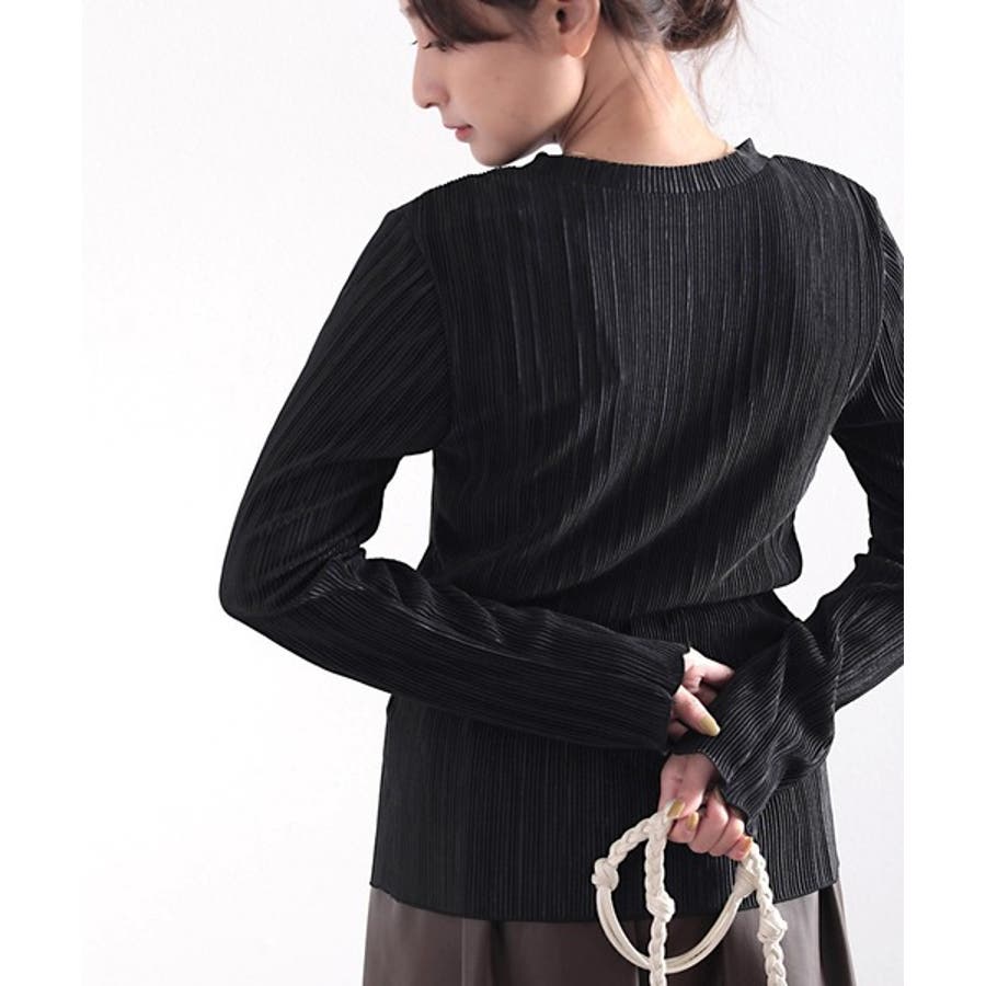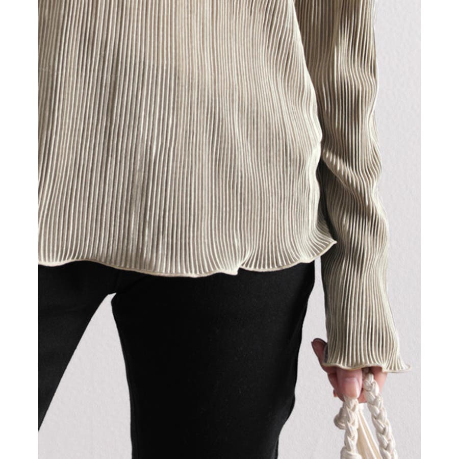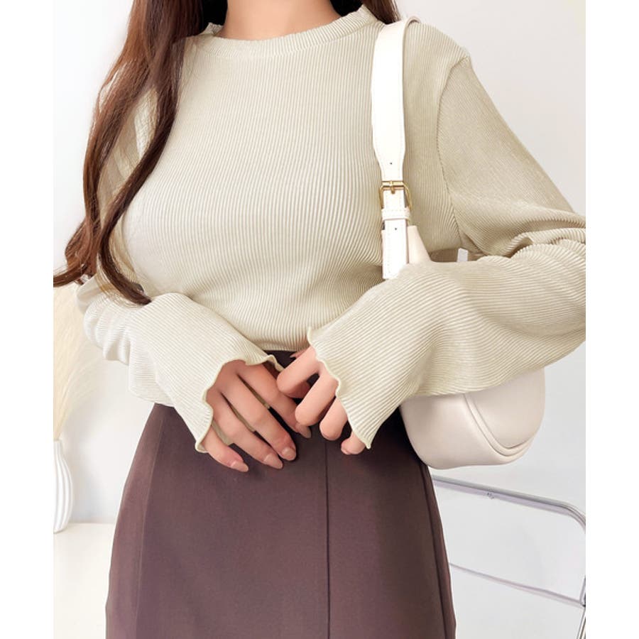 ラウンドネックミドル丈ミニプリーツ袖メローリブブラウス(長袖)