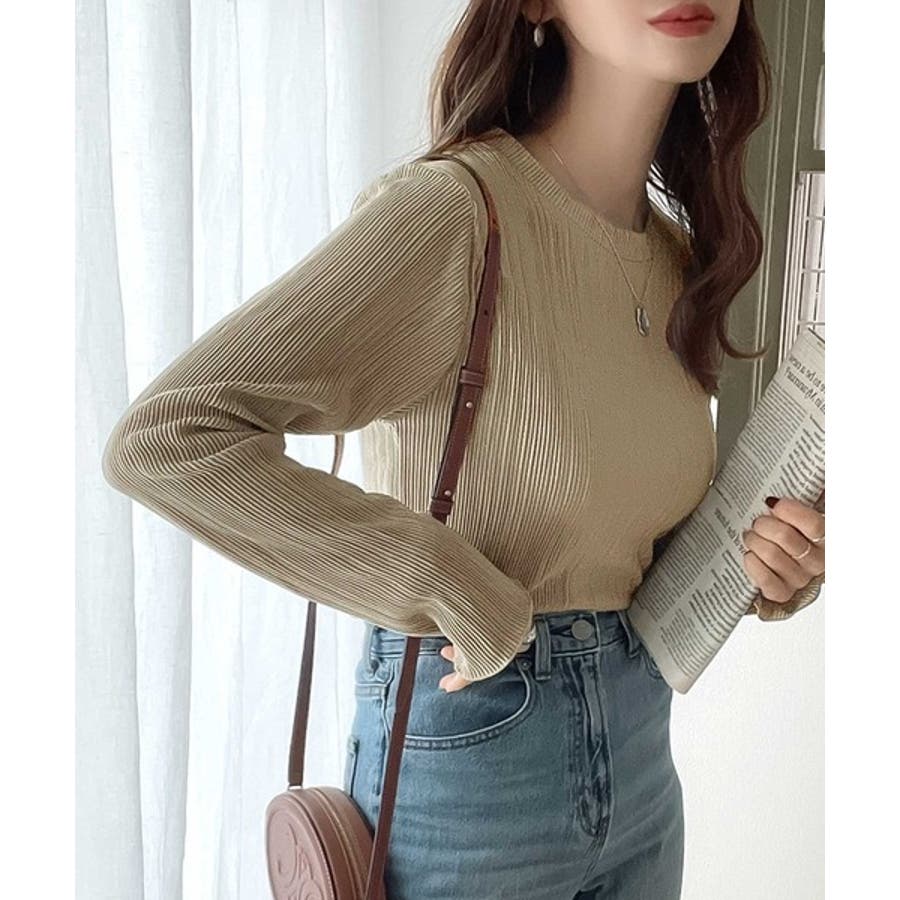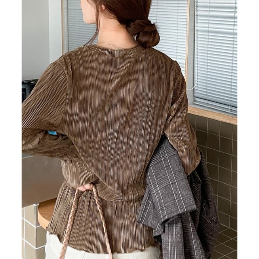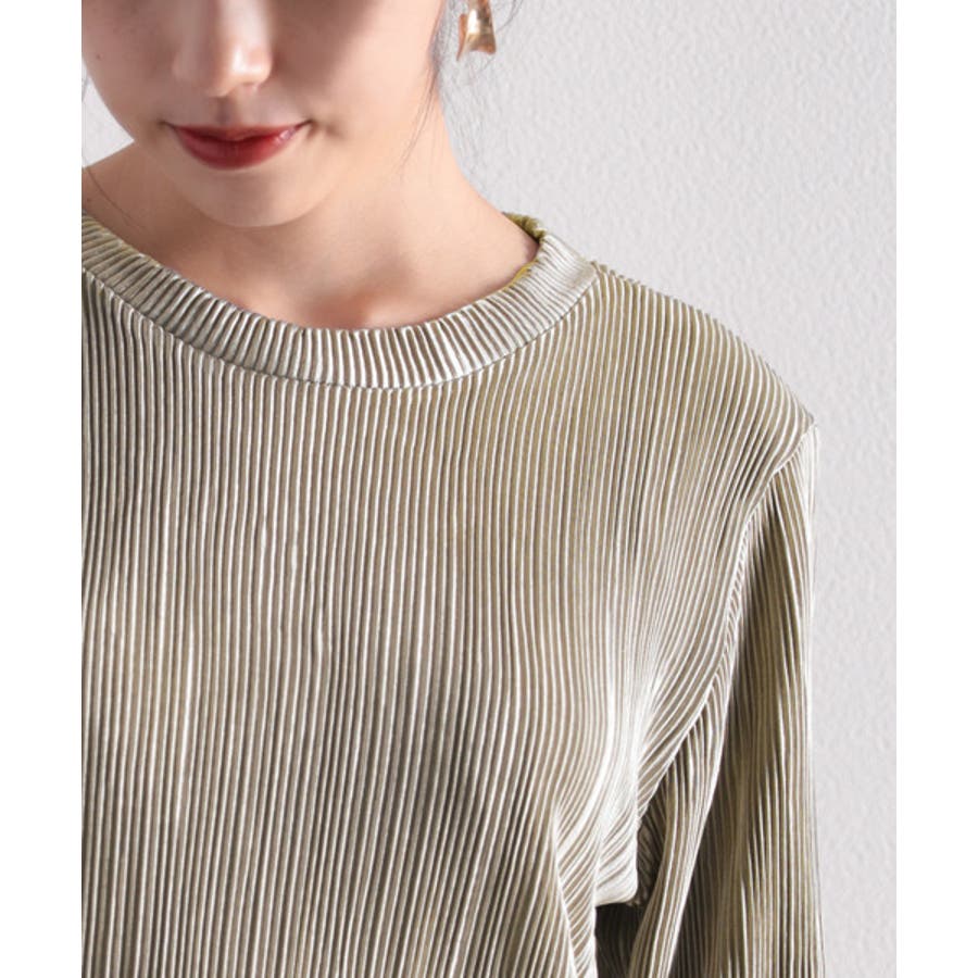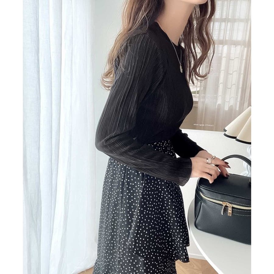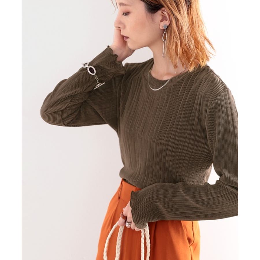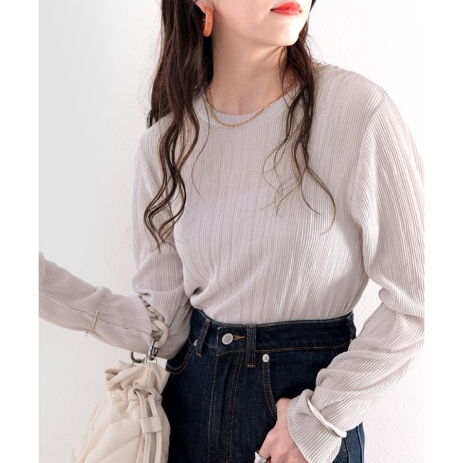 ラウンドネックミドル丈ミニプリーツ袖メローリブブラウス(長袖)