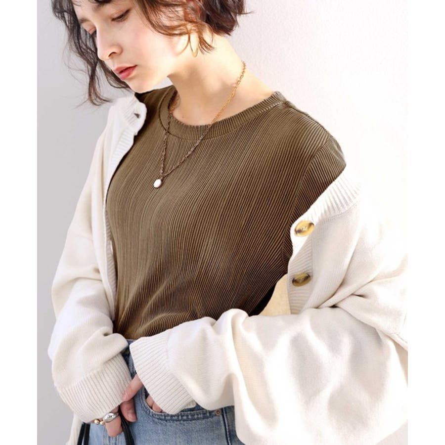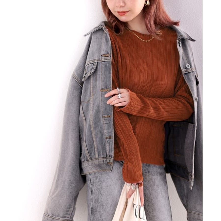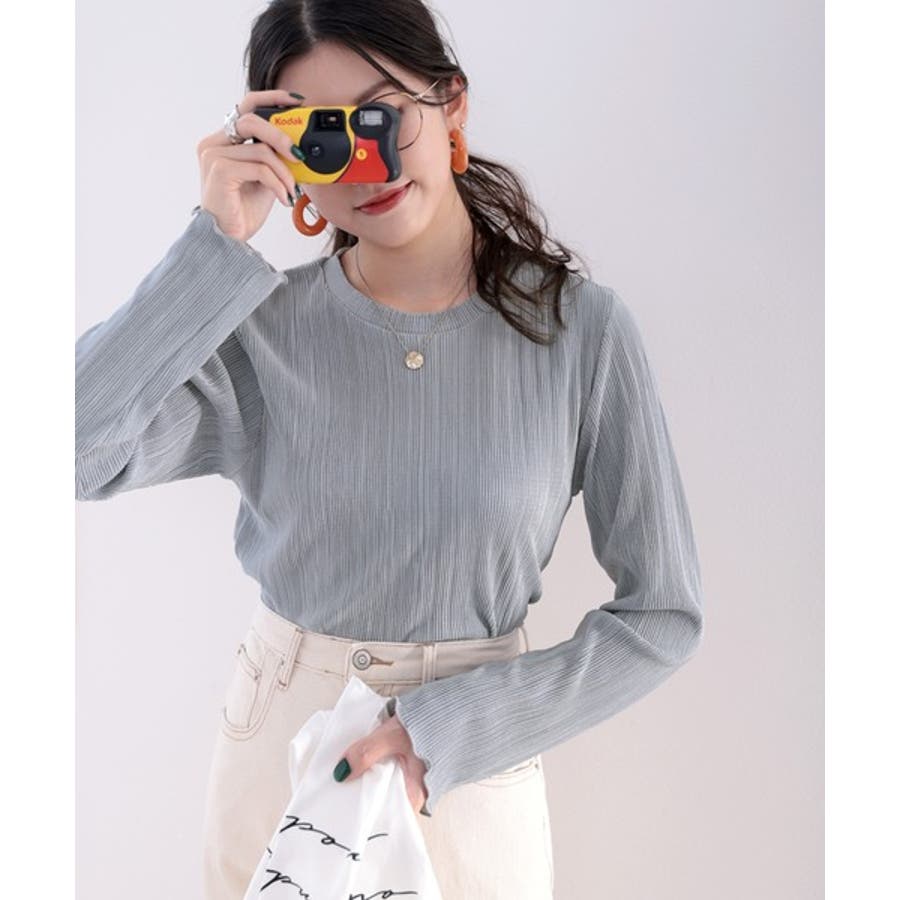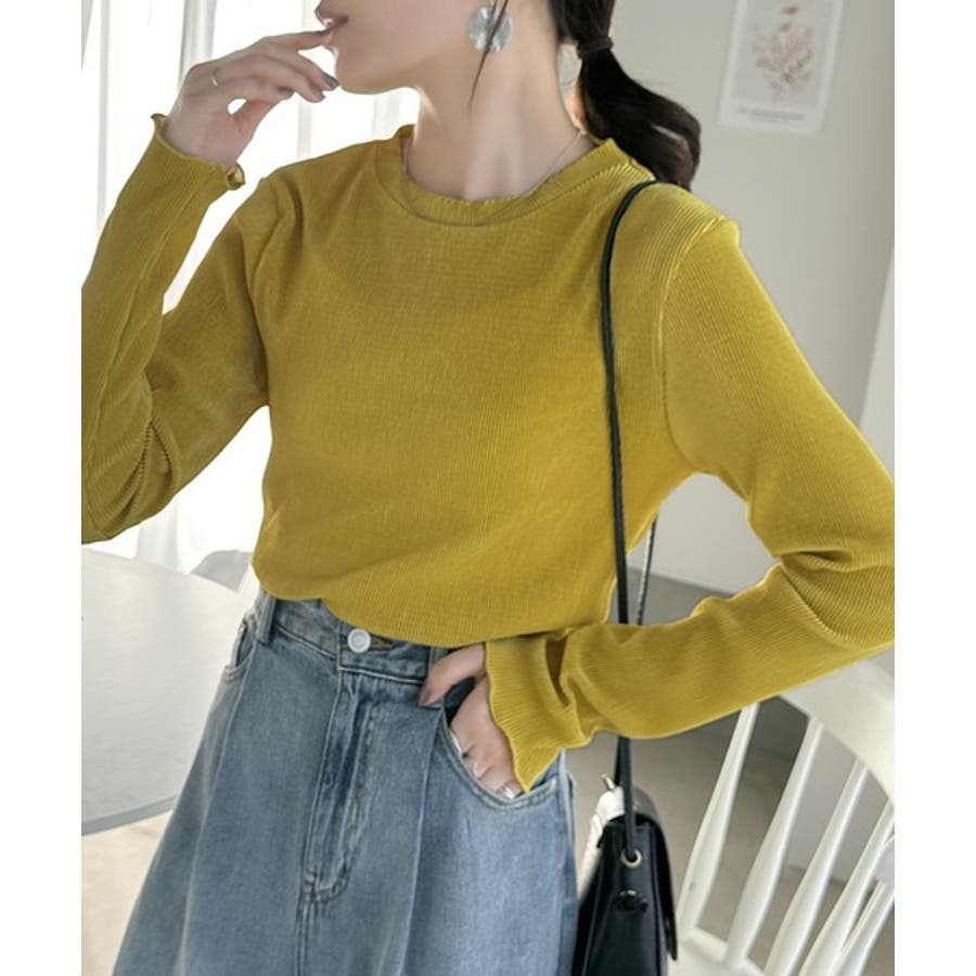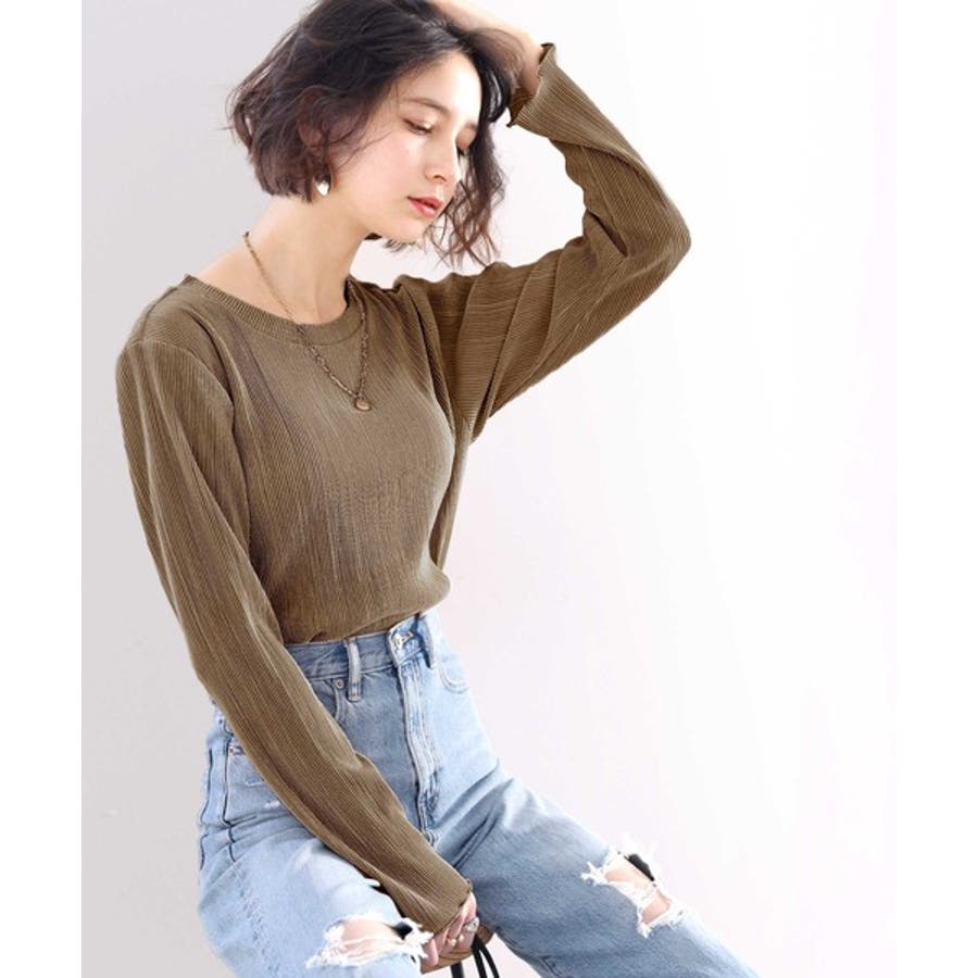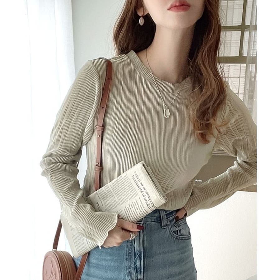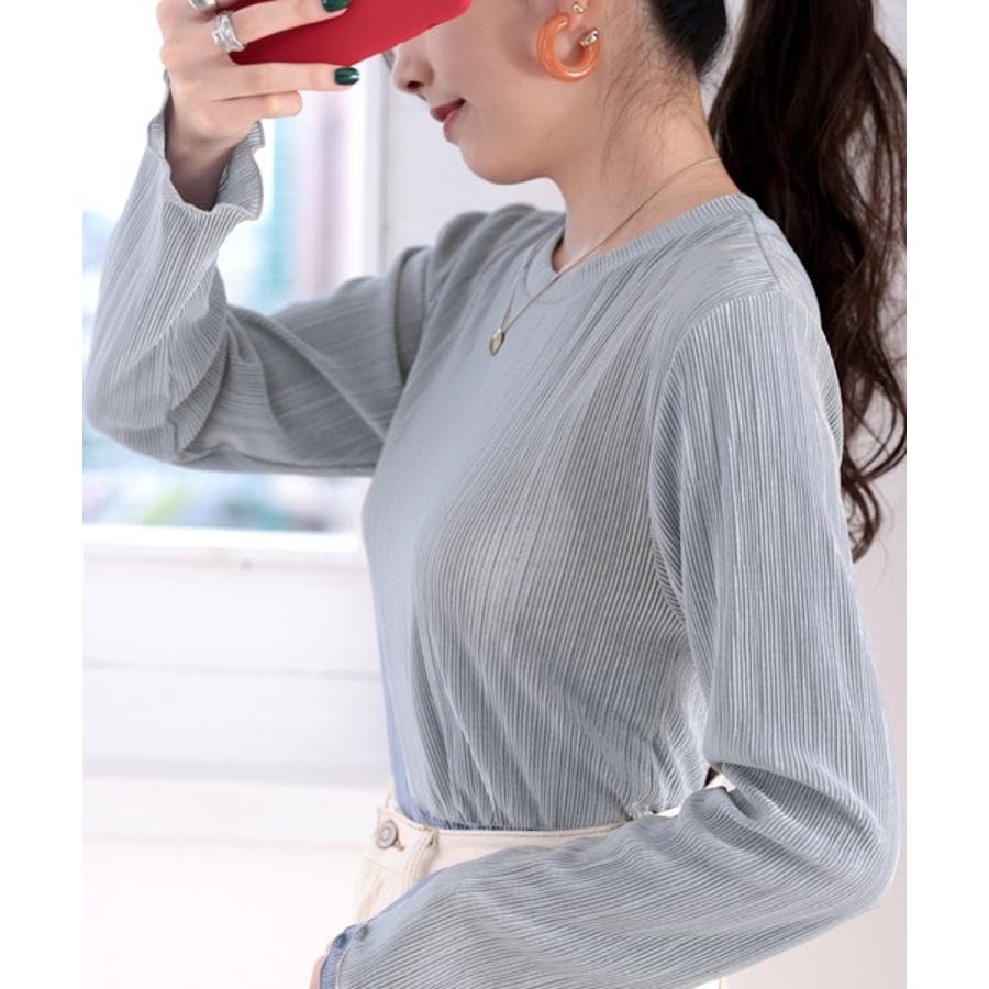 ラウンドネックミドル丈ミニプリーツ袖メローリブブラウス(長袖)