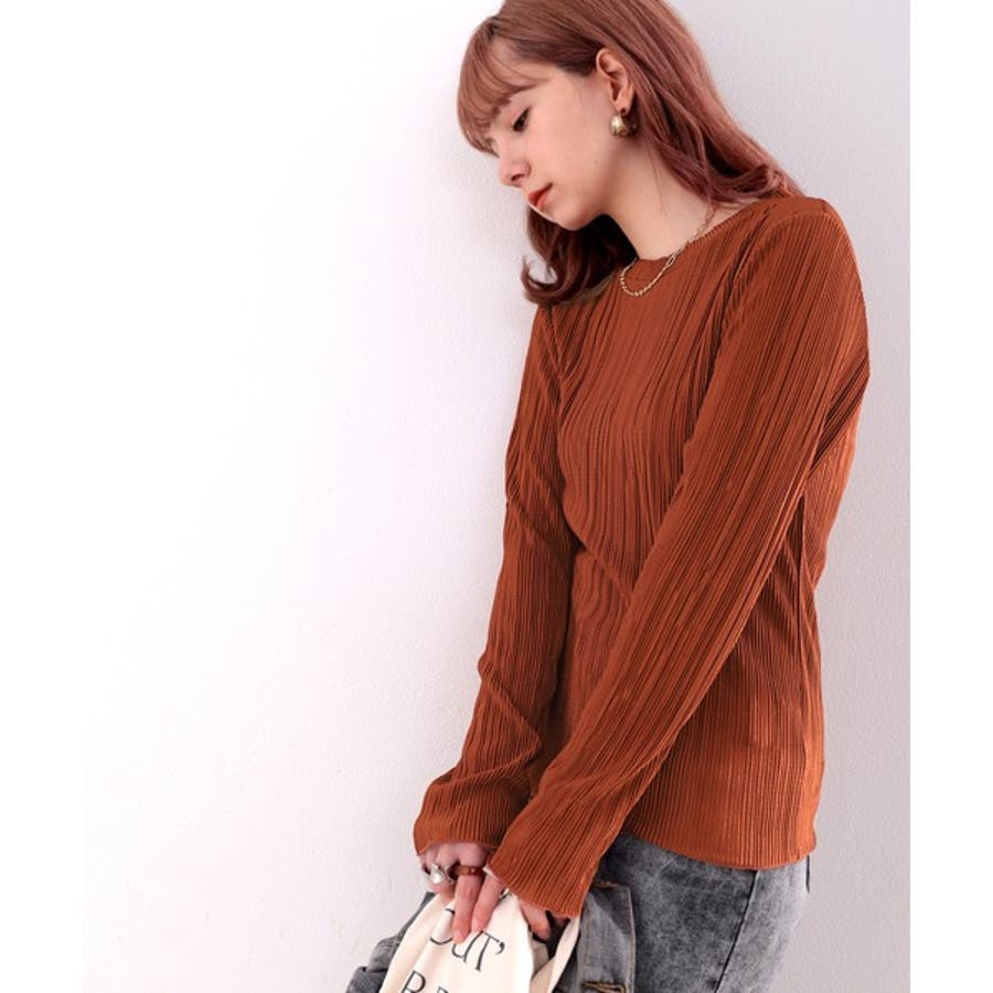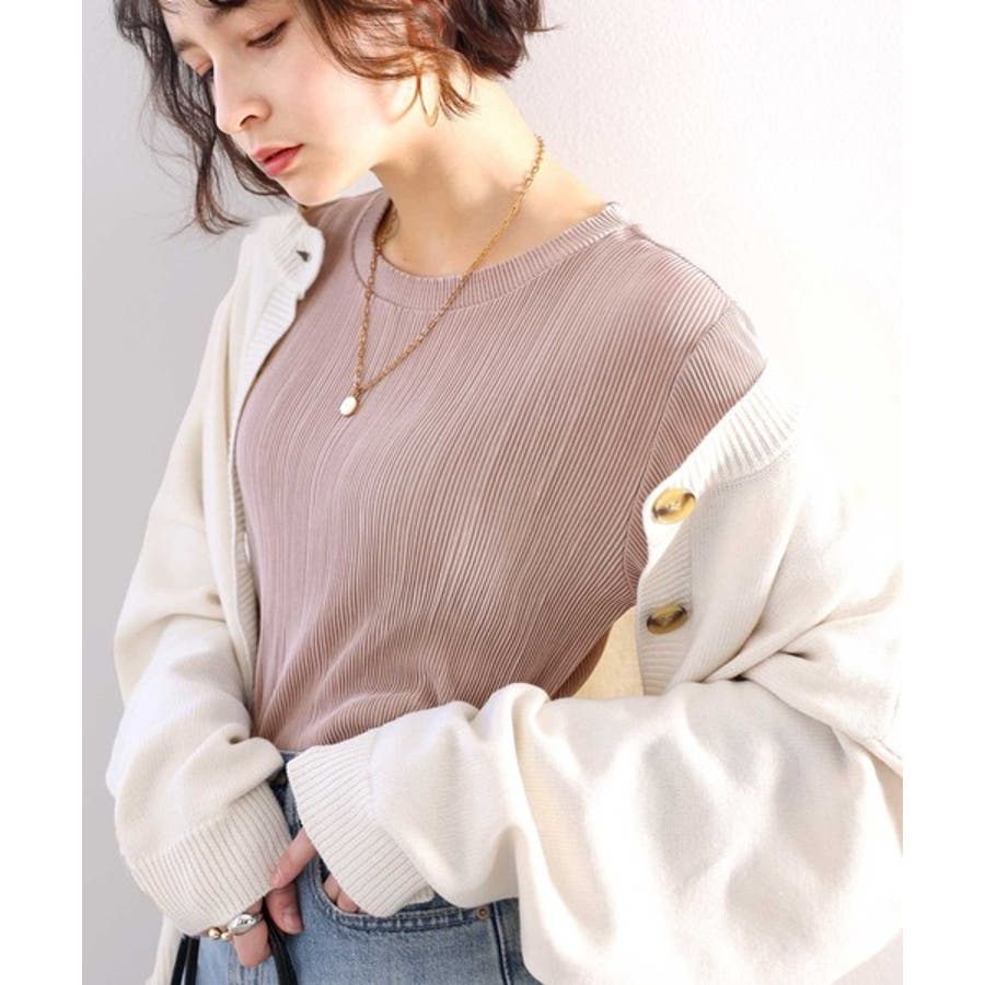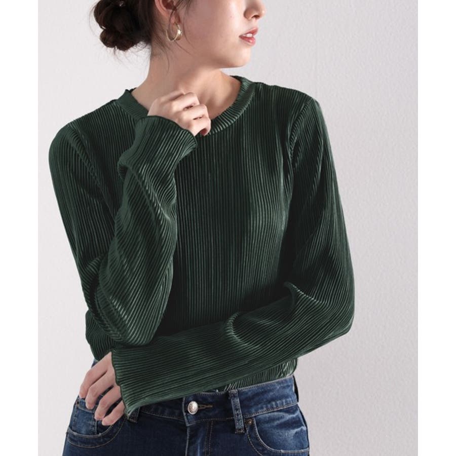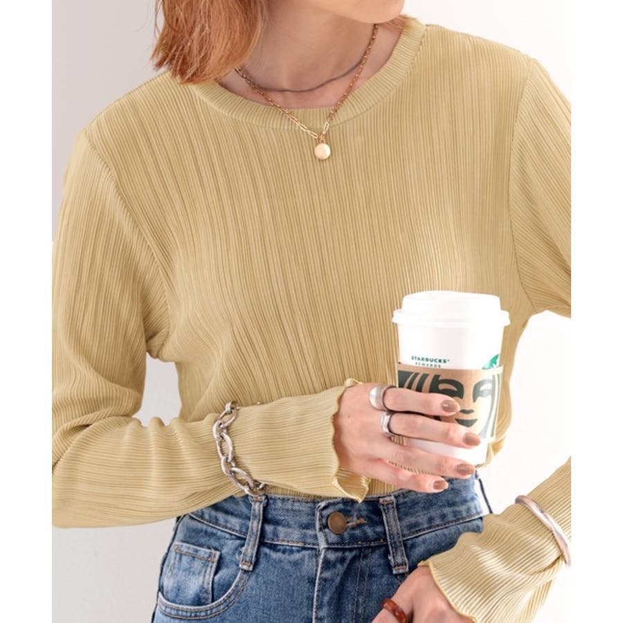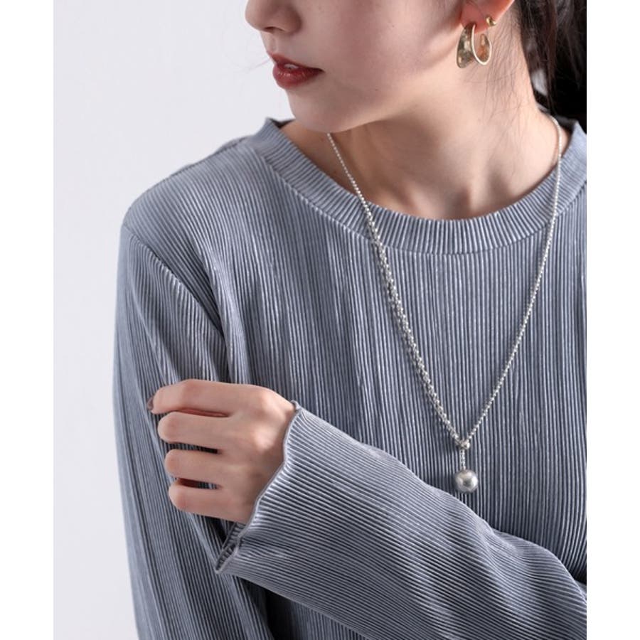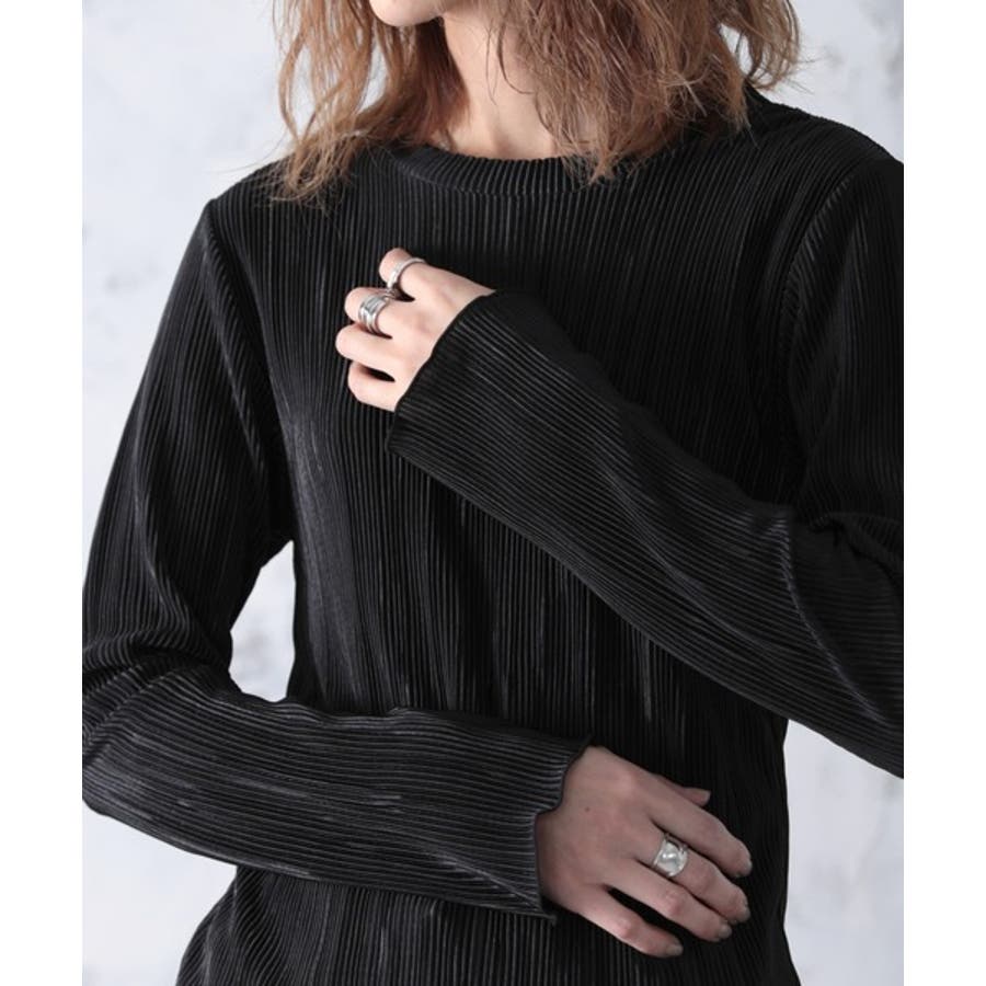 ラウンドネックミドル丈ミニプリーツ袖メローリブブラウス(長袖)