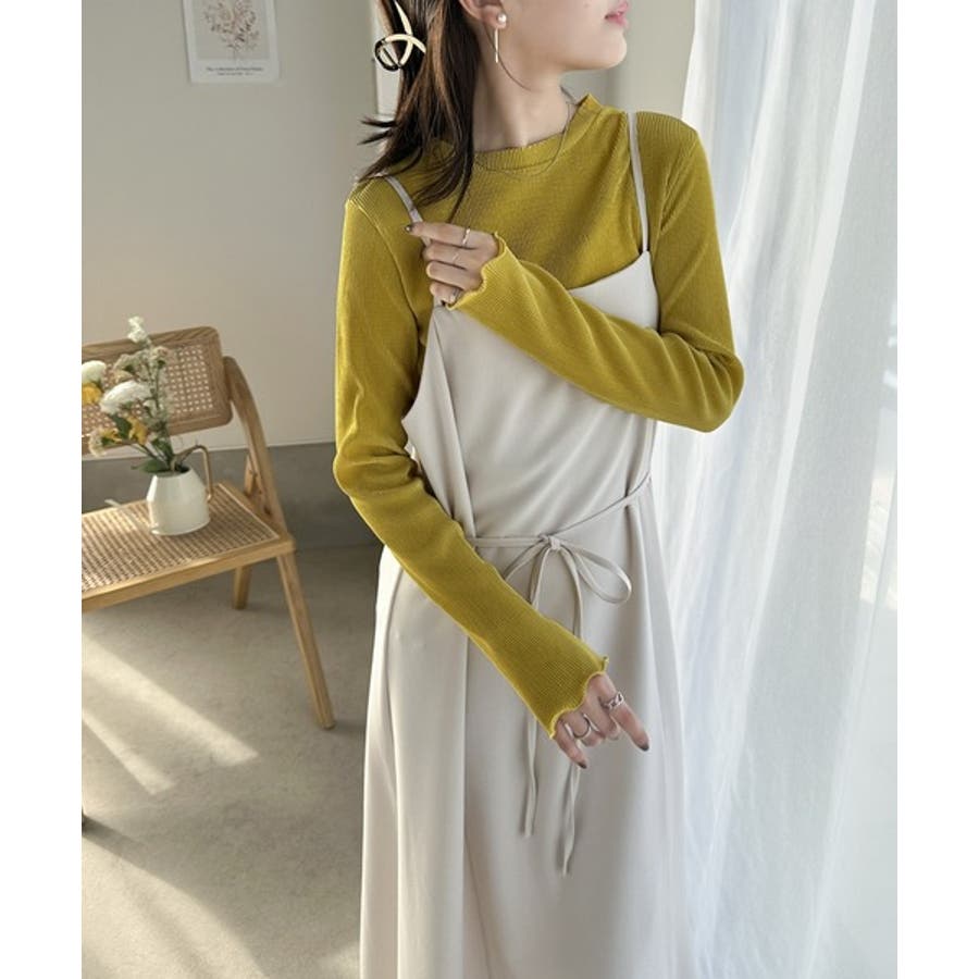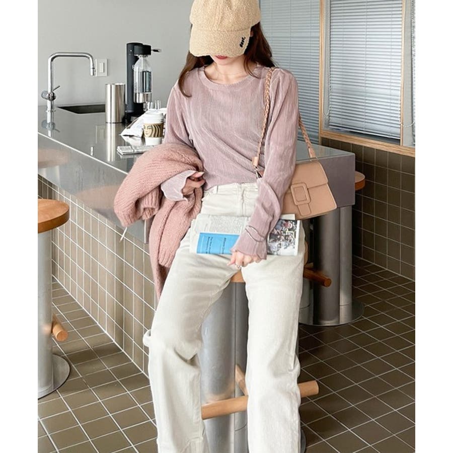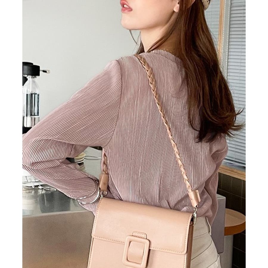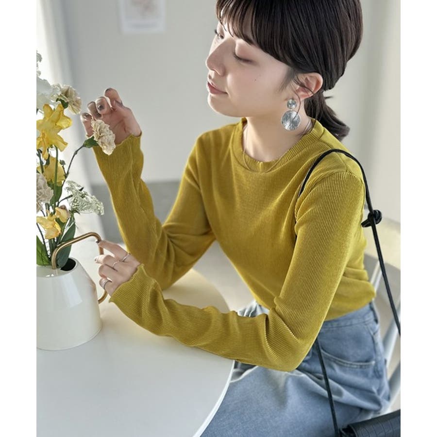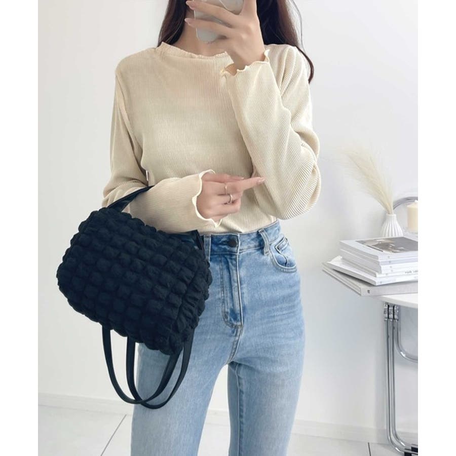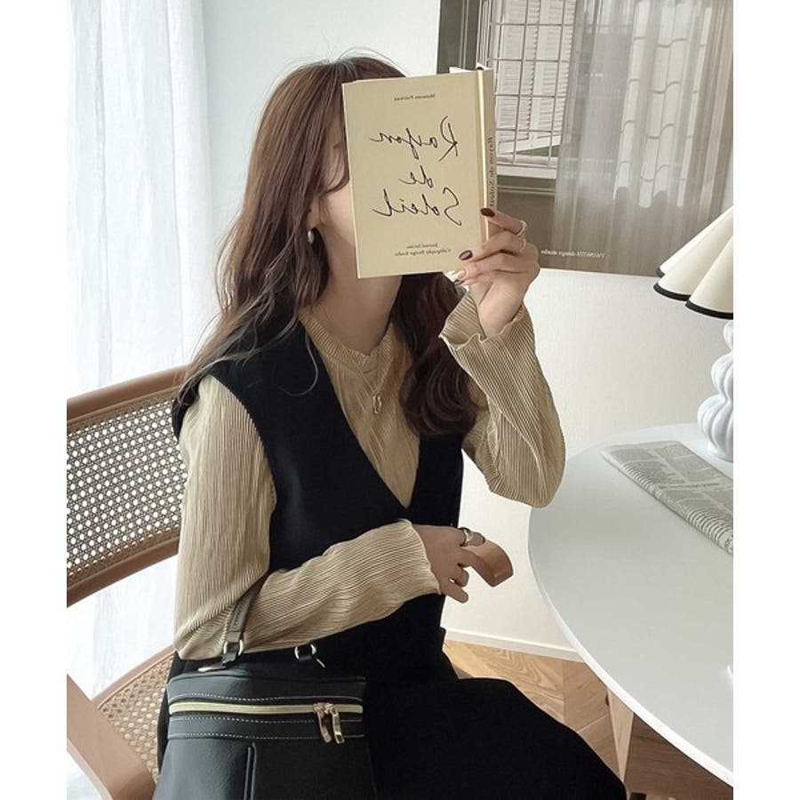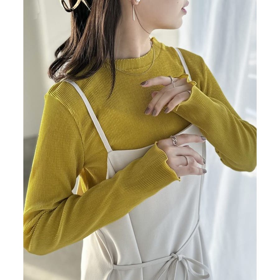 ラウンドネックミドル丈ミニプリーツ袖メローリブブラウス(長袖)