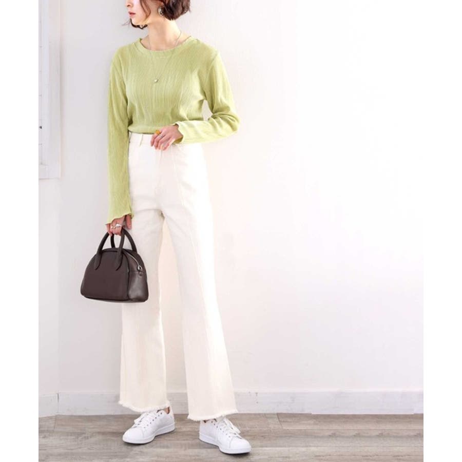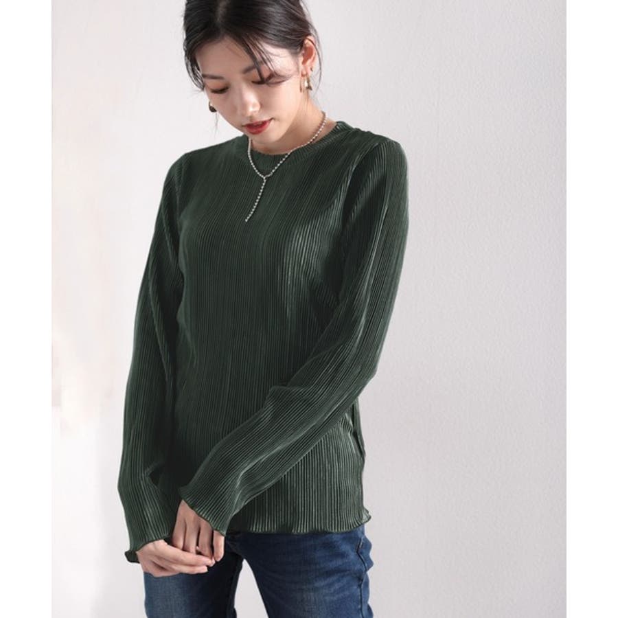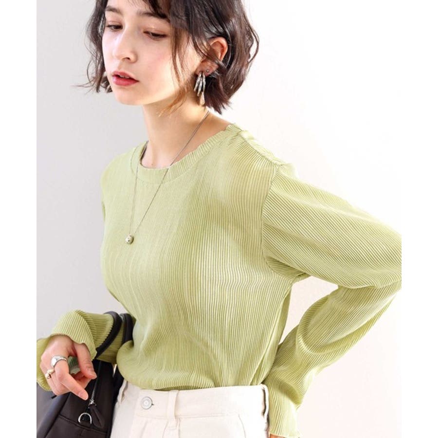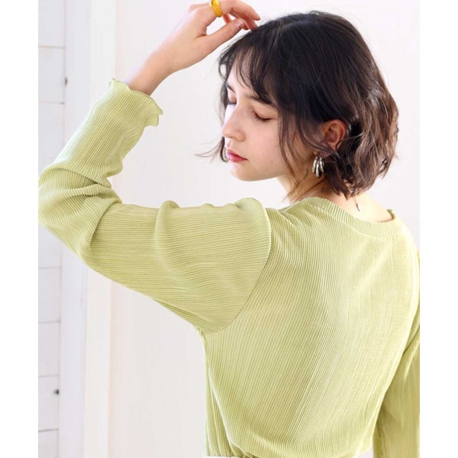 【ライトグリーン】ラウンドネックミドル丈ミニプリーツ袖メローリブブラウス