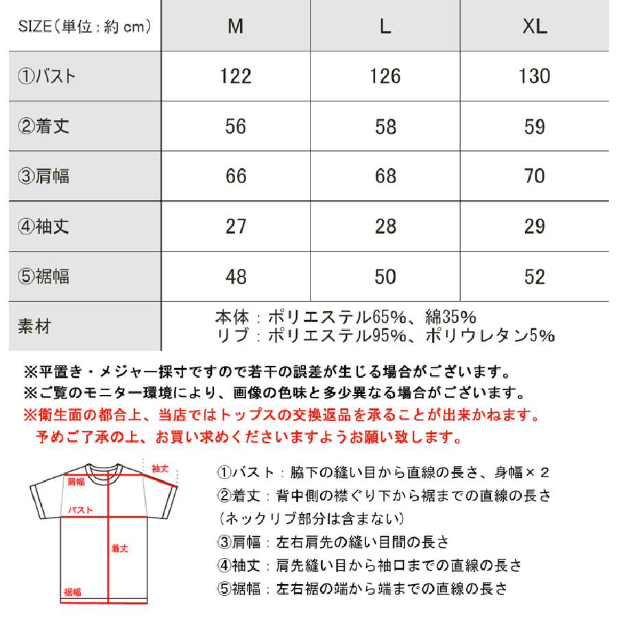 【素材】本体:ポリエステル65%、綿35%、リブ:ポリエステル95%、ポリウレタン5%