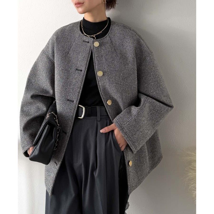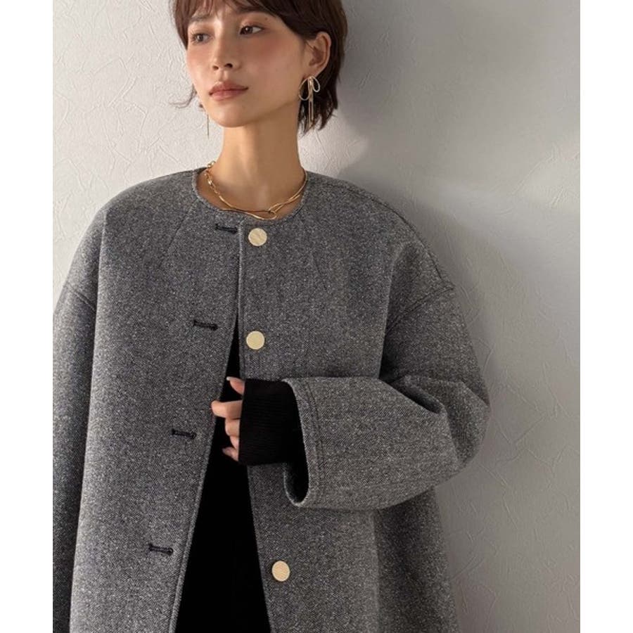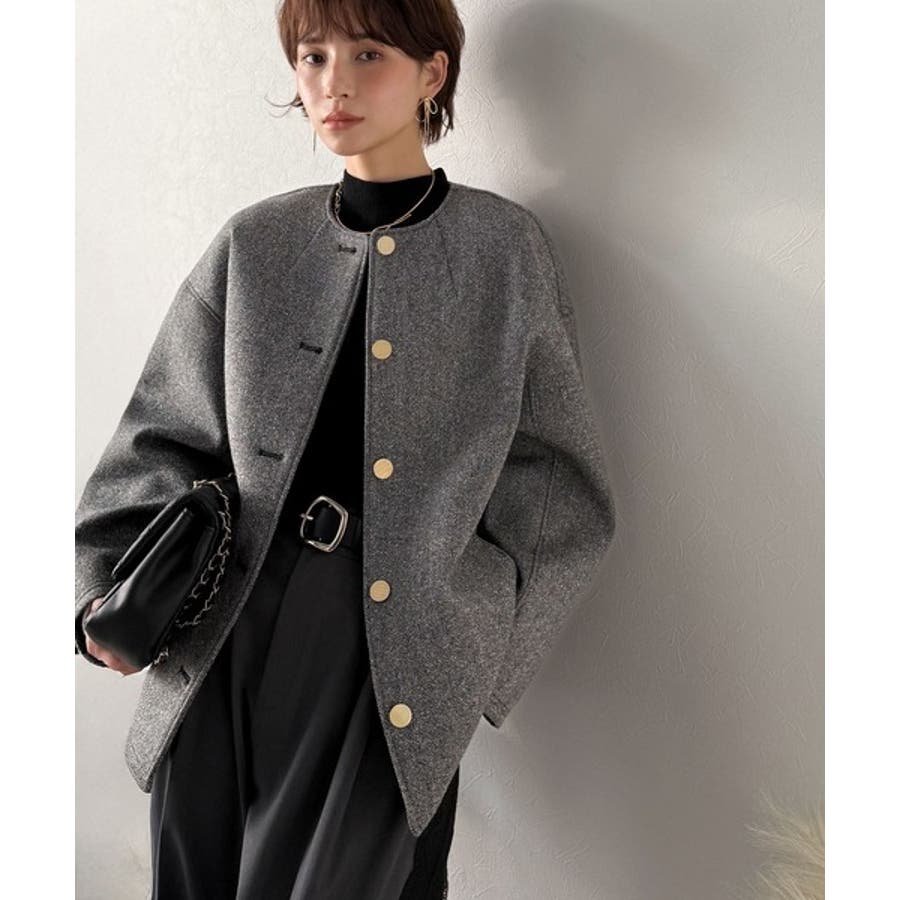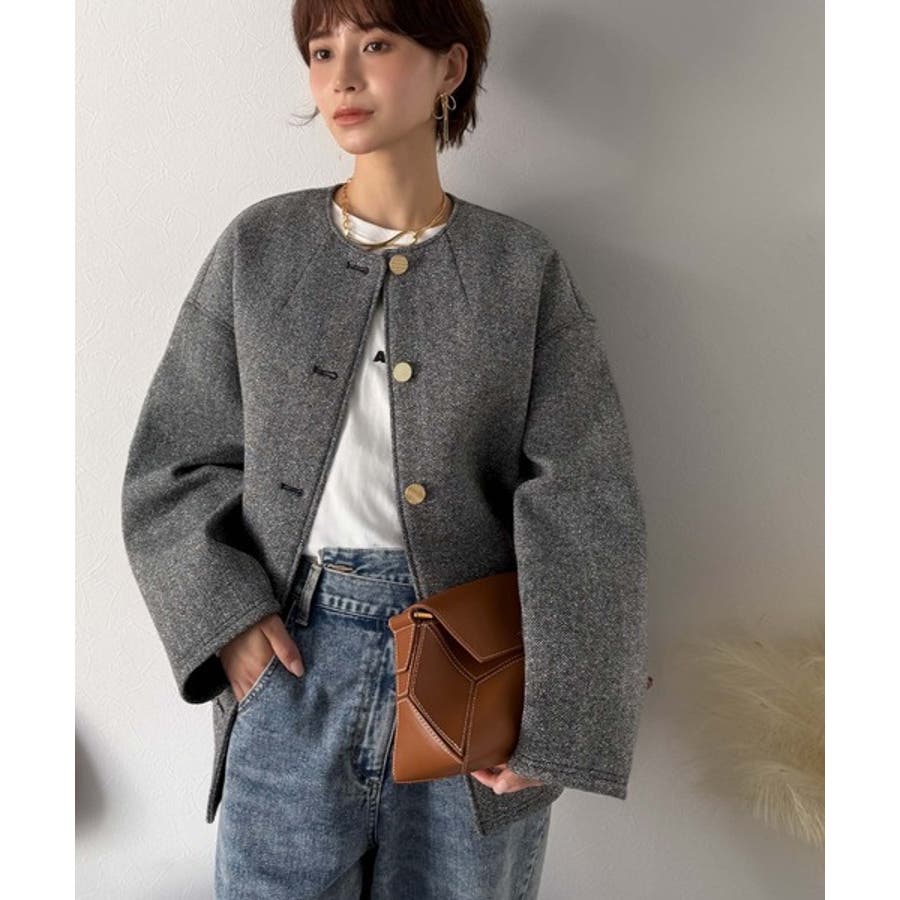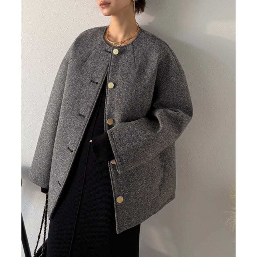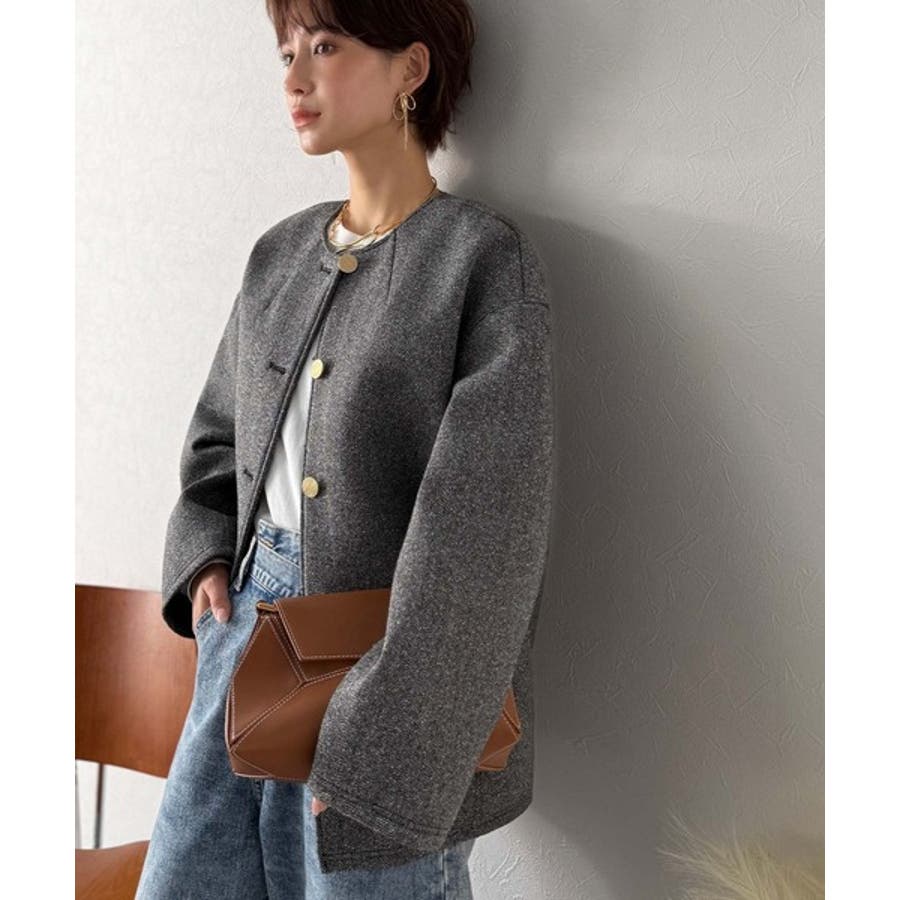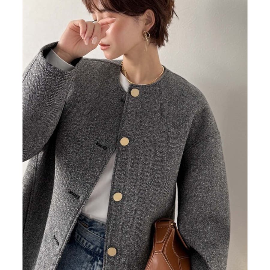 襟のないすっきりとした首元で、マフラーやアクセサリーなど小物使いが映えるノーカラージャケット。