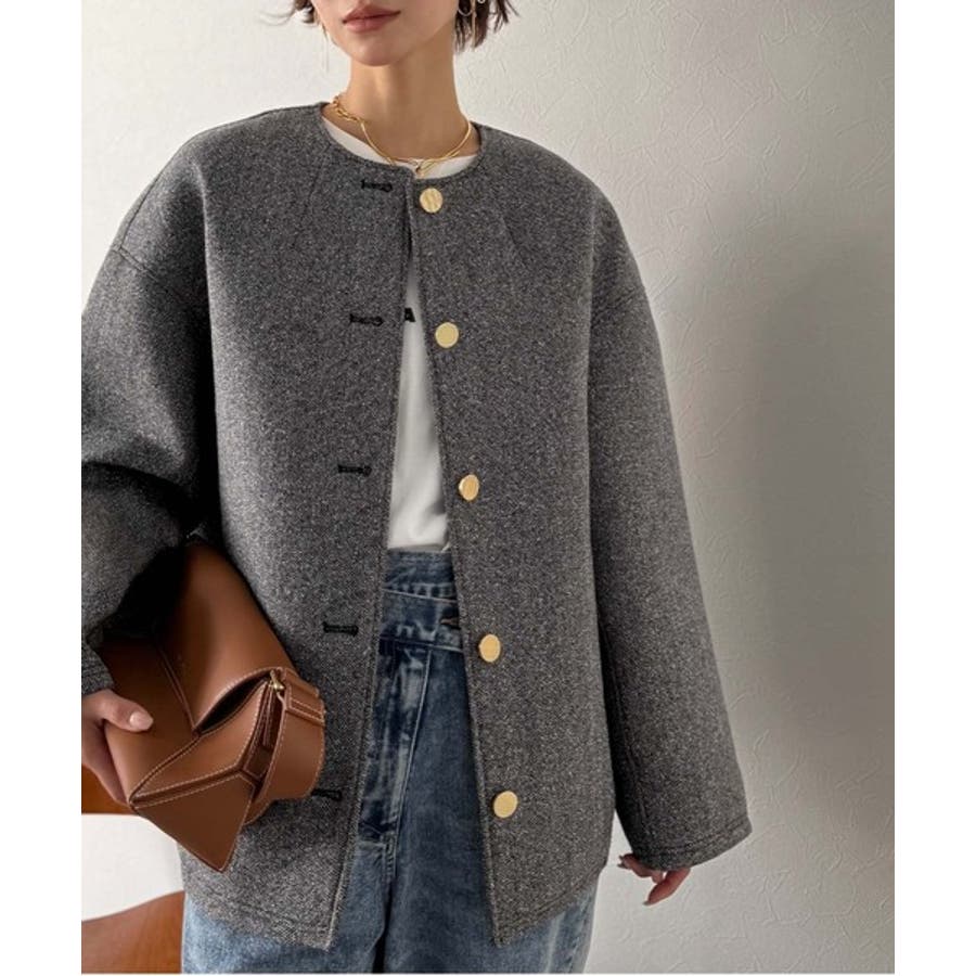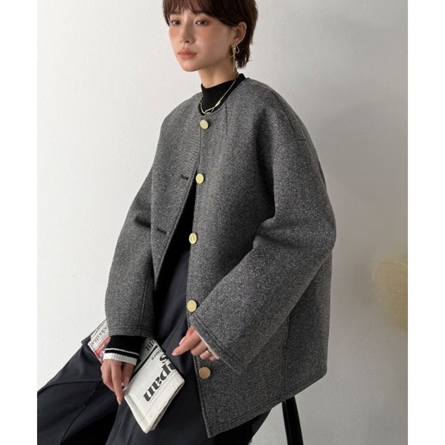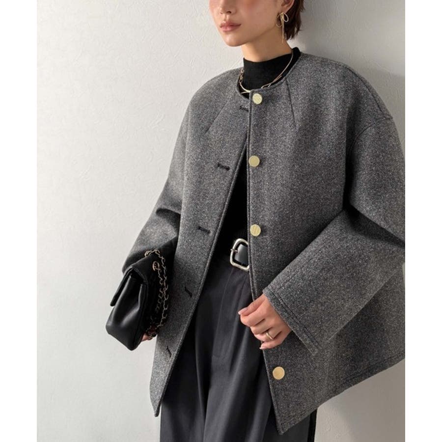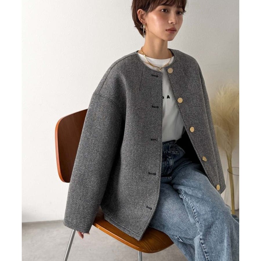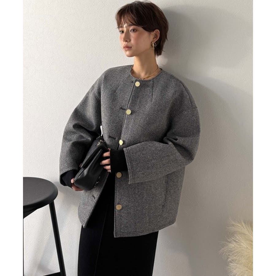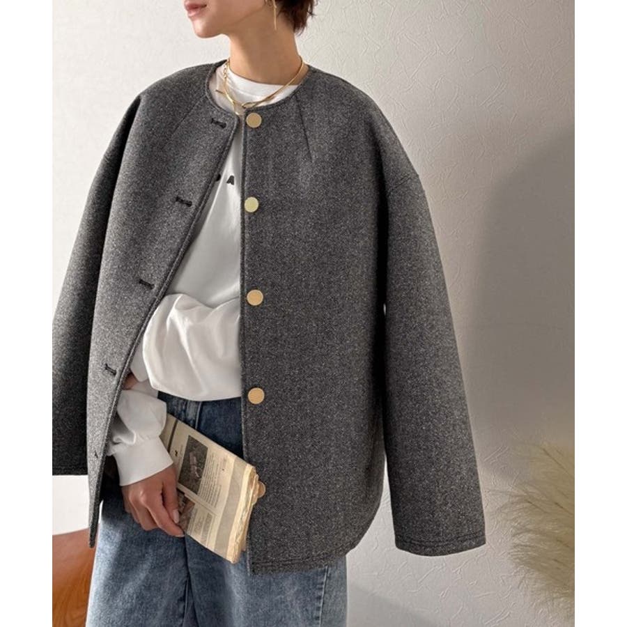 襟のないすっきりとした首元で、マフラーやアクセサリーなど小物使いが映えるノーカラージャケット。