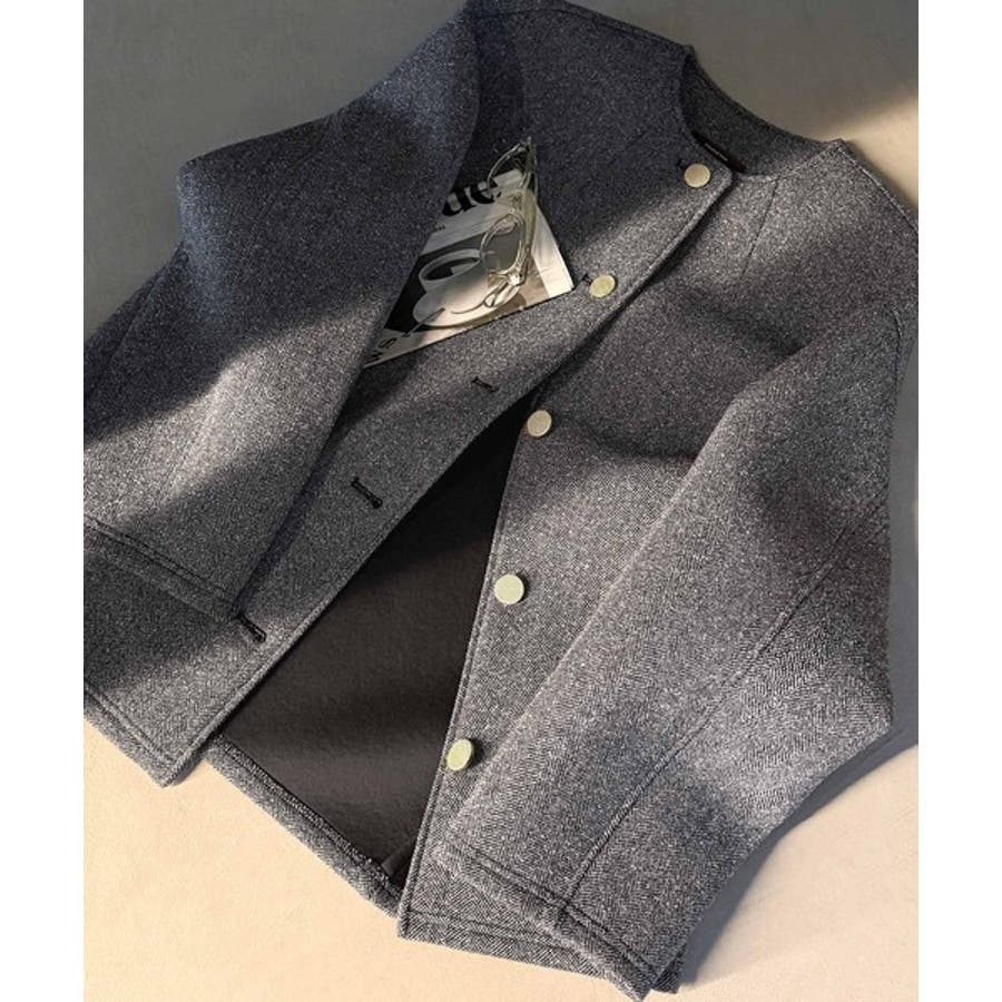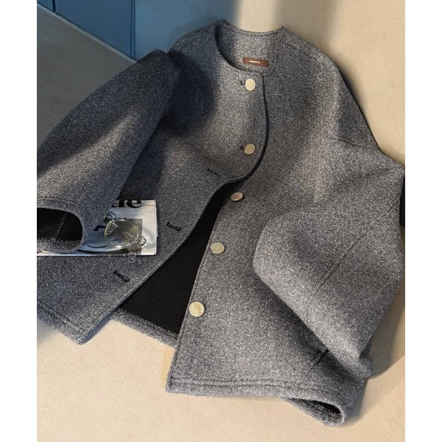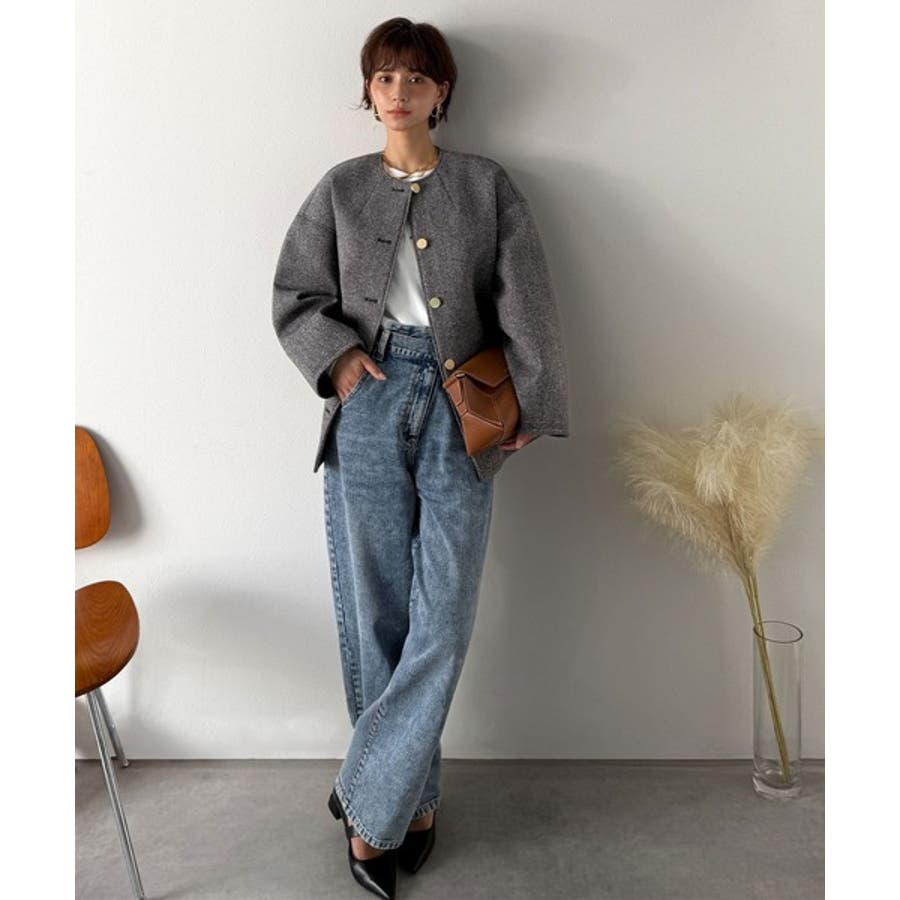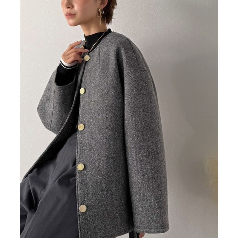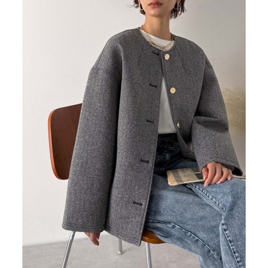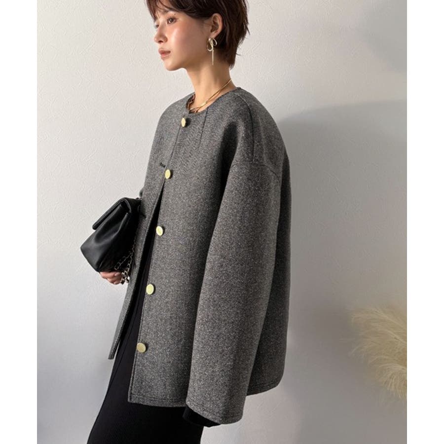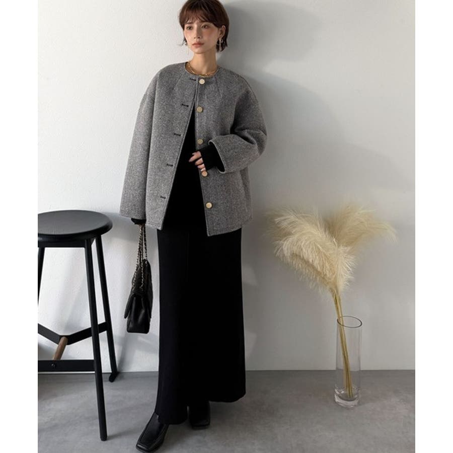 襟のないすっきりとした首元で、マフラーやアクセサリーなど小物使いが映えるノーカラージャケット。