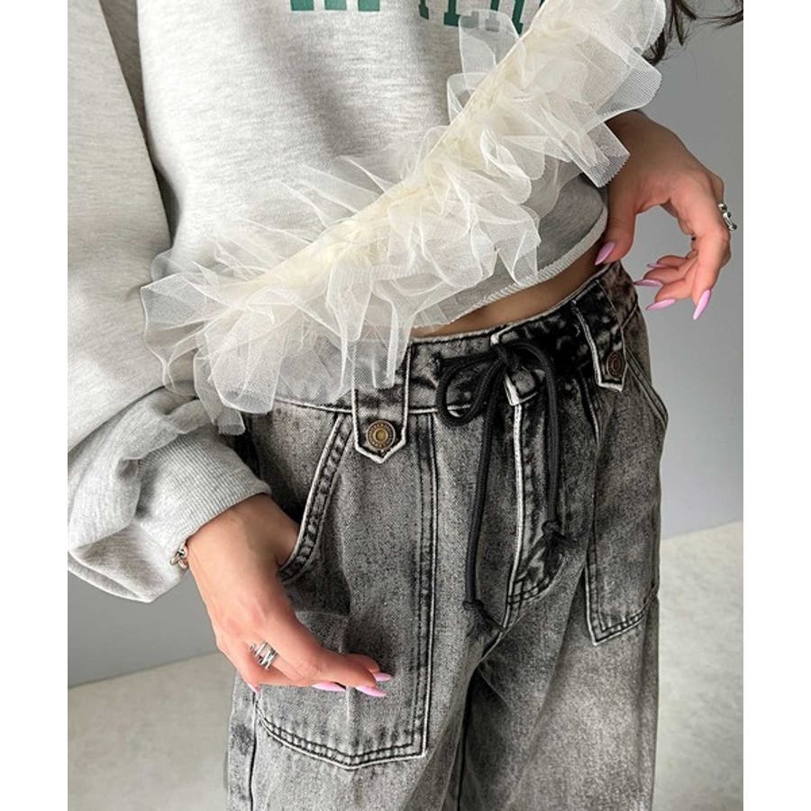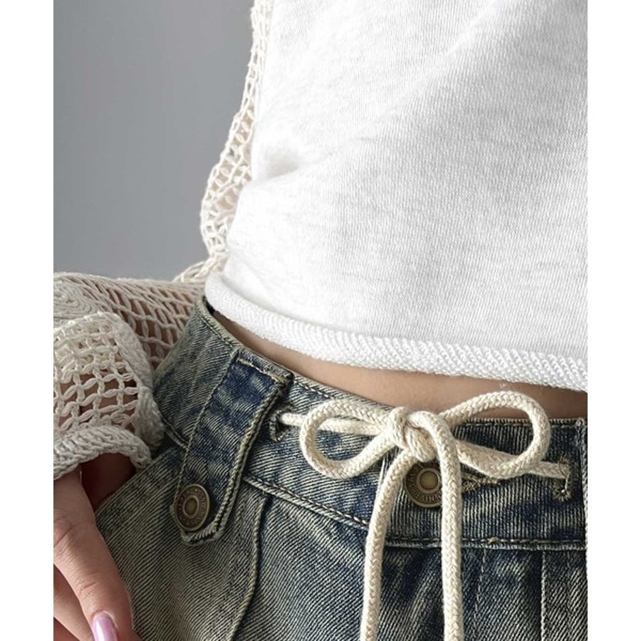 短丈トップスを合わせて、ウエストの紐を覗かせたり、