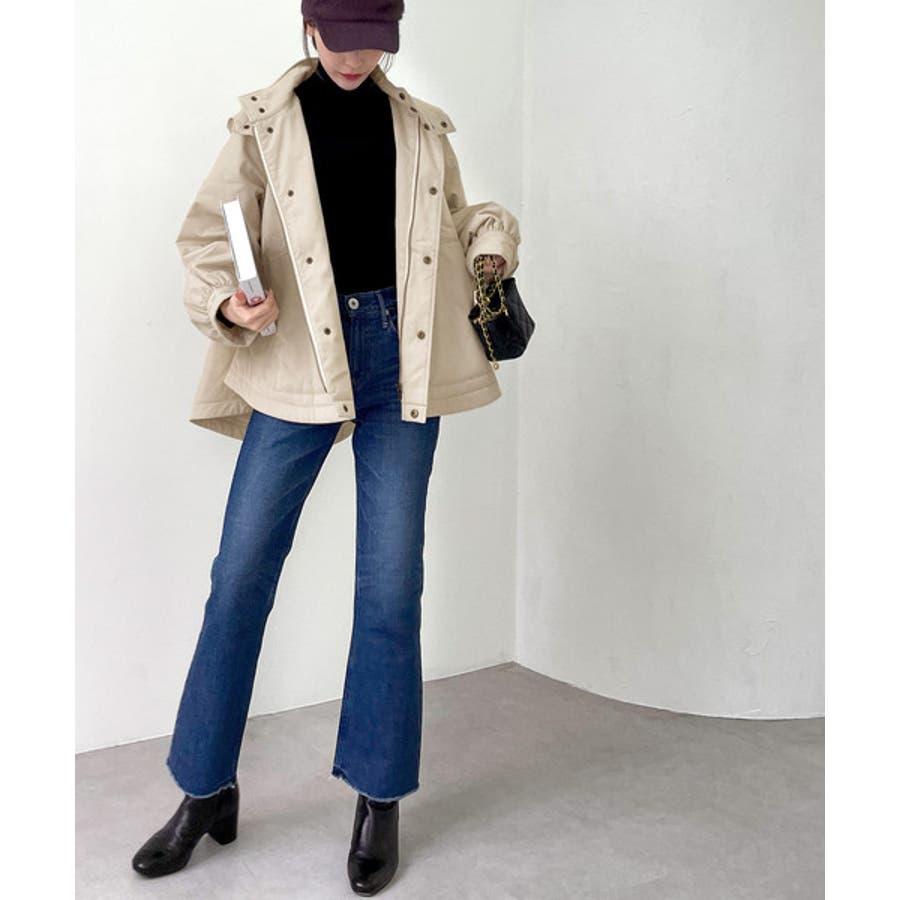 カジュアルなライトアウターにフレアの女性らしさを盛り込んだ1枚。