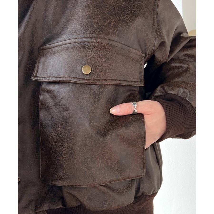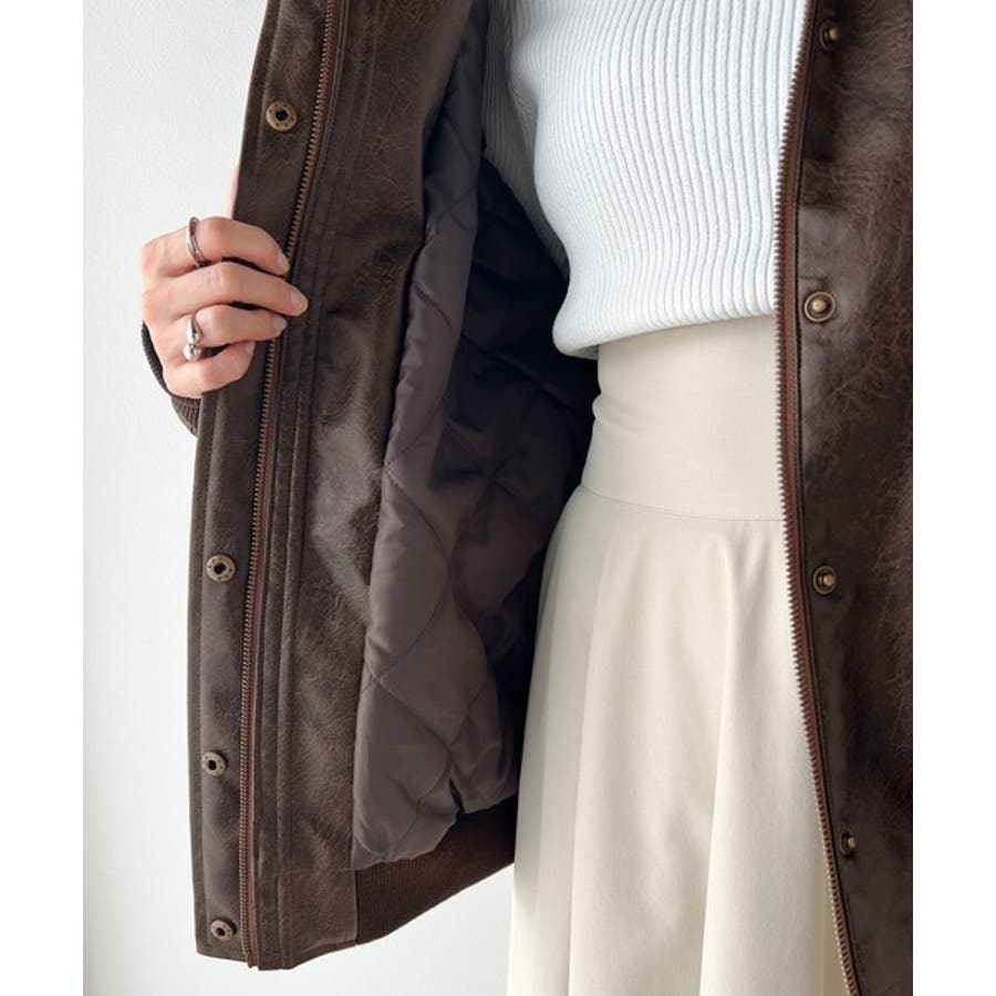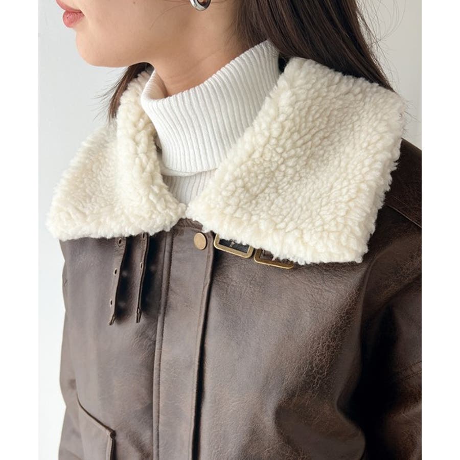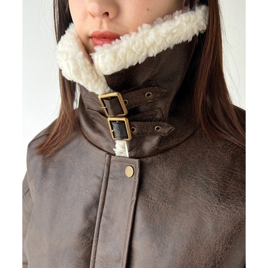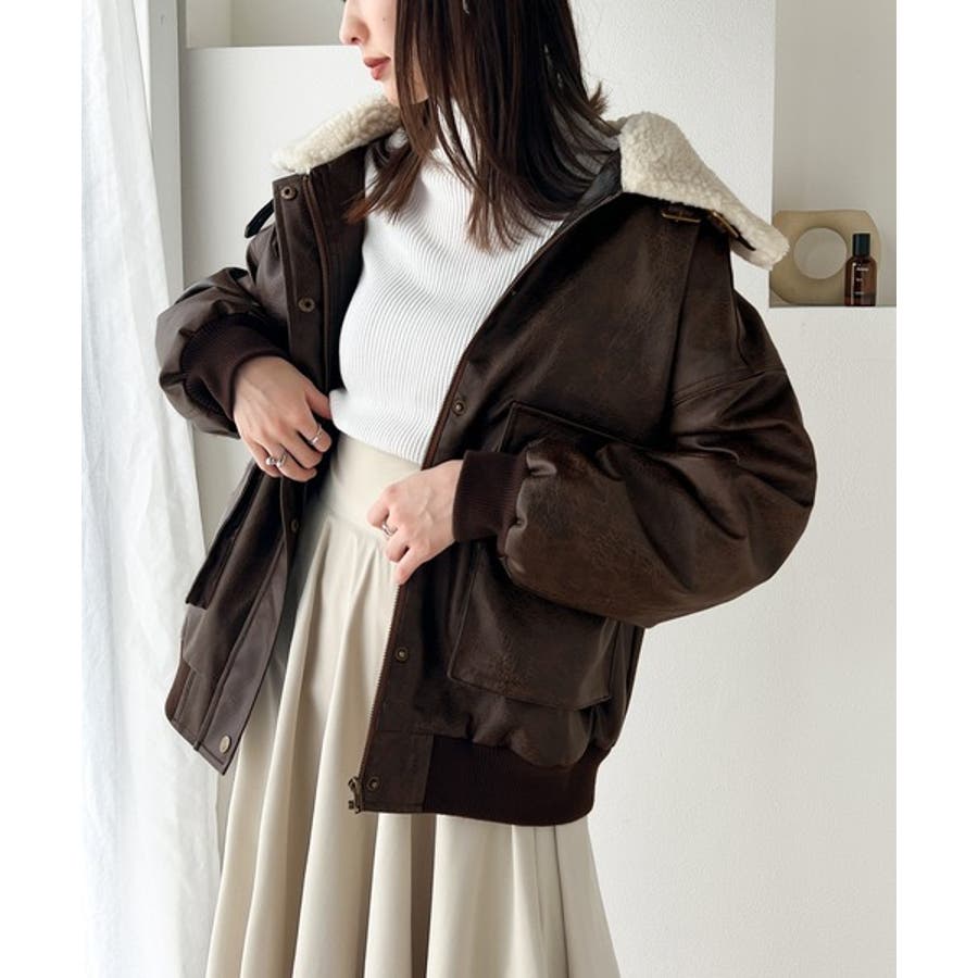 襟のボア×フェイクレザーがポイントのヴィンテージライクなレザージャケット。