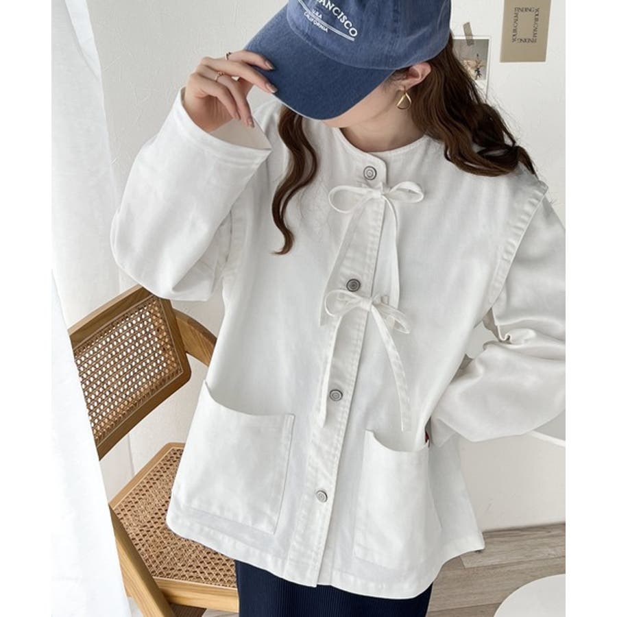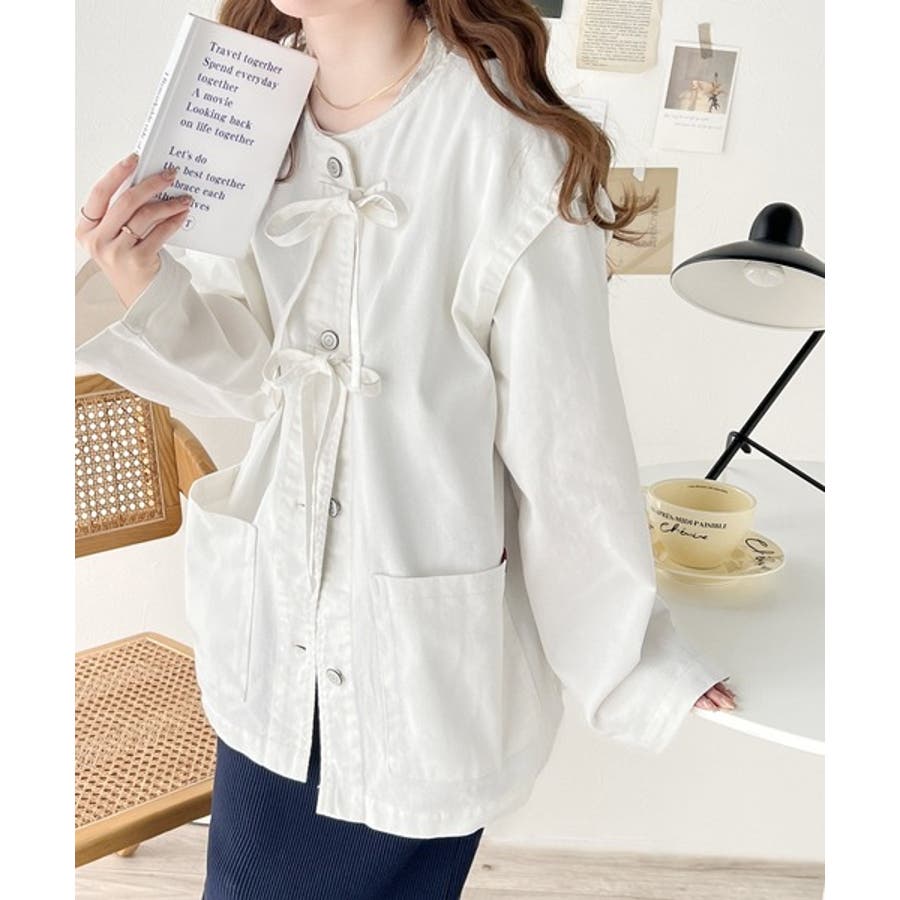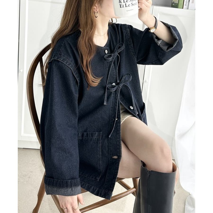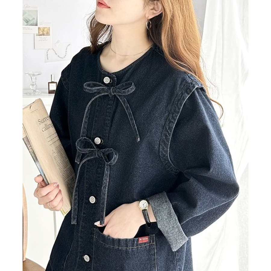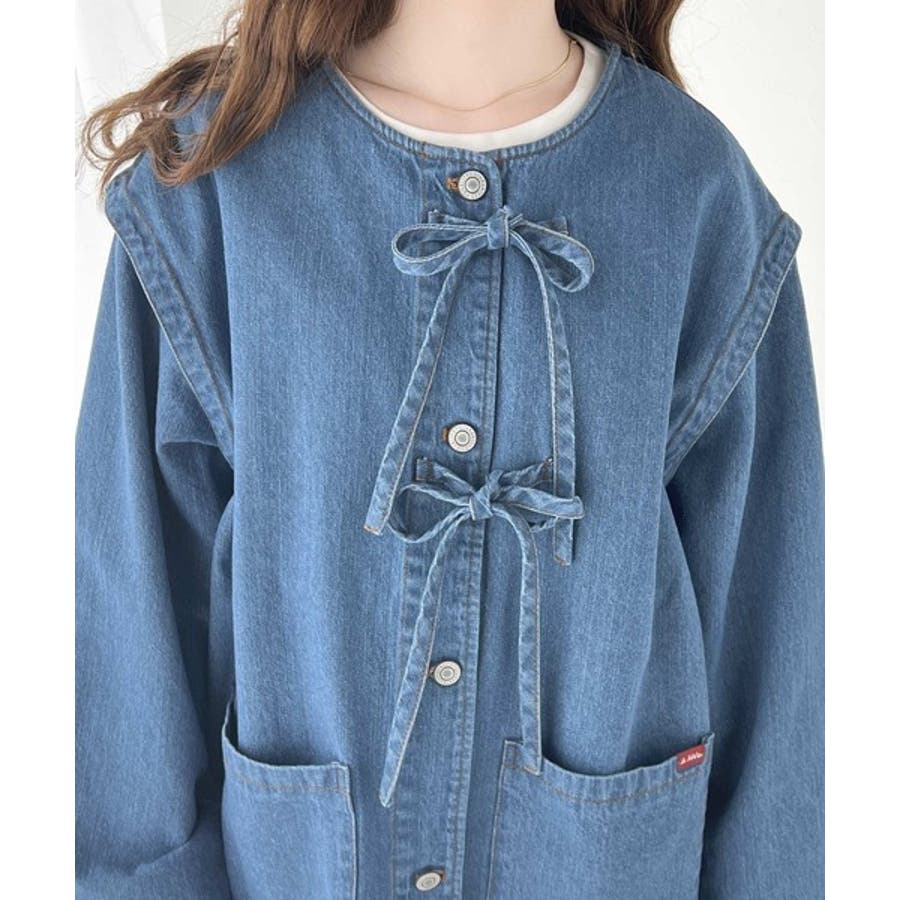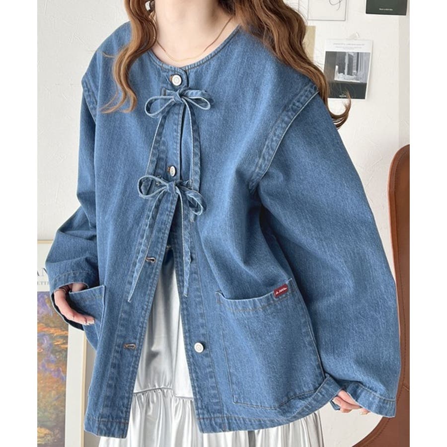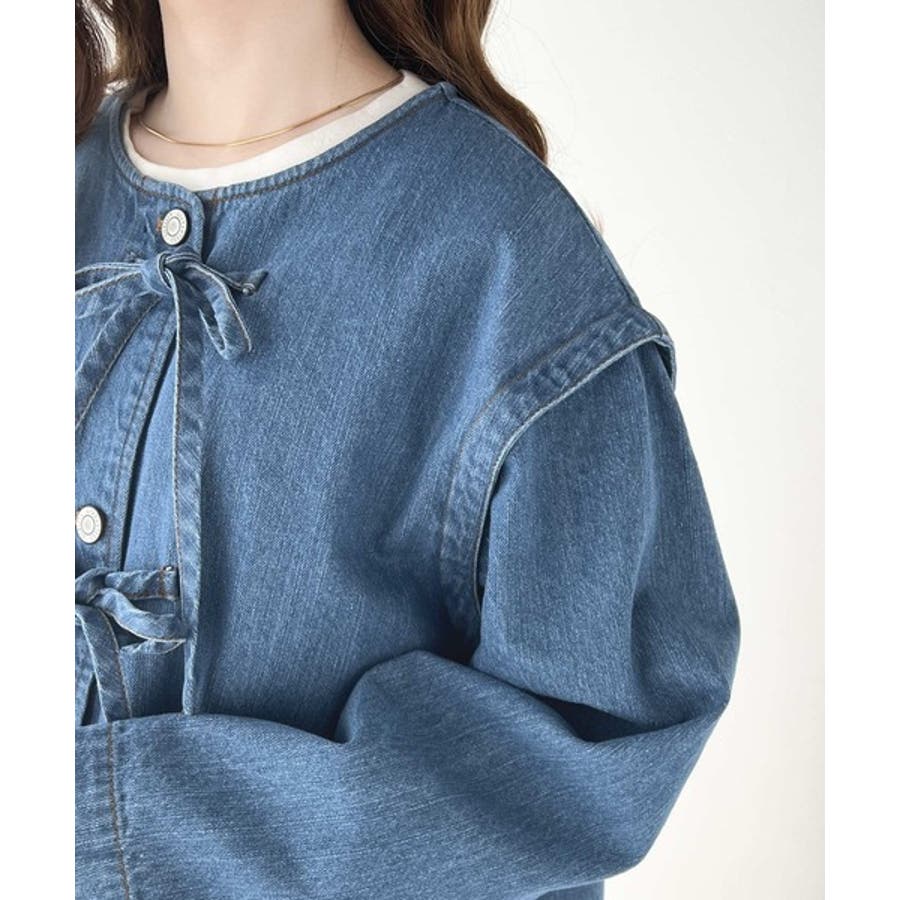 甘さを加えた大人カジュアルアウター。綿100%ドッキング風リボンデニムジャケット…