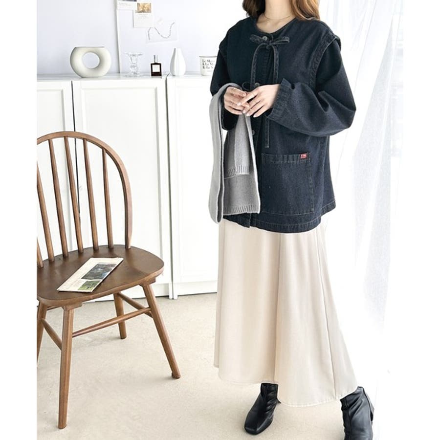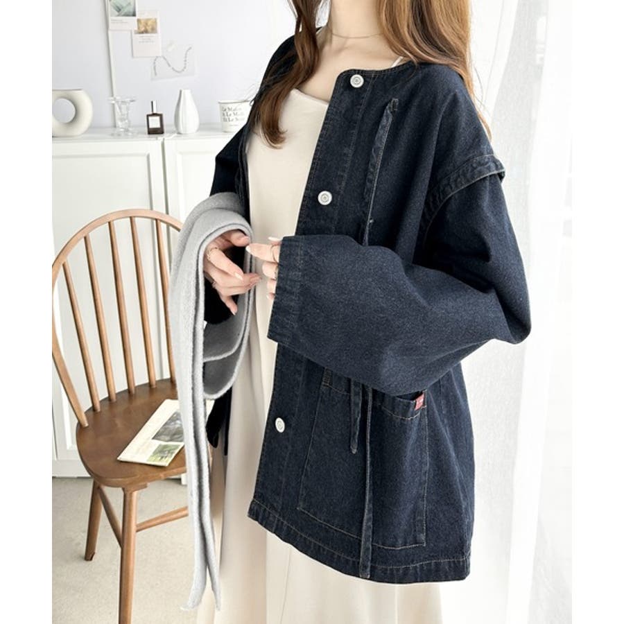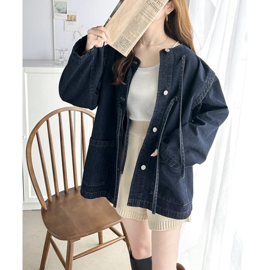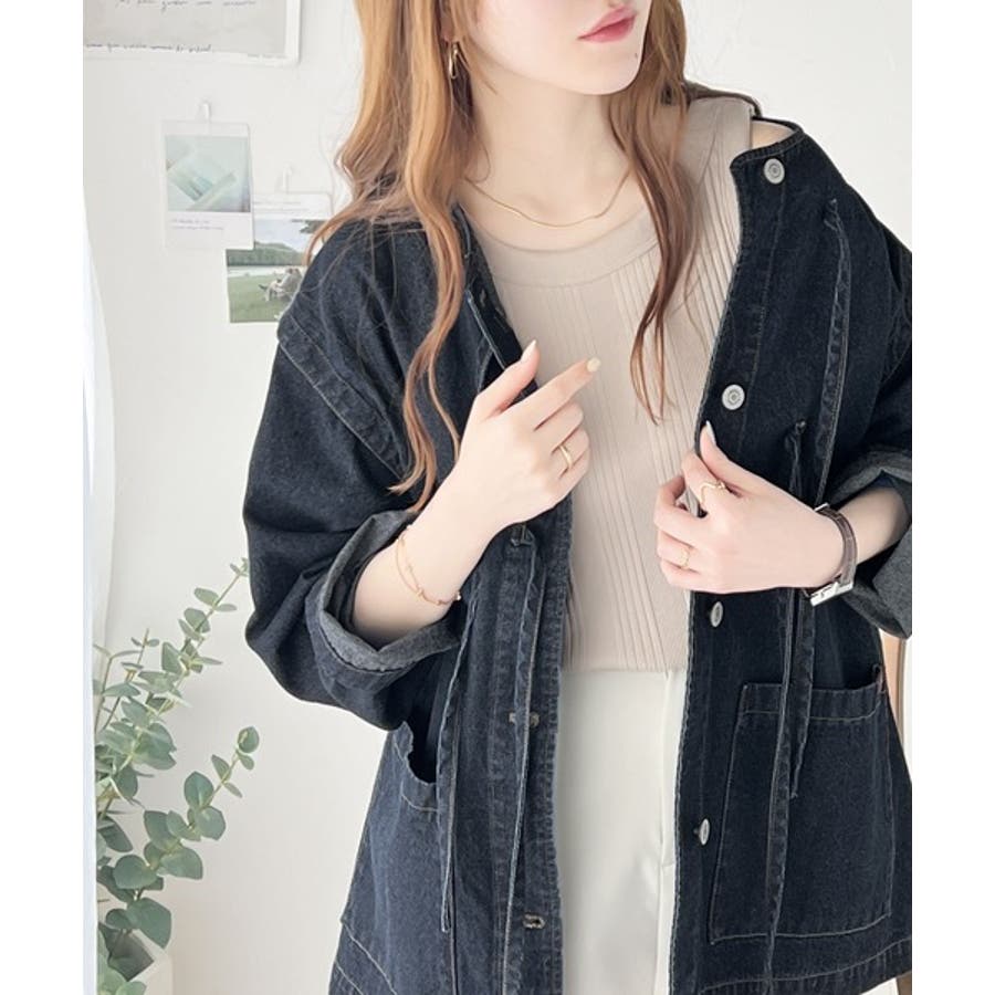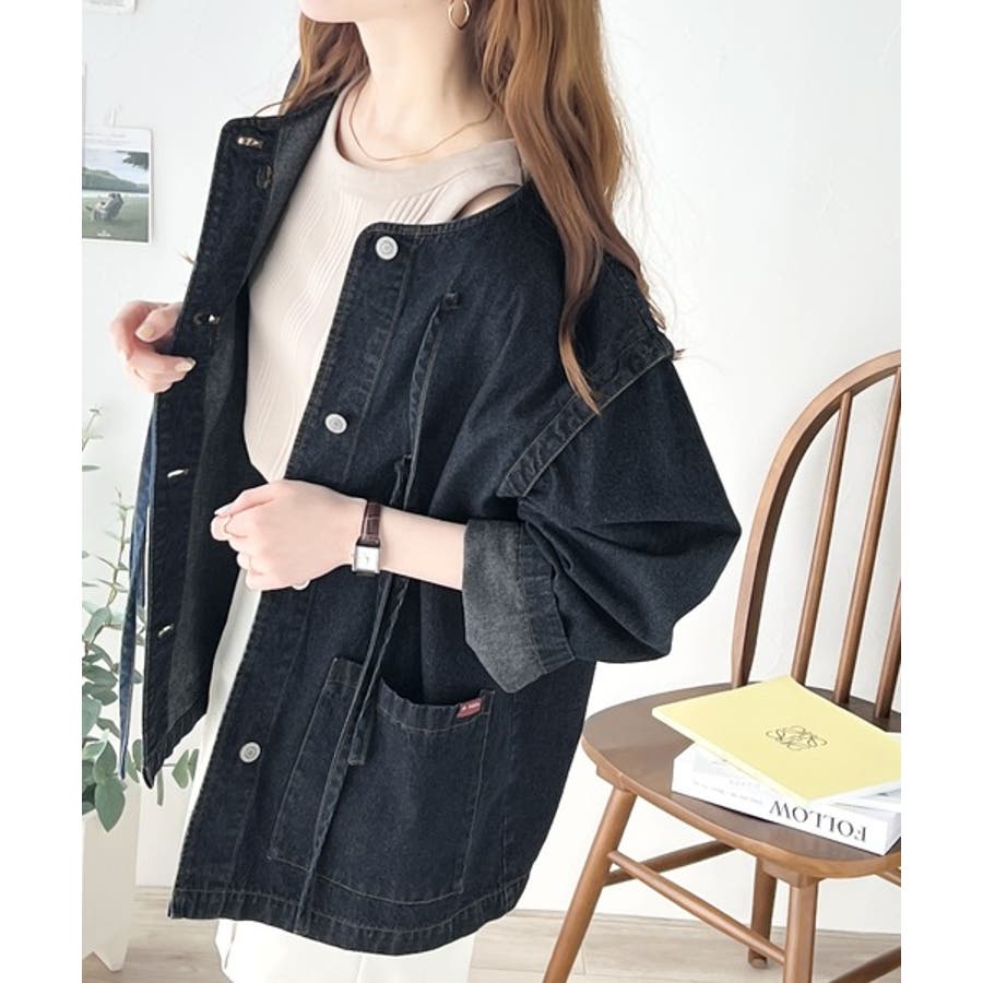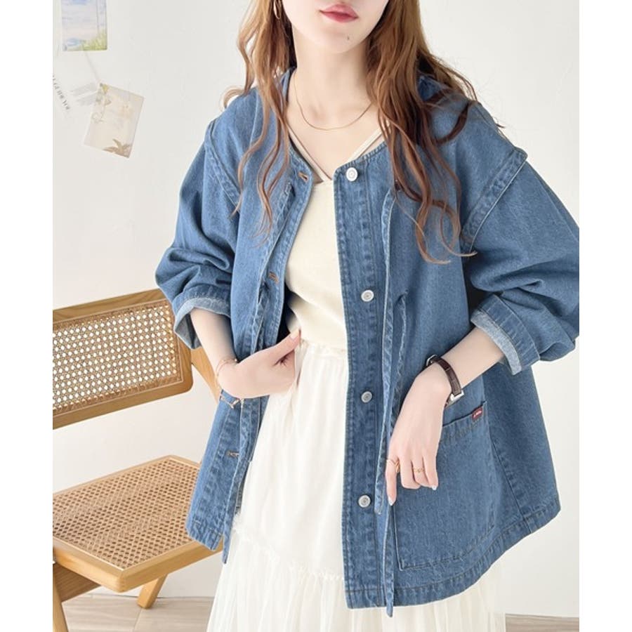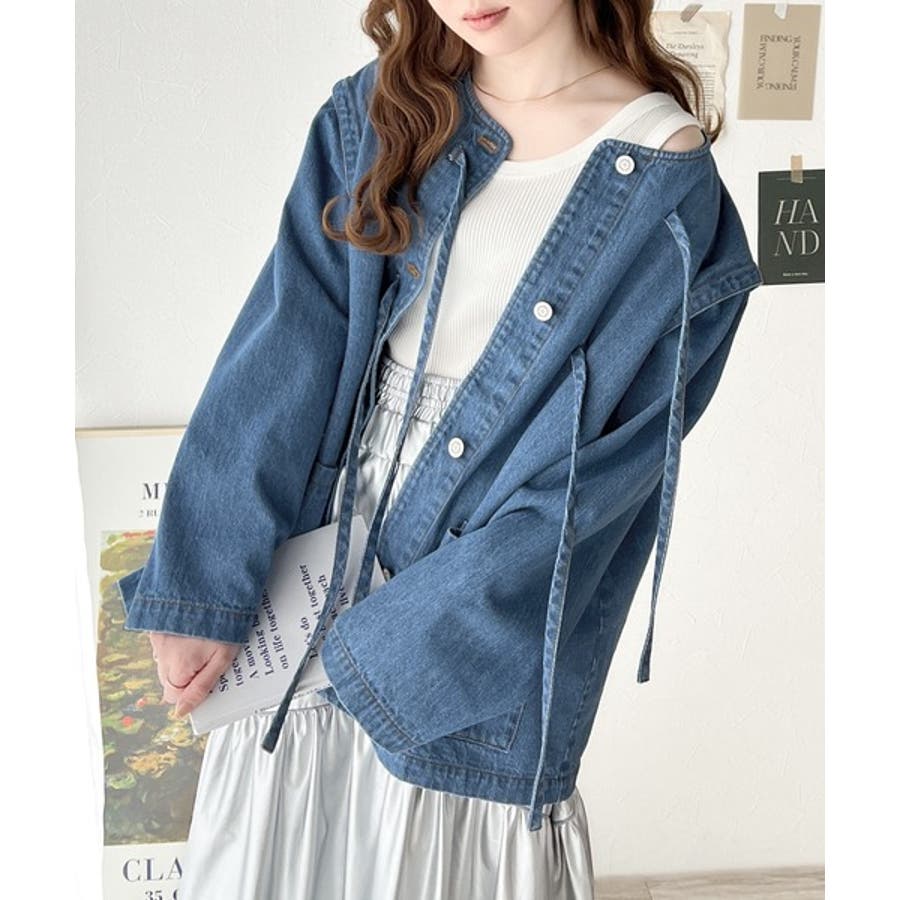 甘さを加えた大人カジュアルアウター。綿100%ドッキング風リボンデニムジャケット…