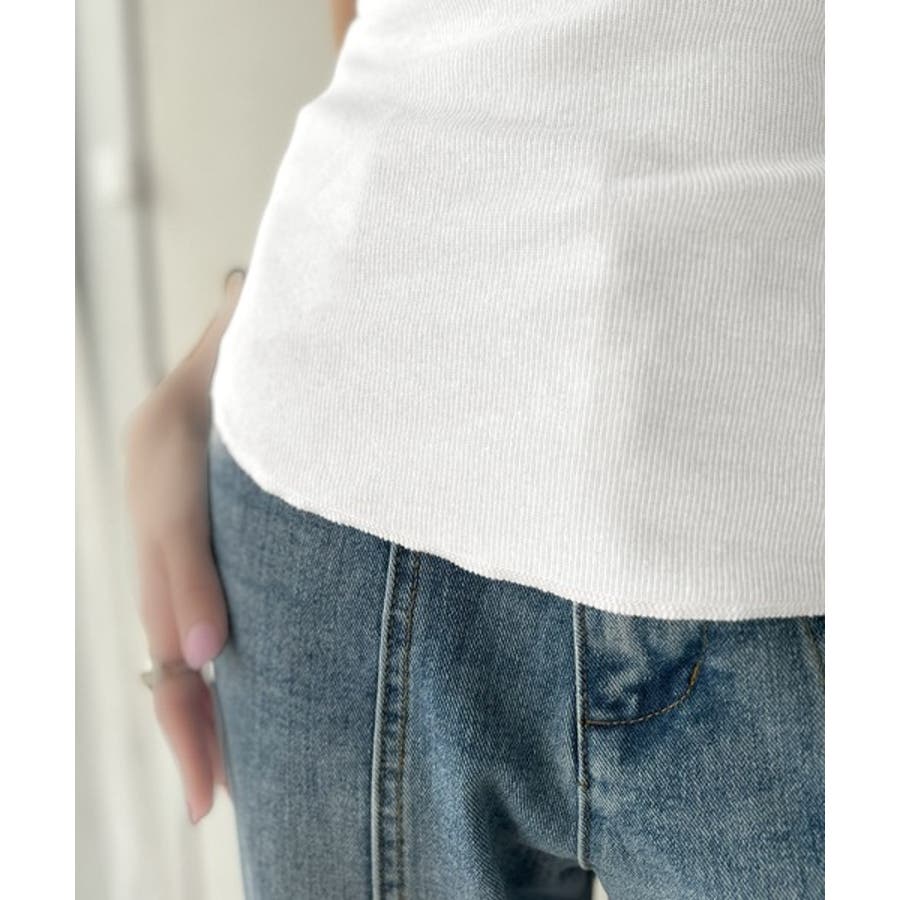 リブ素材がボディラインに優しくフィットし、シルエットを美しく見せつつ、