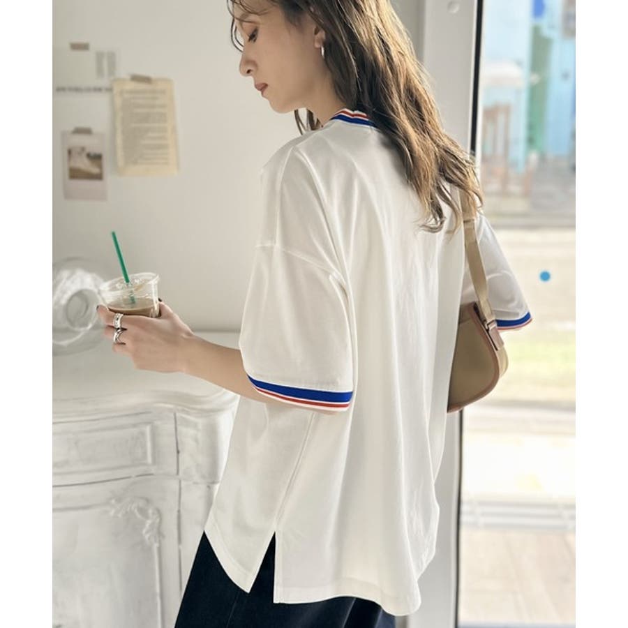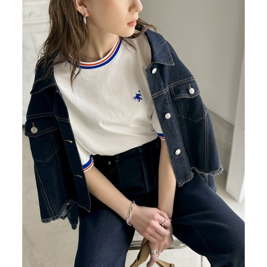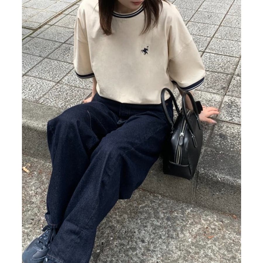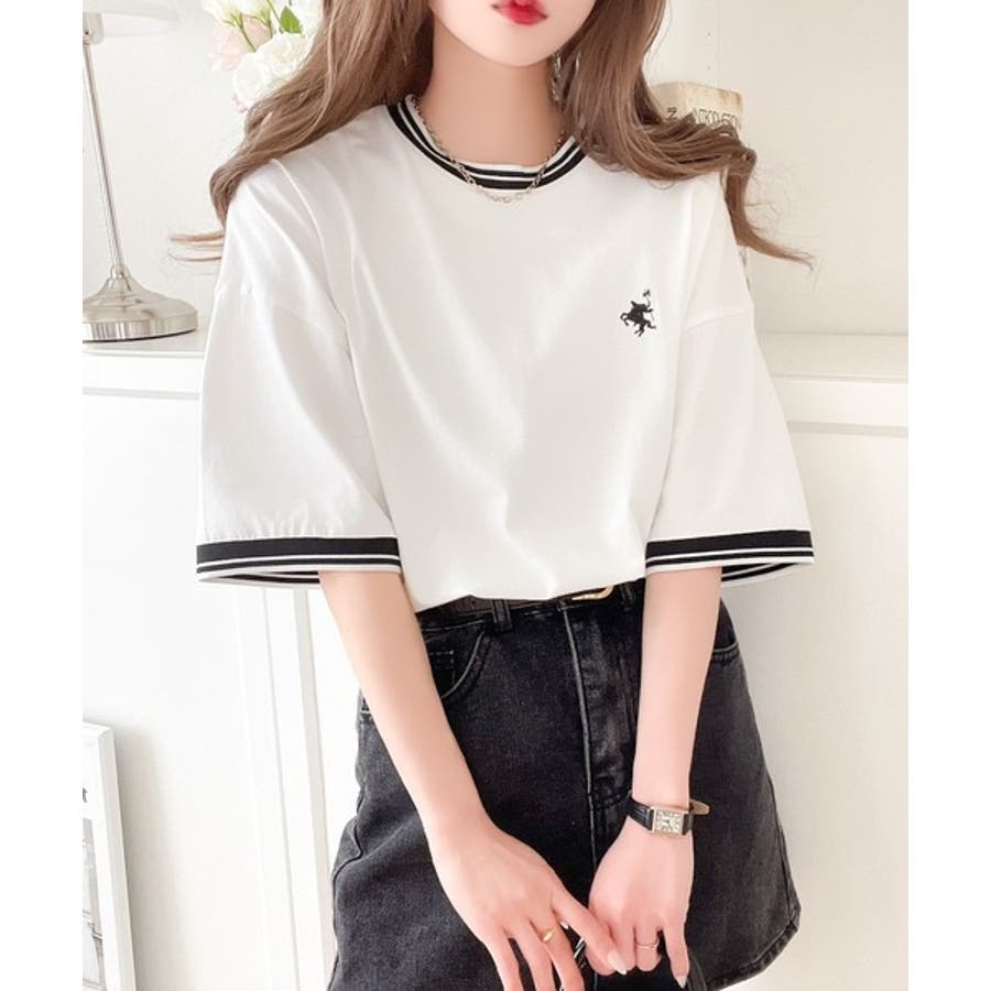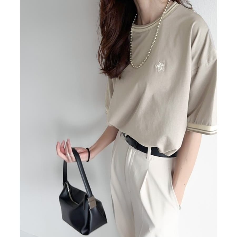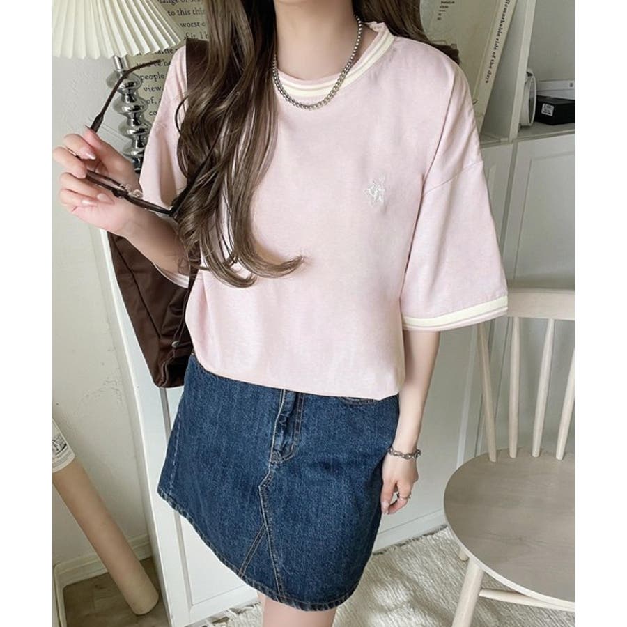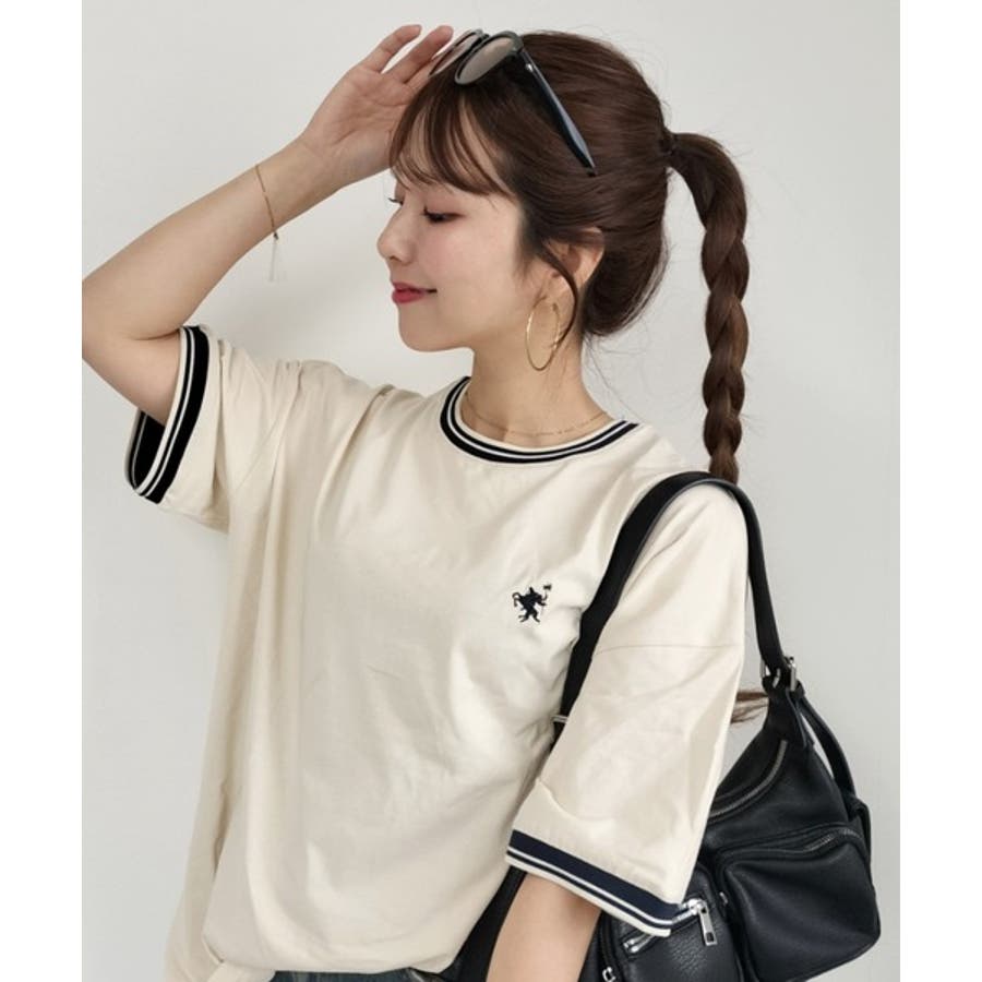 どこかレトロさを感じる襟・袖の配色がトレンド感あふれる刺繍半袖Tシャツ。