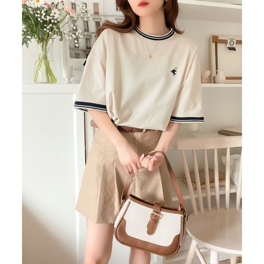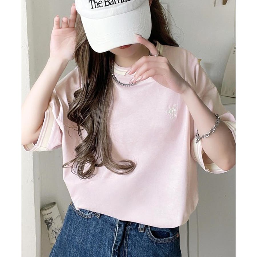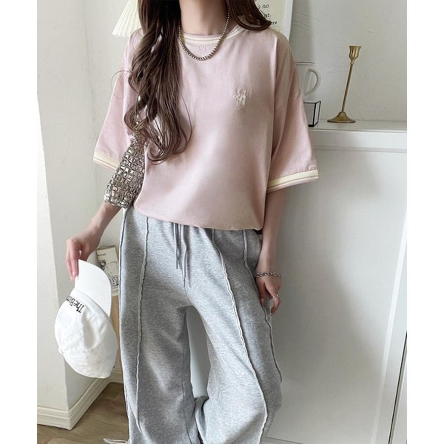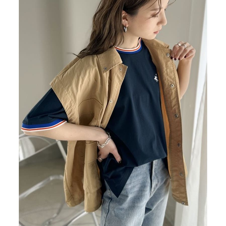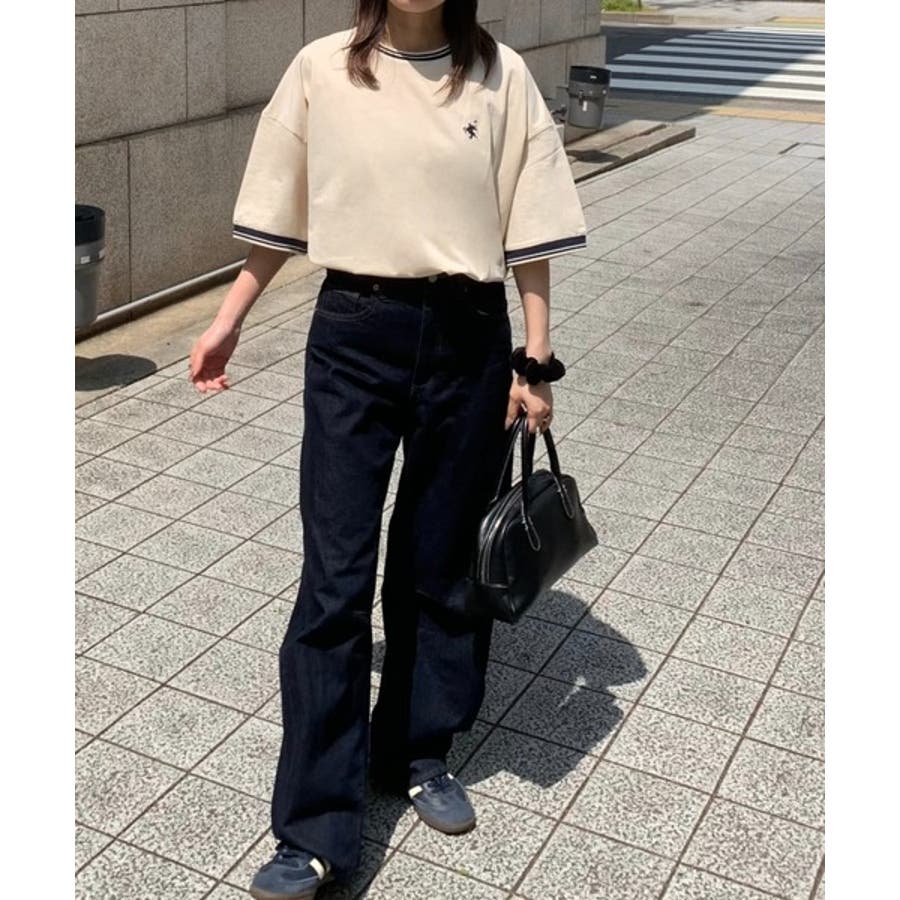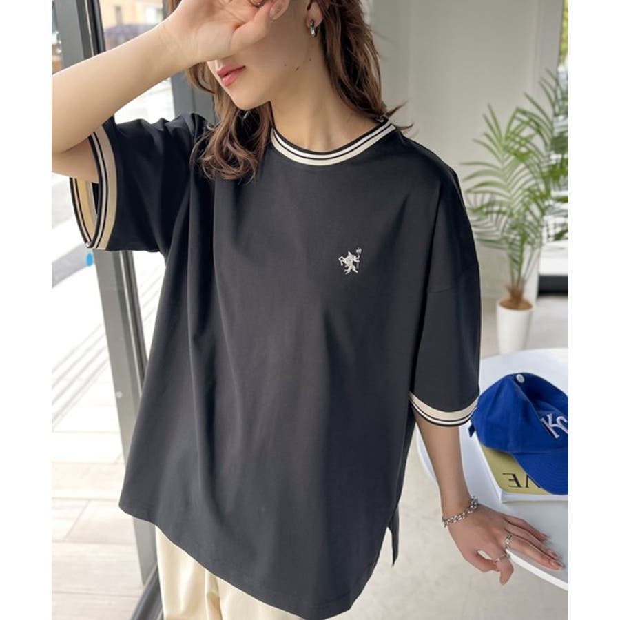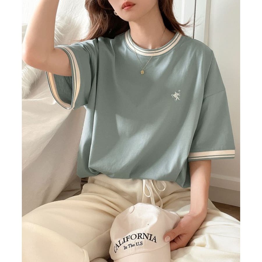 どこかレトロさを感じる襟・袖の配色がトレンド感あふれる刺繍半袖Tシャツ。