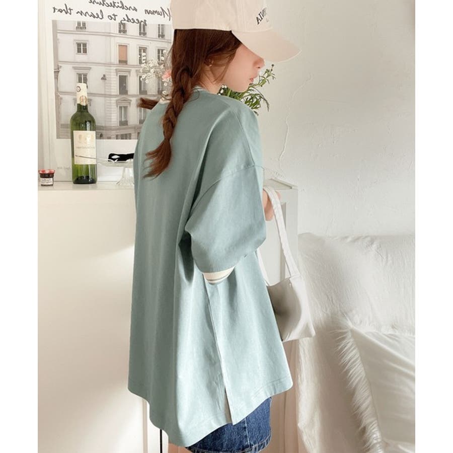 ゆったりとしたオーバーサイズと、サイドのスリットがポイントになったシンプルなデザイン、ツヤ感のある素材は1枚でも着映えします◎