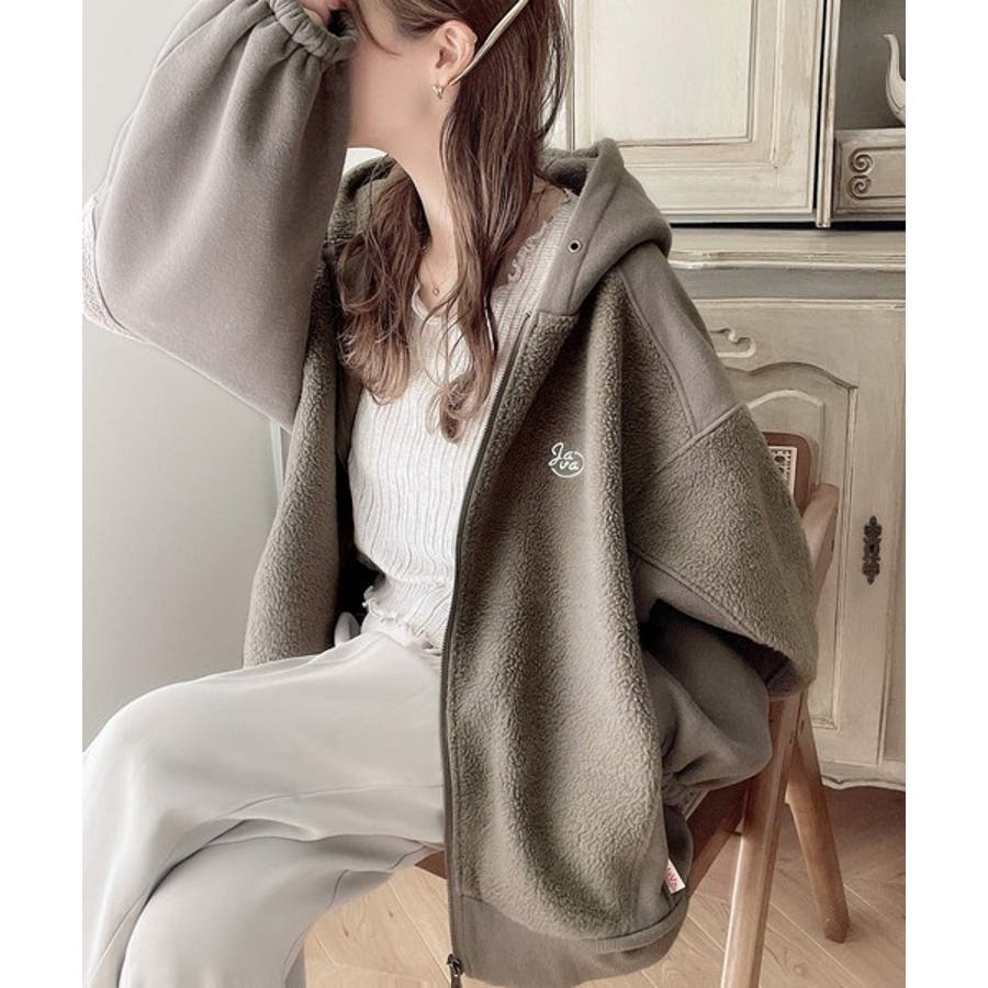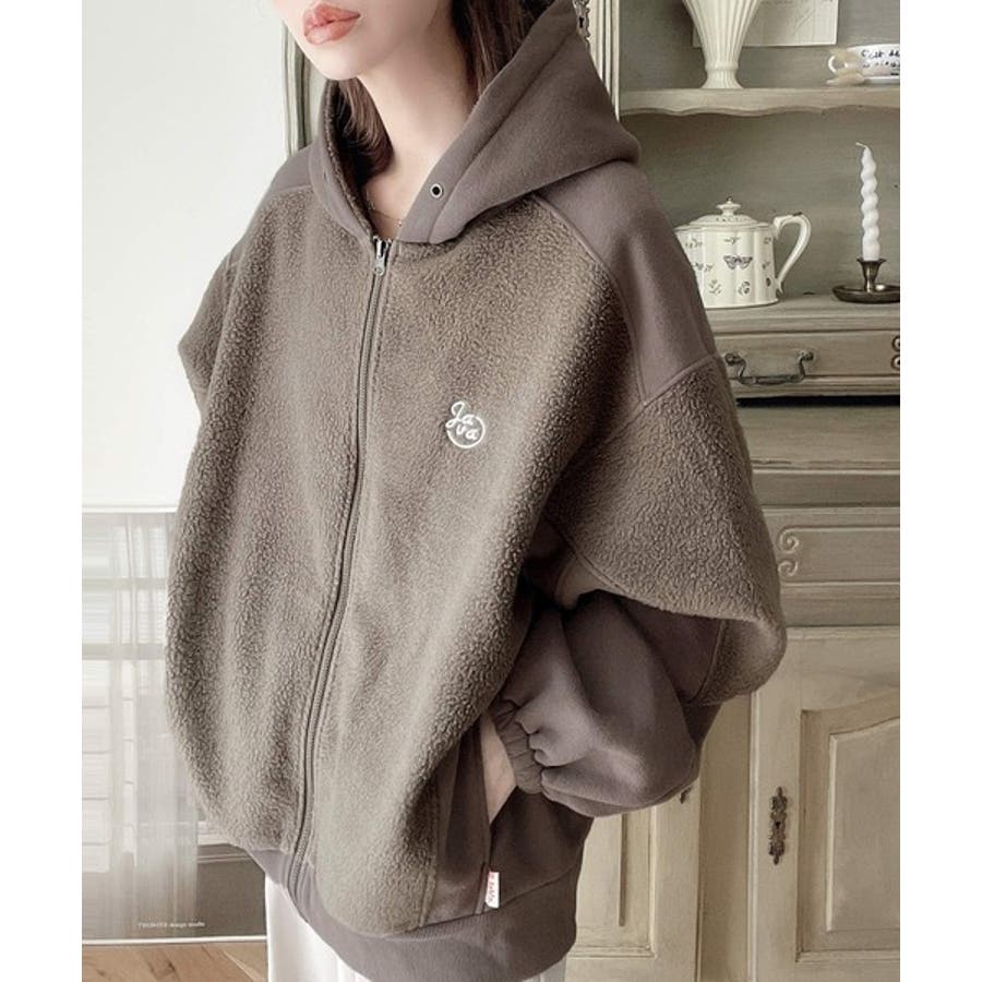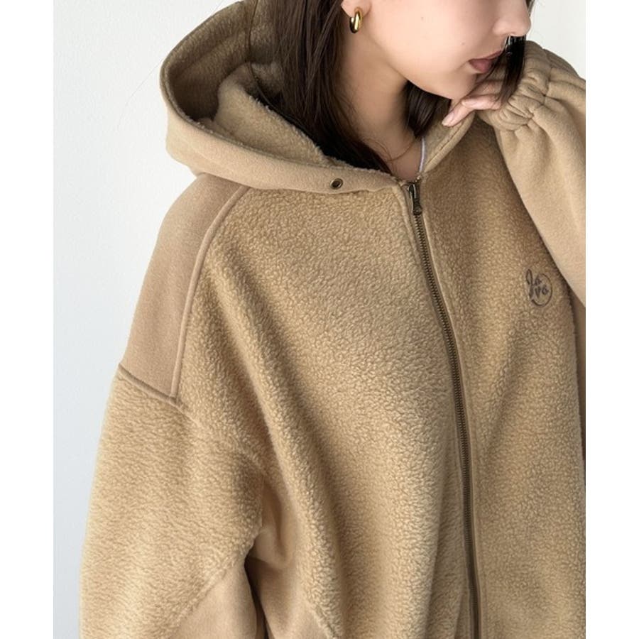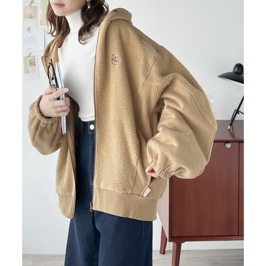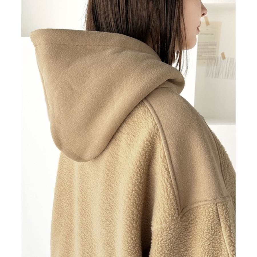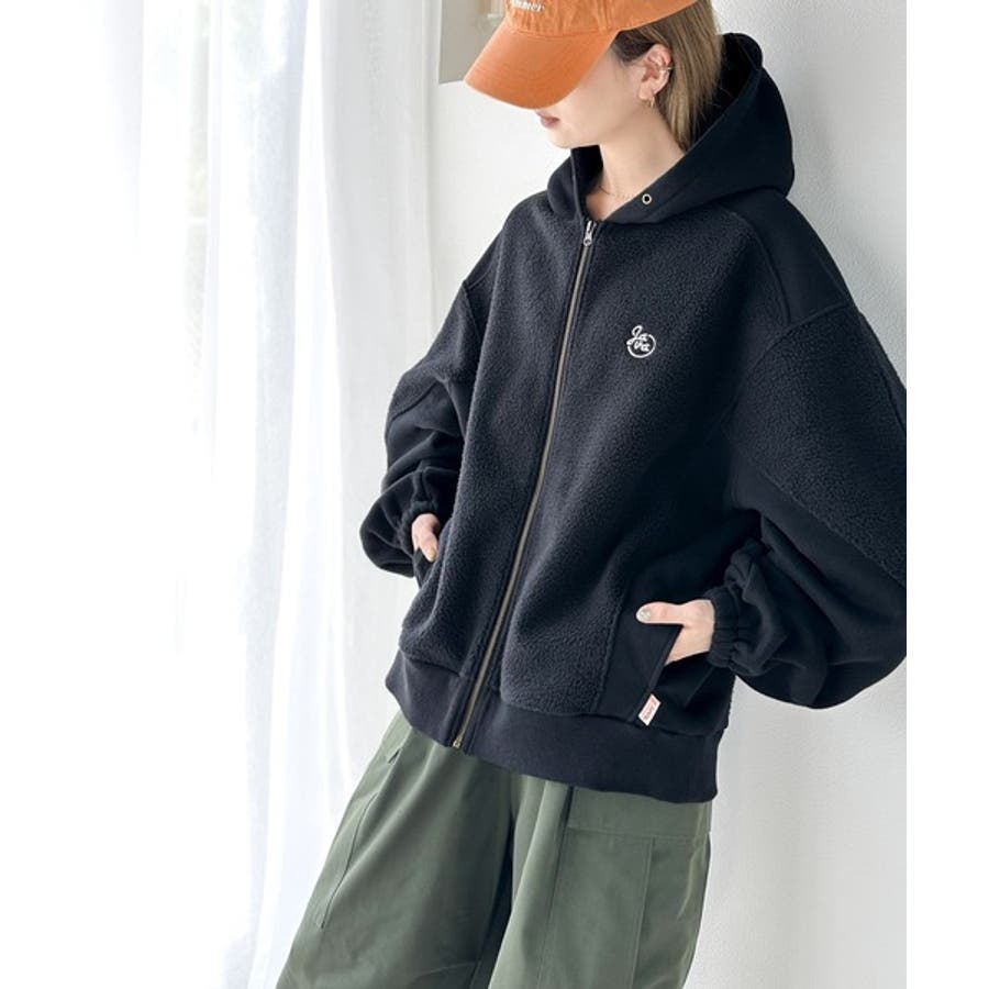 表と裏(ボア)で切り替えた異素材組み合わせのフードジップパーカー。
